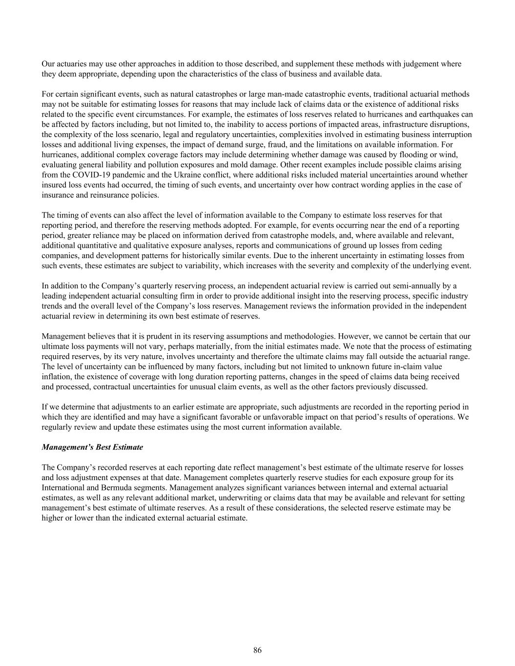 Our actuaries may use other approaches in addition to those described, and supplement these methods with judgement where they deem appropriate, depending upon the characteristics of the class of business and available data. For certain significant events, such as natural catastrophes or large man-made catastrophic events, traditional actuarial methods may not be suitable for estimating losses for reasons that may include lack of claims data or the existence of additional risks related to the specific event circumstances. For example, the estimates of loss reserves related to hurricanes and earthquakes can be affected by factors including, but not limited to, the inability to access portions of impacted areas, infrastructure disruptions, the complexity of the loss scenario, legal and regulatory uncertainties, complexities involved in estimating business interruption losses and additional living expenses, the impact of demand surge, fraud, and the limitations on available information. For hurricanes, additional complex coverage factors may include determining whether damage was caused by flooding or wind, evaluating general liability and pollution exposures and mold damage. Other recent examples include possible claims arising from the COVID-19 pandemic and the Ukraine conflict, where additional risks included material uncertainties around whether insured loss events had occurred, the timing of such events, and uncertainty over how contract wording applies in the case of insurance and reinsurance policies. The timing of events can also affect the level of information available to the Company to estimate loss reserves for that reporting period, and therefore the reserving methods adopted. For example, for events occurring near the end of a reporting period, greater reliance may be placed on information derived from catastrophe models, and, where available and relevant, additional quantitative and qualitative exposure analyses, reports and communications of ground up losses from ceding companies, and development patterns for historically similar events. Due to the inherent uncertainty in estimating losses from such events, these estimates are subject to variability, which increases with the severity and complexity of the underlying event. In addition to the Company’s quarterly reserving process, an independent actuarial review is carried out semi-annually by a leading independent actuarial consulting firm in order to provide additional insight into the reserving process, specific industry trends and the overall level of the Company’s loss reserves. Management reviews the information provided in the independent actuarial review in determining its own best estimate of reserves. Management believes that it is prudent in its reserving assumptions and methodologies. However, we cannot be certain that our ultimate loss payments will not vary, perhaps materially, from the initial estimates made. We note that the process of estimating required reserves, by its very nature, involves uncertainty and therefore the ultimate claims may fall outside the actuarial range. The level of uncertainty can be influenced by many factors, including but not limited to unknown future in-claim value inflation, the existence of coverage with long duration reporting patterns, changes in the speed of claims data being received and processed, contractual uncertainties for unusual claim events, as well as the other factors previously discussed. If we determine that adjustments to an earlier estimate are appropriate, such adjustments are recorded in the reporting period in which they are identified and may have a significant favorable or unfavorable impact on that period’s results of operations. We regularly review and update these estimates using the most current information available. Management’s Best Estimate The Company’s recorded reserves at each reporting date reflect management’s best estimate of the ultimate reserve for losses and loss adjustment expenses at that date. Management completes quarterly reserve studies for each exposure group for its International and Bermuda segments. Management analyzes significant variances between internal and external actuarial estimates, as well as any relevant additional market, underwriting or claims data that may be available and relevant for setting management’s best estimate of ultimate reserves. As a result of these considerations, the selected reserve estimate may be higher or lower than the indicated external actuarial estimate. 86