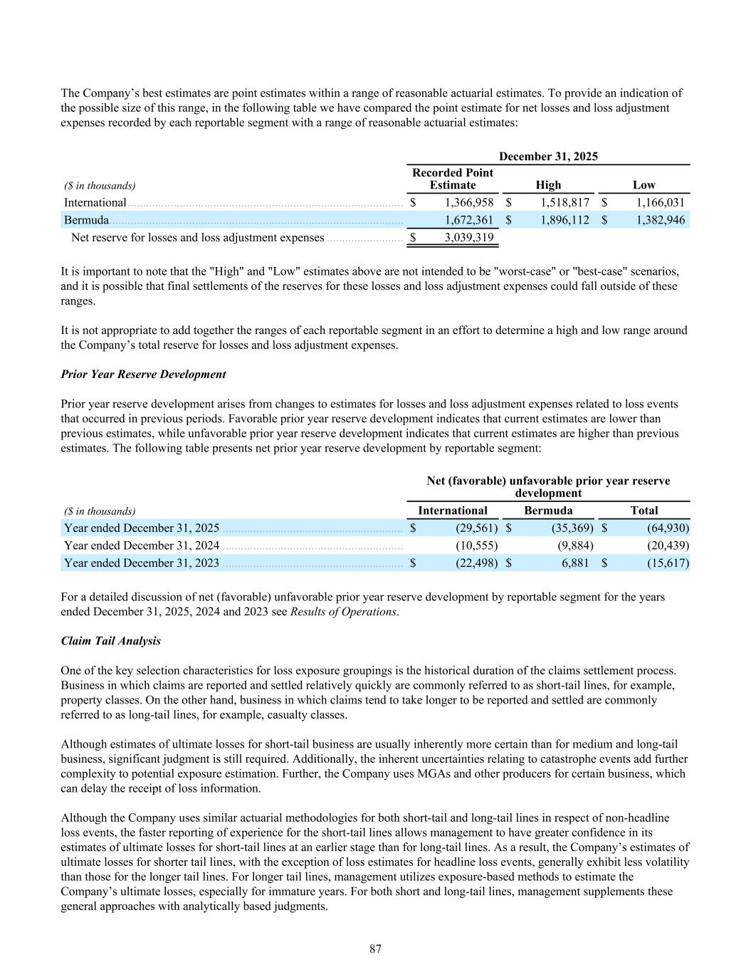 The Company’s best estimates are point estimates within a range of reasonable actuarial estimates. To provide an indication of the possible size of this range, in the following table we have compared the point estimate for net losses and loss adjustment expenses recorded by each reportable segment with a range of reasonable actuarial estimates: December 31, 2025 ($ in thousands) Recorded Point Estimate High Low International .......................................................................................... $ 1,366,958 $ 1,518,817 $ 1,166,031 Bermuda ................................................................................................ 1,672,361 $ 1,896,112 $ 1,382,946 Net reserve for losses and loss adjustment expenses ......................... $ 3,039,319 It is important to note that the "High" and "Low" estimates above are not intended to be "worst-case" or "best-case" scenarios, and it is possible that final settlements of the reserves for these losses and loss adjustment expenses could fall outside of these ranges. It is not appropriate to add together the ranges of each reportable segment in an effort to determine a high and low range around the Company’s total reserve for losses and loss adjustment expenses. Prior Year Reserve Development Prior year reserve development arises from changes to estimates for losses and loss adjustment expenses related to loss events that occurred in previous periods. Favorable prior year reserve development indicates that current estimates are lower than previous estimates, while unfavorable prior year reserve development indicates that current estimates are higher than previous estimates. The following table presents net prior year reserve development by reportable segment: Net (favorable) unfavorable prior year reserve development ($ in thousands) International Bermuda Total Year ended December 31, 2025 ........................................................... $ (29,561) $ (35,369) $ (64,930) Year ended December 31, 2024 ........................................................... (10,555) (9,884) (20,439) Year ended December 31, 2023 ........................................................... $ (22,498) $ 6,881 $ (15,617) For a detailed discussion of net (favorable) unfavorable prior year reserve development by reportable segment for the years ended December 31, 2025, 2024 and 2023 see Results of Operations. Claim Tail Analysis One of the key selection characteristics for loss exposure groupings is the historical duration of the claims settlement process. Business in which claims are reported and settled relatively quickly are commonly referred to as short-tail lines, for example, property classes. On the other hand, business in which claims tend to take longer to be reported and settled are commonly referred to as long-tail lines, for example, casualty classes. Although estimates of ultimate losses for short-tail business are usually inherently more certain than for medium and long-tail business, significant judgment is still required. Additionally, the inherent uncertainties relating to catastrophe events add further complexity to potential exposure estimation. Further, the Company uses MGAs and other producers for certain business, which can delay the receipt of loss information. Although the Company uses similar actuarial methodologies for both short-tail and long-tail lines in respect of non-headline loss events, the faster reporting of experience for the short-tail lines allows management to have greater confidence in its estimates of ultimate losses for short-tail lines at an earlier stage than for long-tail lines. As a result, the Company’s estimates of ultimate losses for shorter tail lines, with the exception of loss estimates for headline loss events, generally exhibit less volatility than those for the longer tail lines. For longer tail lines, management utilizes exposure-based methods to estimate the Company’s ultimate losses, especially for immature years. For both short and long-tail lines, management supplements these general approaches with analytically based judgments. 87