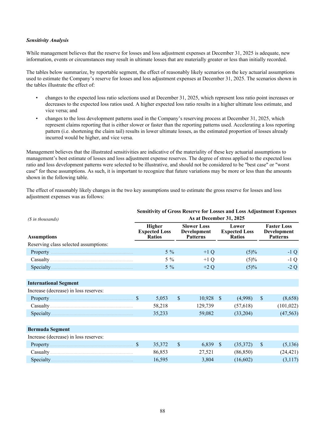 Sensitivity Analysis While management believes that the reserve for losses and loss adjustment expenses at December 31, 2025 is adequate, new information, events or circumstances may result in ultimate losses that are materially greater or less than initially recorded. The tables below summarize, by reportable segment, the effect of reasonably likely scenarios on the key actuarial assumptions used to estimate the Company’s reserve for losses and loss adjustment expenses at December 31, 2025. The scenarios shown in the tables illustrate the effect of: • changes to the expected loss ratio selections used at December 31, 2025, which represent loss ratio point increases or decreases to the expected loss ratios used. A higher expected loss ratio results in a higher ultimate loss estimate, and vice versa; and • changes to the loss development patterns used in the Company’s reserving process at December 31, 2025, which represent claims reporting that is either slower or faster than the reporting patterns used. Accelerating a loss reporting pattern (i.e. shortening the claim tail) results in lower ultimate losses, as the estimated proportion of losses already incurred would be higher, and vice versa. Management believes that the illustrated sensitivities are indicative of the materiality of these key actuarial assumptions to management’s best estimate of losses and loss adjustment expense reserves. The degree of stress applied to the expected loss ratio and loss development patterns were selected to be illustrative, and should not be considered to be "best case" or "worst case" for these assumptions. As such, it is important to recognize that future variations may be more or less than the amounts shown in the following table. The effect of reasonably likely changes in the two key assumptions used to estimate the gross reserve for losses and loss adjustment expenses was as follows: ($ in thousands) Sensitivity of Gross Reserve for Losses and Loss Adjustment Expenses As at December 31, 2025 Assumptions Higher Expected Loss Ratios Slower Loss Development Patterns Lower Expected Loss Ratios Faster Loss Development Patterns Reserving class selected assumptions: Property .............................................................. 5 % +1 Q (5) % -1 Q Casualty ............................................................... 5 % +1 Q (5) % -1 Q Specialty .............................................................. 5 % +2 Q (5) % -2 Q International Segment Increase (decrease) in loss reserves: Property ............................................................... $ 5,053 $ 10,928 $ (4,998) $ (8,658) Casualty ............................................................... 58,218 129,739 (57,618) (101,022) Specialty .............................................................. 35,233 59,082 (33,204) (47,563) Bermuda Segment Increase (decrease) in loss reserves: Property ............................................................... $ 35,372 $ 6,839 $ (35,372) $ (5,136) Casualty ............................................................... 86,853 27,521 (86,850) (24,421) Specialty .............................................................. 16,595 3,804 (16,602) (3,117) 88