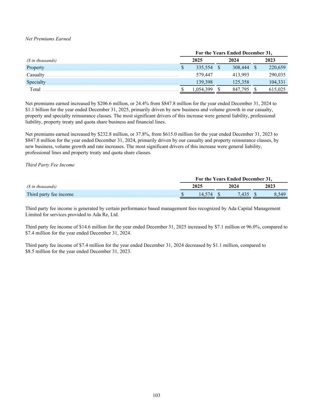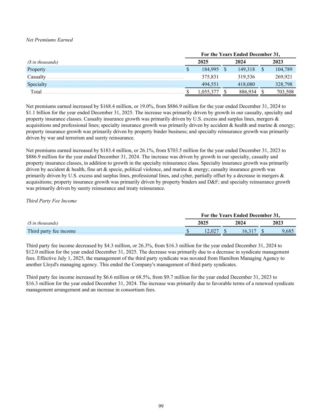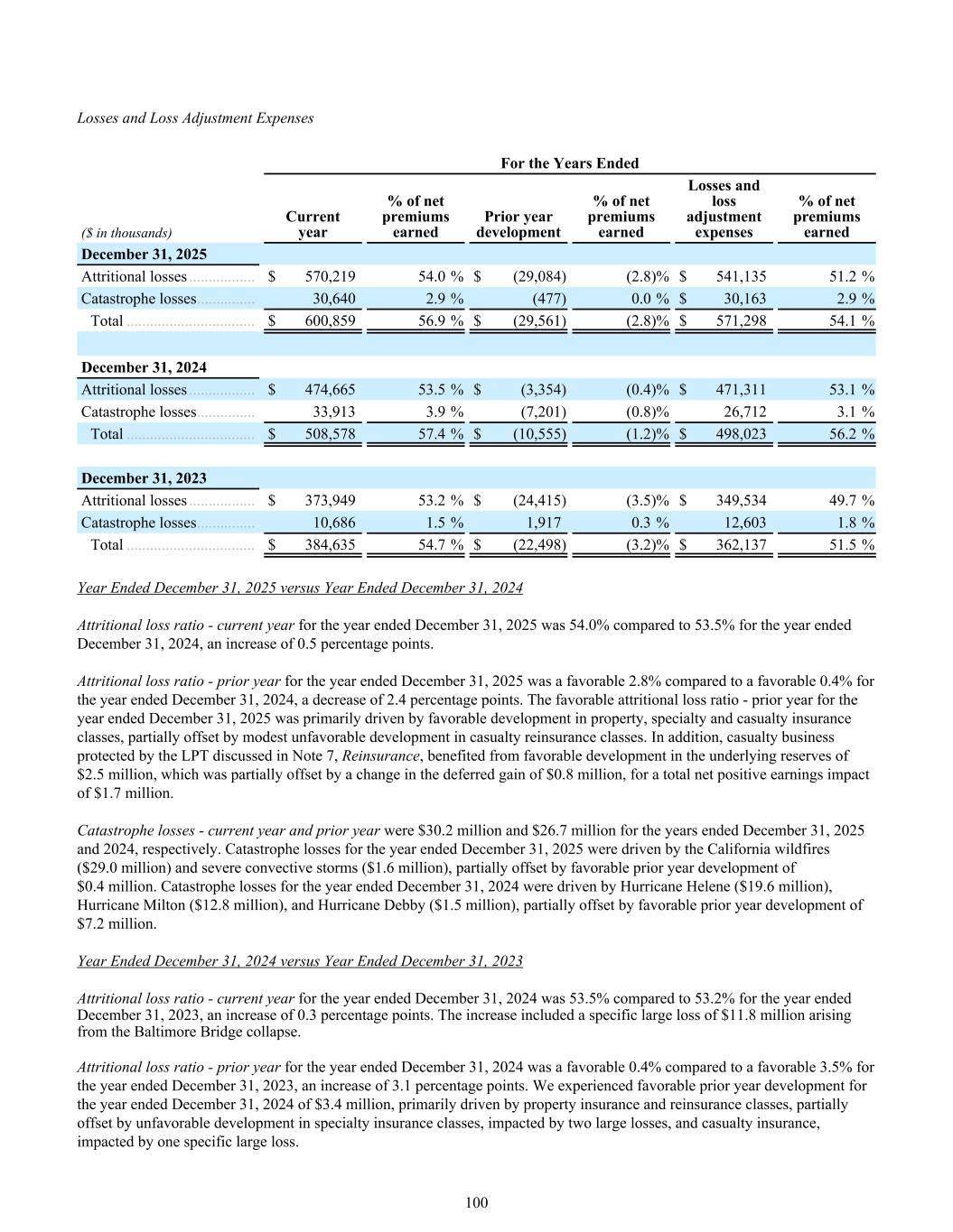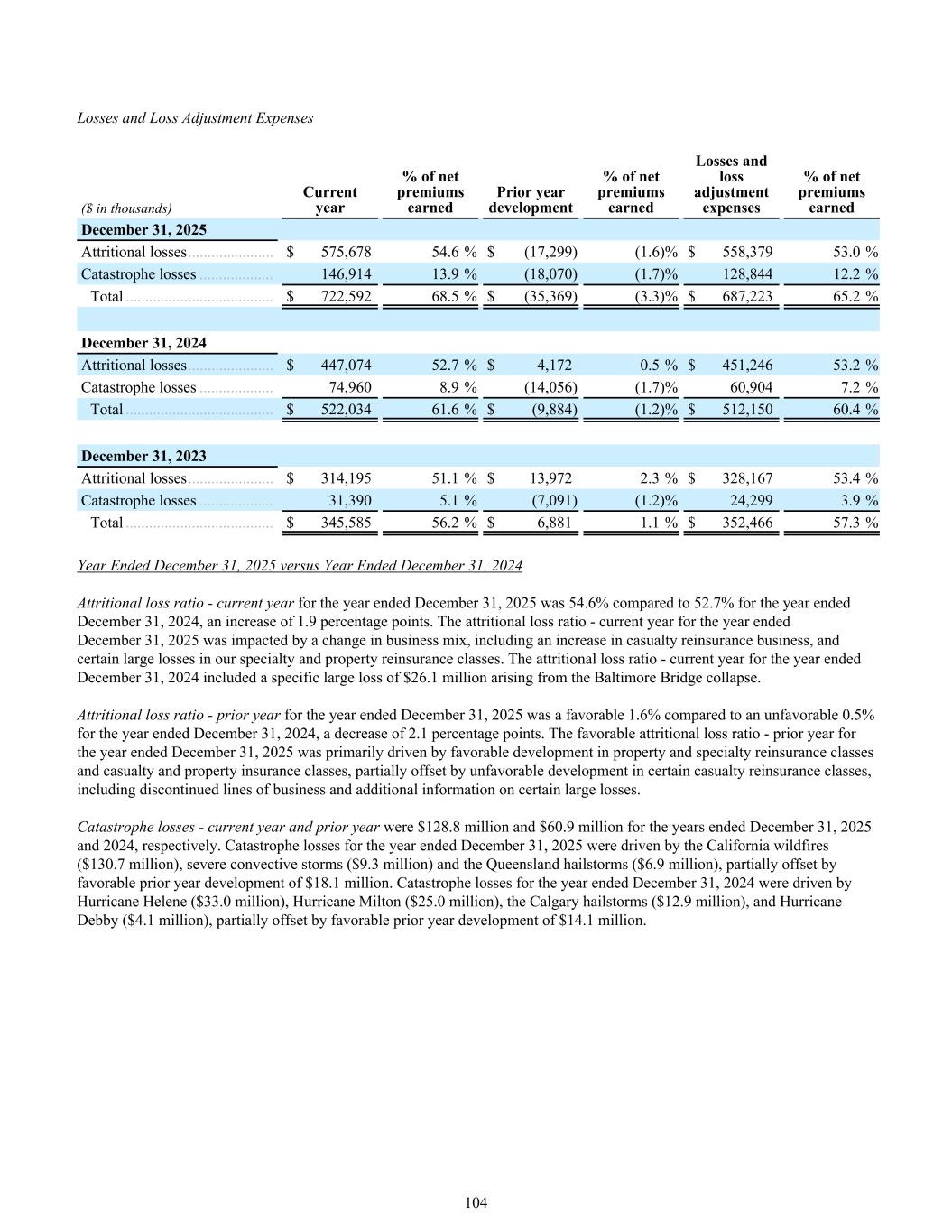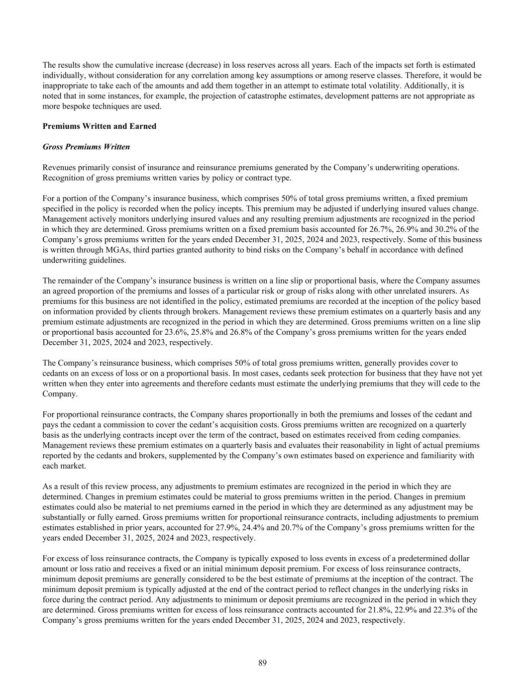 The results show the cumulative increase (decrease) in loss reserves across all years. Each of the impacts set forth is estimated individually, without consideration for any correlation among key assumptions or among reserve classes. Therefore, it would be inappropriate to take each of the amounts and add them together in an attempt to estimate total volatility. Additionally, it is noted that in some instances, for example, the projection of catastrophe estimates, development patterns are not appropriate as more bespoke techniques are used. Premiums Written and Earned Gross Premiums Written Revenues primarily consist of insurance and reinsurance premiums generated by the Company’s underwriting operations. Recognition of gross premiums written varies by policy or contract type. For a portion of the Company’s insurance business, which comprises 50% of total gross premiums written, a fixed premium specified in the policy is recorded when the policy incepts. This premium may be adjusted if underlying insured values change. Management actively monitors underlying insured values and any resulting premium adjustments are recognized in the period in which they are determined. Gross premiums written on a fixed premium basis accounted for 26.7%, 26.9% and 30.2% of the Company’s gross premiums written for the years ended December 31, 2025, 2024 and 2023, respectively. Some of this business is written through MGAs, third parties granted authority to bind risks on the Company’s behalf in accordance with defined underwriting guidelines. The remainder of the Company’s insurance business is written on a line slip or proportional basis, where the Company assumes an agreed proportion of the premiums and losses of a particular risk or group of risks along with other unrelated insurers. As premiums for this business are not identified in the policy, estimated premiums are recorded at the inception of the policy based on information provided by clients through brokers. Management reviews these premium estimates on a quarterly basis and any premium estimate adjustments are recognized in the period in which they are determined. Gross premiums written on a line slip or proportional basis accounted for 23.6%, 25.8% and 26.8% of the Company’s gross premiums written for the years ended December 31, 2025, 2024 and 2023, respectively. The Company’s reinsurance business, which comprises 50% of total gross premiums written, generally provides cover to cedants on an excess of loss or on a proportional basis. In most cases, cedants seek protection for business that they have not yet written when they enter into agreements and therefore cedants must estimate the underlying premiums that they will cede to the Company. For proportional reinsurance contracts, the Company shares proportionally in both the premiums and losses of the cedant and pays the cedant a commission to cover the cedant’s acquisition costs. Gross premiums written are recognized on a quarterly basis as the underlying contracts incept over the term of the contract, based on estimates received from ceding companies. Management reviews these premium estimates on a quarterly basis and evaluates their reasonability in light of actual premiums reported by the cedants and brokers, supplemented by the Company’s own estimates based on experience and familiarity with each market. As a result of this review process, any adjustments to premium estimates are recognized in the period in which they are determined. Changes in premium estimates could be material to gross premiums written in the period. Changes in premium estimates could also be material to net premiums earned in the period in which they are determined as any adjustment may be substantially or fully earned. Gross premiums written for proportional reinsurance contracts, including adjustments to premium estimates established in prior years, accounted for 27.9%, 24.4% and 20.7% of the Company’s gross premiums written for the years ended December 31, 2025, 2024 and 2023, respectively. For excess of loss reinsurance contracts, the Company is typically exposed to loss events in excess of a predetermined dollar amount or loss ratio and receives a fixed or an initial minimum deposit premium. For excess of loss reinsurance contracts, minimum deposit premiums are generally considered to be the best estimate of premiums at the inception of the contract. The minimum deposit premium is typically adjusted at the end of the contract period to reflect changes in the underlying risks in force during the contract period. Any adjustments to minimum or deposit premiums are recognized in the period in which they are determined. Gross premiums written for excess of loss reinsurance contracts accounted for 21.8%, 22.9% and 22.3% of the Company’s gross premiums written for the years ended December 31, 2025, 2024 and 2023, respectively. 89