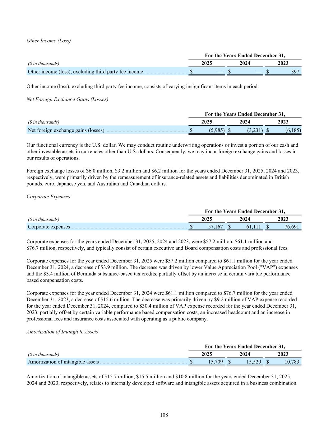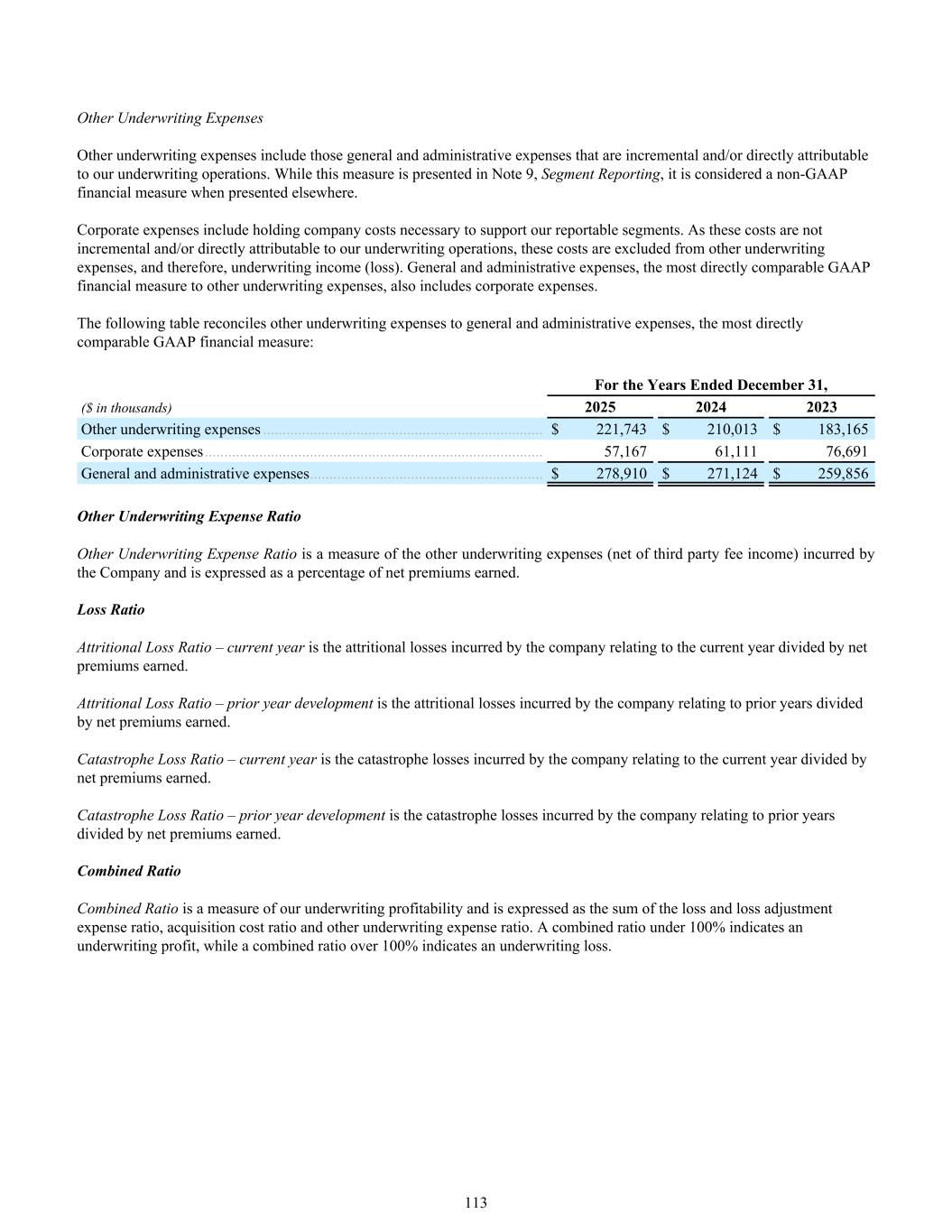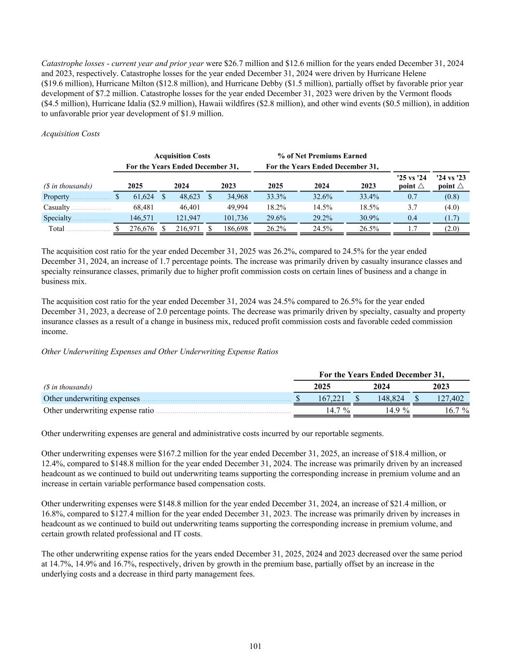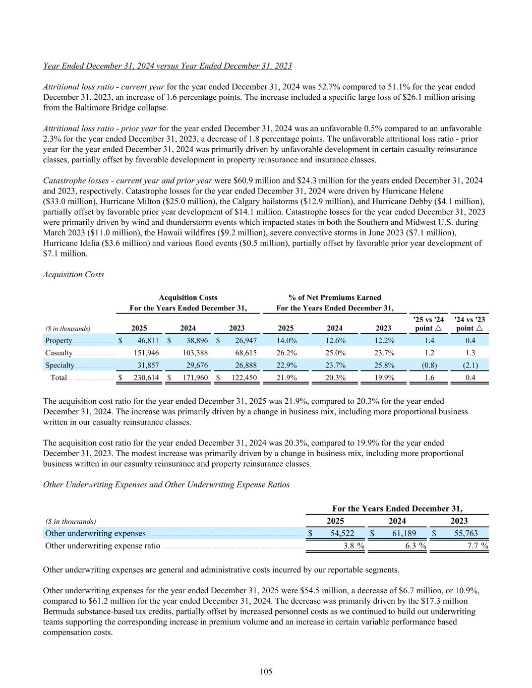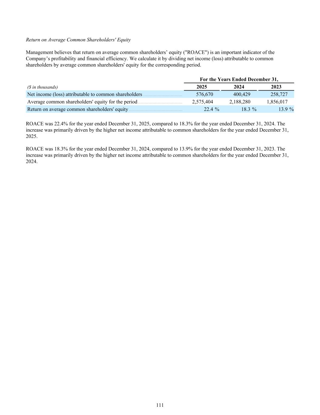 The results show the cumulative increase (decrease) in loss reserves across all years. Each of the impacts set forth is estimated individually, without consideration for any correlation among key assumptions or among reserve classes. Therefore, it would be inappropriate to take each of the amounts and add them together in an attempt to estimate total volatility. Additionally, it is noted that in some instances, for example, the projection of catastrophe estimates, development patterns are not appropriate as more bespoke techniques are used. Premiums Written and Earned Gross Premiums Written Revenues primarily consist of insurance and reinsurance premiums generated by the Company’s underwriting operations. Recognition of gross premiums written varies by policy or contract type. For a portion of the Company’s insurance business, which comprises 50% of total gross premiums written, a fixed premium specified in the policy is recorded when the policy incepts. This premium may be adjusted if underlying insured values change. Management actively monitors underlying insured values and any resulting premium adjustments are recognized in the period in which they are determined. Gross premiums written on a fixed premium basis accounted for 26.7%, 26.9% and 30.2% of the Company’s gross premiums written for the years ended December 31, 2025, 2024 and 2023, respectively. Some of this business is written through MGAs, third parties granted authority to bind risks on the Company’s behalf in accordance with defined underwriting guidelines. The remainder of the Company’s insurance business is written on a line slip or proportional basis, where the Company assumes an agreed proportion of the premiums and losses of a particular risk or group of risks along with other unrelated insurers. As premiums for this business are not identified in the policy, estimated premiums are recorded at the inception of the policy based on information provided by clients through brokers. Management reviews these premium estimates on a quarterly basis and any premium estimate adjustments are recognized in the period in which they are determined. Gross premiums written on a line slip or proportional basis accounted for 23.6%, 25.8% and 26.8% of the Company’s gross premiums written for the years ended December 31, 2025, 2024 and 2023, respectively. The Company’s reinsurance business, which comprises 50% of total gross premiums written, generally provides cover to cedants on an excess of loss or on a proportional basis. In most cases, cedants seek protection for business that they have not yet written when they enter into agreements and therefore cedants must estimate the underlying premiums that they will cede to the Company. For proportional reinsurance contracts, the Company shares proportionally in both the premiums and losses of the cedant and pays the cedant a commission to cover the cedant’s acquisition costs. Gross premiums written are recognized on a quarterly basis as the underlying contracts incept over the term of the contract, based on estimates received from ceding companies. Management reviews these premium estimates on a quarterly basis and evaluates their reasonability in light of actual premiums reported by the cedants and brokers, supplemented by the Company’s own estimates based on experience and familiarity with each market. As a result of this review process, any adjustments to premium estimates are recognized in the period in which they are determined. Changes in premium estimates could be material to gross premiums written in the period. Changes in premium estimates could also be material to net premiums earned in the period in which they are determined as any adjustment may be substantially or fully earned. Gross premiums written for proportional reinsurance contracts, including adjustments to premium estimates established in prior years, accounted for 27.9%, 24.4% and 20.7% of the Company’s gross premiums written for the years ended December 31, 2025, 2024 and 2023, respectively. For excess of loss reinsurance contracts, the Company is typically exposed to loss events in excess of a predetermined dollar amount or loss ratio and receives a fixed or an initial minimum deposit premium. For excess of loss reinsurance contracts, minimum deposit premiums are generally considered to be the best estimate of premiums at the inception of the contract. The minimum deposit premium is typically adjusted at the end of the contract period to reflect changes in the underlying risks in force during the contract period. Any adjustments to minimum or deposit premiums are recognized in the period in which they are determined. Gross premiums written for excess of loss reinsurance contracts accounted for 21.8%, 22.9% and 22.3% of the Company’s gross premiums written for the years ended December 31, 2025, 2024 and 2023, respectively. 89