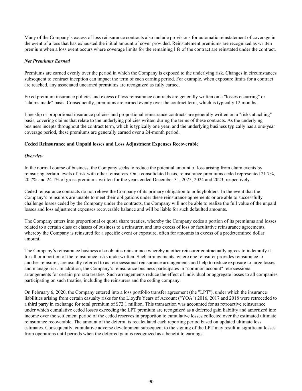 Many of the Company’s excess of loss reinsurance contracts also include provisions for automatic reinstatement of coverage in the event of a loss that has exhausted the initial amount of cover provided. Reinstatement premiums are recognized as written premium when a loss event occurs where coverage limits for the remaining life of the contract are reinstated under the contract. Net Premiums Earned Premiums are earned evenly over the period in which the Company is exposed to the underlying risk. Changes in circumstances subsequent to contract inception can impact the term of each earning period. For example, when exposure limits for a contract are reached, any associated unearned premiums are recognized as fully earned. Fixed premium insurance policies and excess of loss reinsurance contracts are generally written on a "losses occurring" or "claims made" basis. Consequently, premiums are earned evenly over the contract term, which is typically 12 months. Line slip or proportional insurance policies and proportional reinsurance contracts are generally written on a "risks attaching" basis, covering claims that relate to the underlying policies written during the terms of these contracts. As the underlying business incepts throughout the contract term, which is typically one year, and the underlying business typically has a one-year coverage period, these premiums are generally earned over a 24-month period. Ceded Reinsurance and Unpaid losses and Loss Adjustment Expenses Recoverable Overview In the normal course of business, the Company seeks to reduce the potential amount of loss arising from claim events by reinsuring certain levels of risk with other reinsurers. On a consolidated basis, reinsurance premiums ceded represented 21.7%, 20.7% and 24.1% of gross premiums written for the years ended December 31, 2025, 2024 and 2023, respectively. Ceded reinsurance contracts do not relieve the Company of its primary obligation to policyholders. In the event that the Company’s reinsurers are unable to meet their obligations under these reinsurance agreements or are able to successfully challenge losses ceded by the Company under the contracts, the Company will not be able to realize the full value of the unpaid losses and loss adjustment expenses recoverable balance and will be liable for such defaulted amounts. The Company enters into proportional or quota share treaties, whereby the Company cedes a portion of its premiums and losses related to a certain class or classes of business to a reinsurer, and into excess of loss or facultative reinsurance agreements, whereby the Company is reinsured for a specific event or exposure, often for amounts in excess of a predetermined dollar amount. The Company’s reinsurance business also obtains reinsurance whereby another reinsurer contractually agrees to indemnify it for all or a portion of the reinsurance risks underwritten. Such arrangements, where one reinsurer provides reinsurance to another reinsurer, are usually referred to as retrocessional reinsurance arrangements and help to reduce exposure to large losses and manage risk. In addition, the Company’s reinsurance business participates in "common account" retrocessional arrangements for certain pro rata treaties. Such arrangements reduce the effect of individual or aggregate losses to all companies participating on such treaties, including the reinsurers and the ceding company. On February 6, 2020, the Company entered into a loss portfolio transfer agreement (the "LPT"), under which the insurance liabilities arising from certain casualty risks for the Lloyd's Years of Account ("YOA") 2016, 2017 and 2018 were retroceded to a third party in exchange for total premium of $72.1 million. This transaction was accounted for as retroactive reinsurance under which cumulative ceded losses exceeding the LPT premium are recognized as a deferred gain liability and amortized into income over the settlement period of the ceded reserves in proportion to cumulative losses collected over the estimated ultimate reinsurance recoverable. The amount of the deferral is recalculated each reporting period based on updated ultimate loss estimates. Consequently, cumulative adverse development subsequent to the signing of the LPT may result in significant losses from operations until periods when the deferred gain is recognized as a benefit to earnings. 90
