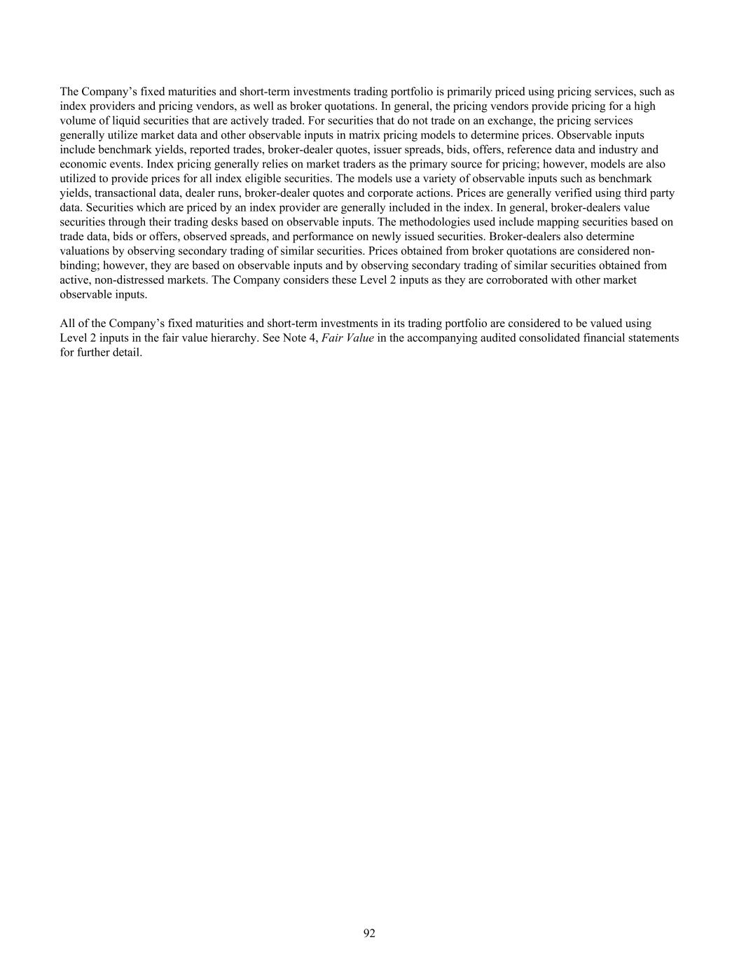 The Company’s fixed maturities and short-term investments trading portfolio is primarily priced using pricing services, such as index providers and pricing vendors, as well as broker quotations. In general, the pricing vendors provide pricing for a high volume of liquid securities that are actively traded. For securities that do not trade on an exchange, the pricing services generally utilize market data and other observable inputs in matrix pricing models to determine prices. Observable inputs include benchmark yields, reported trades, broker-dealer quotes, issuer spreads, bids, offers, reference data and industry and economic events. Index pricing generally relies on market traders as the primary source for pricing; however, models are also utilized to provide prices for all index eligible securities. The models use a variety of observable inputs such as benchmark yields, transactional data, dealer runs, broker-dealer quotes and corporate actions. Prices are generally verified using third party data. Securities which are priced by an index provider are generally included in the index. In general, broker-dealers value securities through their trading desks based on observable inputs. The methodologies used include mapping securities based on trade data, bids or offers, observed spreads, and performance on newly issued securities. Broker-dealers also determine valuations by observing secondary trading of similar securities. Prices obtained from broker quotations are considered non- binding; however, they are based on observable inputs and by observing secondary trading of similar securities obtained from active, non-distressed markets. The Company considers these Level 2 inputs as they are corroborated with other market observable inputs. All of the Company’s fixed maturities and short-term investments in its trading portfolio are considered to be valued using Level 2 inputs in the fair value hierarchy. See Note 4, Fair Value in the accompanying audited consolidated financial statements for further detail. 92