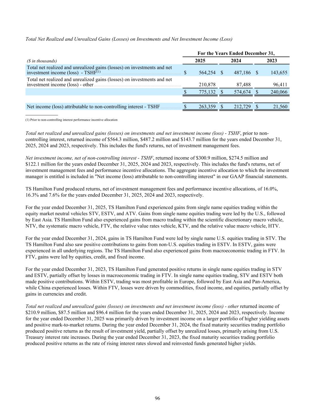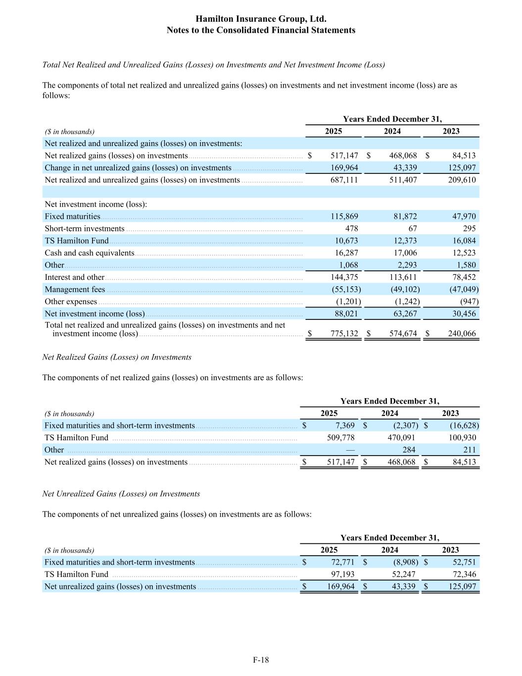 Total Net Realized and Unrealized Gains (Losses) on Investments and Net Investment Income (Loss) The components of total net realized and unrealized gains (losses) on investments and net investment income (loss) are as follows: Years Ended December 31, ($ in thousands) 2025 2024 2023 Net realized and unrealized gains (losses) on investments: Net realized gains (losses) on investments ...................................................... $ 517,147 $ 468,068 $ 84,513 Change in net unrealized gains (losses) on investments ................................. 169,964 43,339 125,097 Net realized and unrealized gains (losses) on investments ............................. 687,111 511,407 209,610 Net investment income (loss): Fixed maturities ............................................................................................... 115,869 81,872 47,970 Short-term investments ................................................................................... 478 67 295 TS Hamilton Fund ........................................................................................... 10,673 12,373 16,084 Cash and cash equivalents ............................................................................... 16,287 17,006 12,523 Other ................................................................................................................ 1,068 2,293 1,580 Interest and other ............................................................................................. 144,375 113,611 78,452 Management fees ............................................................................................ (55,153) (49,102) (47,049) Other expenses ................................................................................................ (1,201) (1,242) (947) Net investment income (loss) .......................................................................... 88,021 63,267 30,456 Total net realized and unrealized gains (losses) on investments and net investment income (loss) ............................................................................. $ 775,132 $ 574,674 $ 240,066 Net Realized Gains (Losses) on Investments The components of net realized gains (losses) on investments are as follows: Years Ended December 31, ($ in thousands) 2025 2024 2023 Fixed maturities and short-term investments ................................................ $ 7,369 $ (2,307) $ (16,628) TS Hamilton Fund ....................................................................................... 509,778 470,091 100,930 Other ............................................................................................................ — 284 211 Net realized gains (losses) on investments ................................................... $ 517,147 $ 468,068 $ 84,513 Net Unrealized Gains (Losses) on Investments The components of net unrealized gains (losses) on investments are as follows: Years Ended December 31, ($ in thousands) 2025 2024 2023 Fixed maturities and short-term investments ................................................ $ 72,771 $ (8,908) $ 52,751 TS Hamilton Fund ....................................................................................... 97,193 52,247 72,346 Net unrealized gains (losses) on investments ............................................... $ 169,964 $ 43,339 $ 125,097 Hamilton Insurance Group, Ltd. Notes to the Consolidated Financial Statements F-18