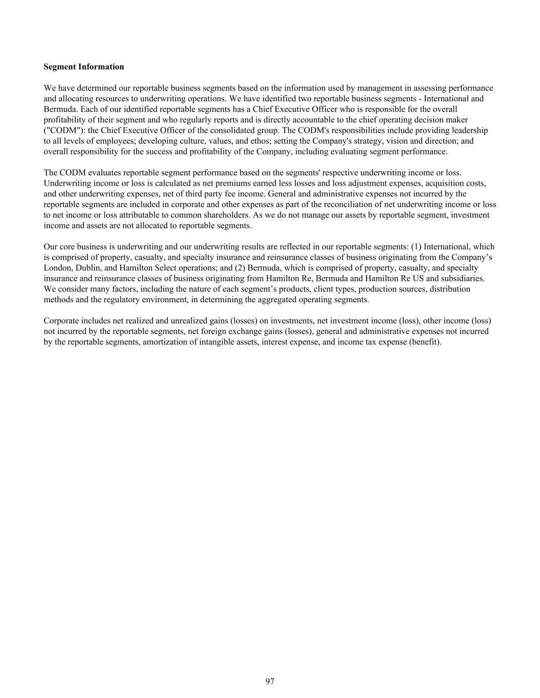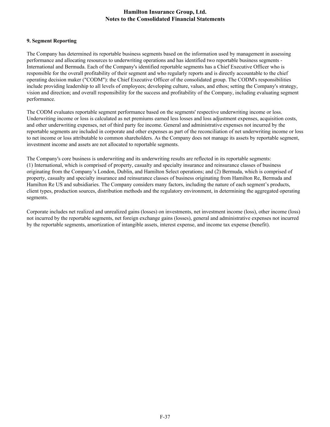 9. Segment Reporting The Company has determined its reportable business segments based on the information used by management in assessing performance and allocating resources to underwriting operations and has identified two reportable business segments - International and Bermuda. Each of the Company's identified reportable segments has a Chief Executive Officer who is responsible for the overall profitability of their segment and who regularly reports and is directly accountable to the chief operating decision maker ("CODM"): the Chief Executive Officer of the consolidated group. The CODM's responsibilities include providing leadership to all levels of employees; developing culture, values, and ethos; setting the Company's strategy, vision and direction; and overall responsibility for the success and profitability of the Company, including evaluating segment performance. The CODM evaluates reportable segment performance based on the segments' respective underwriting income or loss. Underwriting income or loss is calculated as net premiums earned less losses and loss adjustment expenses, acquisition costs, and other underwriting expenses, net of third party fee income. General and administrative expenses not incurred by the reportable segments are included in corporate and other expenses as part of the reconciliation of net underwriting income or loss to net income or loss attributable to common shareholders. As the Company does not manage its assets by reportable segment, investment income and assets are not allocated to reportable segments. The Company's core business is underwriting and its underwriting results are reflected in its reportable segments: (1) International, which is comprised of property, casualty and specialty insurance and reinsurance classes of business originating from the Company’s London, Dublin, and Hamilton Select operations; and (2) Bermuda, which is comprised of property, casualty and specialty insurance and reinsurance classes of business originating from Hamilton Re, Bermuda and Hamilton Re US and subsidiaries. The Company considers many factors, including the nature of each segment’s products, client types, production sources, distribution methods and the regulatory environment, in determining the aggregated operating segments. Corporate includes net realized and unrealized gains (losses) on investments, net investment income (loss), other income (loss) not incurred by the reportable segments, net foreign exchange gains (losses), general and administrative expenses not incurred by the reportable segments, amortization of intangible assets, interest expense, and income tax expense (benefit). Hamilton Insurance Group, Ltd. Notes to the Consolidated Financial Statements F-37