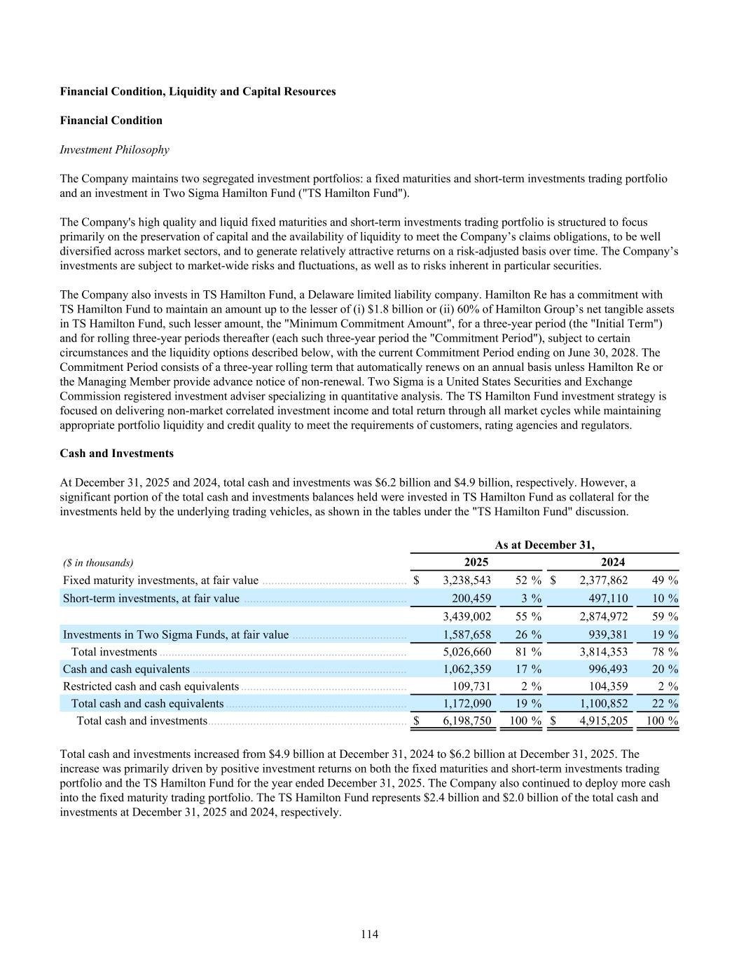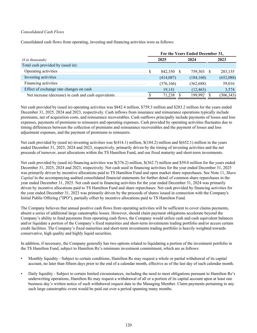 Consolidated Cash Flows Consolidated cash flows from operating, investing and financing activities were as follows: For the Years Ended December 31, ($ in thousands) 2025 2024 2023 Total cash provided by (used in): Operating activities ..................................................................................... $ 842,350 $ 759,303 $ 283,155 Investing activities ...................................................................................... (414,087) (184,160) (652,088) Financing activities..................................................................................... (376,166) (362,688) 59,016 Effect of exchange rate changes on cash .................................................... 19,141 (12,463) 3,574 Net increase (decrease) in cash and cash equivalents .............................. $ 71,238 $ 199,992 $ (306,343) Net cash provided by (used in) operating activities was $842.4 million, $759.3 million and $283.2 million for the years ended December 31, 2025, 2024 and 2023, respectively. Cash inflows from insurance and reinsurance operations typically include premiums, net of acquisition costs, and reinsurance recoverables. Cash outflows principally include payments of losses and loss expenses, payments of premiums to reinsurers and operating expenses. Cash provided by operating activities fluctuates due to timing differences between the collection of premiums and reinsurance recoverables and the payment of losses and loss adjustment expenses, and the payment of premiums to reinsurers. Net cash provided by (used in) investing activities was $(414.1) million, $(184.2) million and $(652.1) million in the years ended December 31, 2025, 2024 and 2023, respectively, primarily driven by the timing of investing activities and the net proceeds of turnover, asset allocations within the TS Hamilton Fund, and our fixed maturity and short-term investments. Net cash provided by (used in) financing activities was $(376.2) million, $(362.7) million and $59.0 million for the years ended December 31, 2025, 2024 and 2023, respectively. Net cash used in financing activities for the year ended December 31, 2025 was primarily driven by incentive allocations paid to TS Hamilton Fund and open market share repurchases. See Note 11, Share Capital in the accompanying audited consolidated financial statements for further detail of common share repurchases in the year ended December 31, 2025. Net cash used in financing activities for the year ended December 31, 2024 was primarily driven by incentive allocations paid to TS Hamilton Fund and share repurchases. Net cash provided by financing activities for the year ended December 31, 2023 was primarily driven by the proceeds of shares issued in connection with the Company's Initial Public Offering ("IPO"), partially offset by incentive allocations paid to TS Hamilton Fund. The Company believes that annual positive cash flows from operating activities will be sufficient to cover claims payments, absent a series of additional large catastrophic losses. However, should claim payment obligations accelerate beyond the Company’s ability to fund payments from operating cash flows, the Company would utilize cash and cash equivalent balances and/or liquidate a portion of the Company’s fixed maturities and short-term investments trading portfolio and/or access certain credit facilities. The Company’s fixed maturities and short-term investments trading portfolio is heavily weighted towards conservative, high quality and highly liquid securities. In addition, if necessary, the Company generally has two options related to liquidating a portion of the investment portfolio in the TS Hamilton Fund, subject to Hamilton Re’s minimum investment commitment, which are as follows: • Monthly liquidity - Subject to certain conditions, Hamilton Re may request a whole or partial withdrawal of its capital account, no later than fifteen days prior to the end of a calendar month, effective as of the last day of such calendar month. • Daily liquidity - Subject to certain limited circumstances, including the need to meet obligations pursuant to Hamilton Re’s underwriting operations, Hamilton Re may request a withdrawal of all or a portion of its capital account upon at least one business day’s written notice of such withdrawal request date to the Managing Member. Claim payments pertaining to any such large catastrophic event would be paid out over a period spanning many months. 120