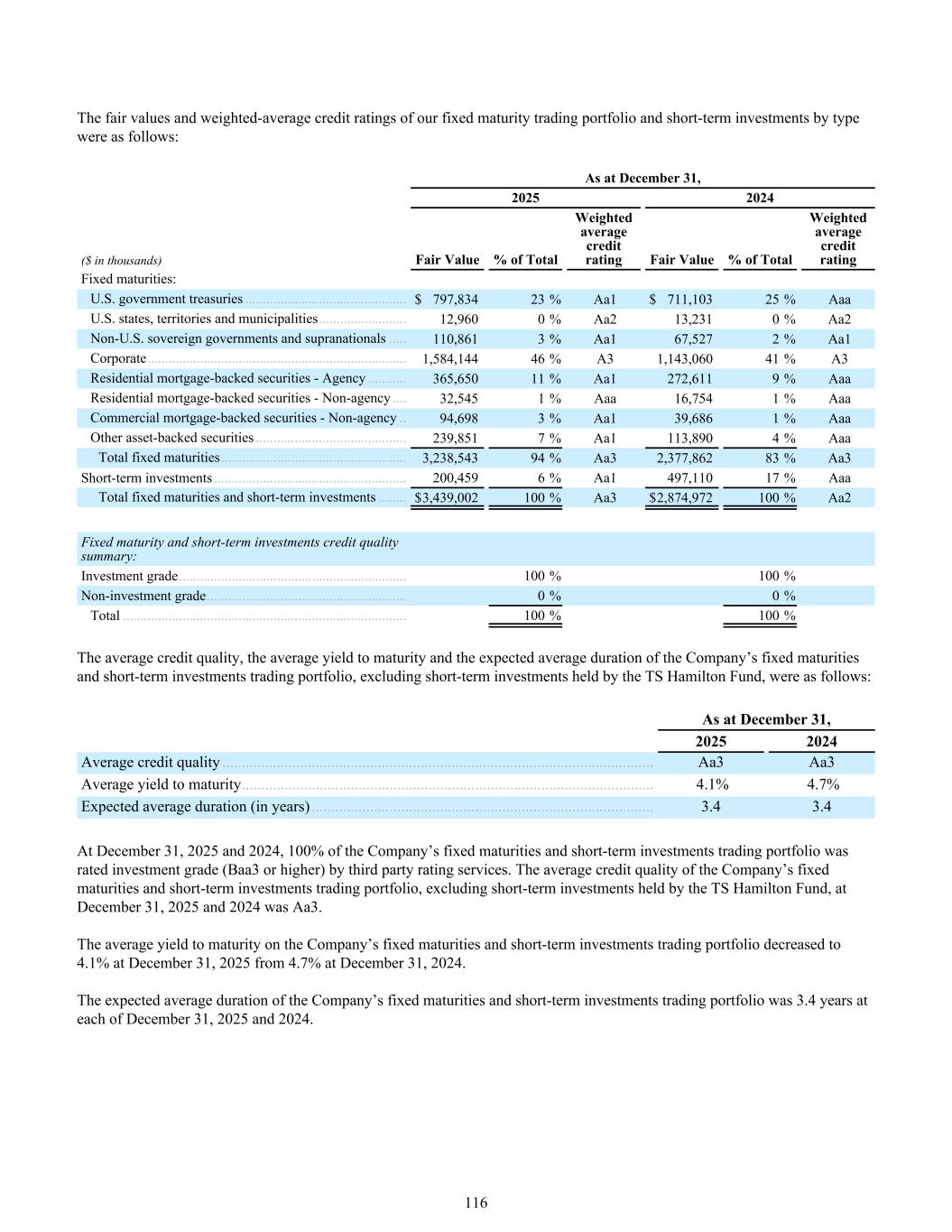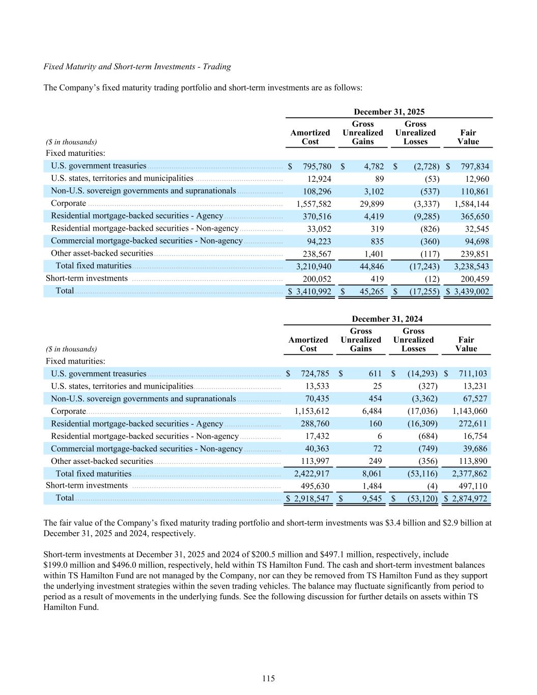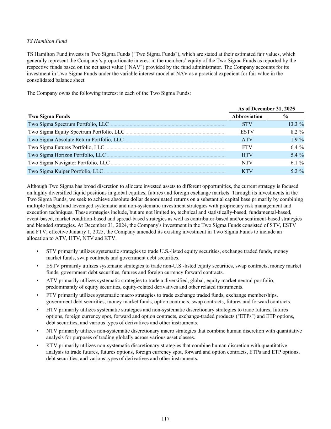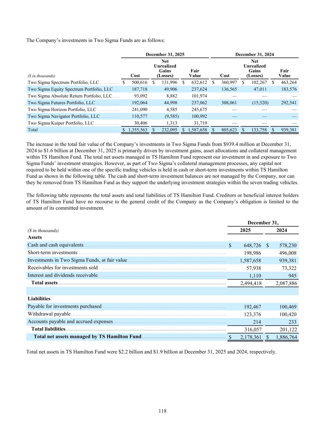 The Company’s investments in Two Sigma Funds are as follows: December 31, 2025 December 31, 2024 ($ in thousands) Cost Net Unrealized Gains (Losses) Fair Value Cost Net Unrealized Gains (Losses) Fair Value Two Sigma Spectrum Portfolio, LLC ................. $ 500,616 $ 131,996 $ 632,612 $ 360,997 $ 102,267 $ 463,264 Two Sigma Equity Spectrum Portfolio, LLC ..... 187,718 49,906 237,624 136,565 47,011 183,576 Two Sigma Absolute Return Portfolio, LLC ...... 93,092 8,882 101,974 — — — Two Sigma Futures Portfolio, LLC .................... 192,064 44,998 237,062 308,061 (15,520) 292,541 Two Sigma Horizon Portfolio, LLC ................... 241,090 4,585 245,675 — — — Two Sigma Navigator Portfolio, LLC ................ 110,577 (9,585) 100,992 — — — Two Sigma Kuiper Portfolio, LLC ..................... 30,406 1,313 31,719 — — — Total .................................................................... $ 1,355,563 $ 232,095 $ 1,587,658 $ 805,623 $ 133,758 $ 939,381 The increase in the total fair value of the Company’s investments in Two Sigma Funds from $939.4 million at December 31, 2024 to $1.6 billion at December 31, 2025 is primarily driven by investment gains, asset allocations and collateral management within TS Hamilton Fund. The total net assets managed in TS Hamilton Fund represent our investment in and exposure to Two Sigma Funds’ investment strategies. However, as part of Two Sigma’s collateral management processes, any capital not required to be held within one of the specific trading vehicles is held in cash or short-term investments within TS Hamilton Fund as shown in the following table. The cash and short-term investment balances are not managed by the Company, nor can they be removed from TS Hamilton Fund as they support the underlying investment strategies within the seven trading vehicles. The following table represents the total assets and total liabilities of TS Hamilton Fund. Creditors or beneficial interest holders of TS Hamilton Fund have no recourse to the general credit of the Company as the Company’s obligation is limited to the amount of its committed investment. December 31, ($ in thousands) 2025 2024 Assets Cash and cash equivalents ........................................................................................................... $ 648,726 $ 578,230 Short-term investments ............................................................................................................... 198,986 496,008 Investments in Two Sigma Funds, at fair value .......................................................................... 1,587,658 939,381 Receivables for investments sold ................................................................................................ 57,938 73,322 Interest and dividends receivable ................................................................................................ 1,110 945 Total assets .............................................................................................................................. 2,494,418 2,087,886 Liabilities Payable for investments purchased ............................................................................................. 192,467 100,469 Withdrawal payable ..................................................................................................................... 123,376 100,420 Accounts payable and accrued expenses ..................................................................................... 214 233 Total liabilities ......................................................................................................................... 316,057 201,122 Total net assets managed by TS Hamilton Fund ............................................................... $ 2,178,361 $ 1,886,764 Total net assets in TS Hamilton Fund were $2.2 billion and $1.9 billion at December 31, 2025 and 2024, respectively. 118