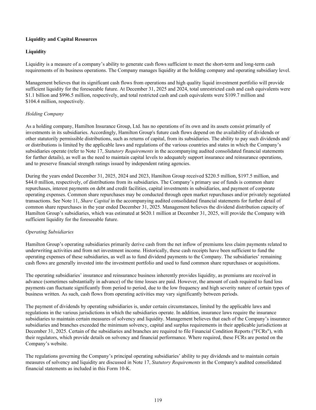 Liquidity and Capital Resources Liquidity Liquidity is a measure of a company’s ability to generate cash flows sufficient to meet the short-term and long-term cash requirements of its business operations. The Company manages liquidity at the holding company and operating subsidiary level. Management believes that its significant cash flows from operations and high quality liquid investment portfolio will provide sufficient liquidity for the foreseeable future. At December 31, 2025 and 2024, total unrestricted cash and cash equivalents were $1.1 billion and $996.5 million, respectively, and total restricted cash and cash equivalents were $109.7 million and $104.4 million, respectively. Holding Company As a holding company, Hamilton Insurance Group, Ltd. has no operations of its own and its assets consist primarily of investments in its subsidiaries. Accordingly, Hamilton Group's future cash flows depend on the availability of dividends or other statutorily permissible distributions, such as returns of capital, from its subsidiaries. The ability to pay such dividends and/ or distributions is limited by the applicable laws and regulations of the various countries and states in which the Company’s subsidiaries operate (refer to Note 17, Statutory Requirements in the accompanying audited consolidated financial statements for further details), as well as the need to maintain capital levels to adequately support insurance and reinsurance operations, and to preserve financial strength ratings issued by independent rating agencies. During the years ended December 31, 2025, 2024 and 2023, Hamilton Group received $220.5 million, $197.5 million, and $44.0 million, respectively, of distributions from its subsidiaries. The Company’s primary use of funds is common share repurchases, interest payments on debt and credit facilities, capital investments in subsidiaries, and payment of corporate operating expenses. Common share repurchases may be conducted through open market repurchases and/or privately negotiated transactions. See Note 11, Share Capital in the accompanying audited consolidated financial statements for further detail of common share repurchases in the year ended December 31, 2025. Management believes the dividend distribution capacity of Hamilton Group’s subsidiaries, which was estimated at $620.1 million at December 31, 2025, will provide the Company with sufficient liquidity for the foreseeable future. Operating Subsidiaries Hamilton Group’s operating subsidiaries primarily derive cash from the net inflow of premiums less claim payments related to underwriting activities and from net investment income. Historically, these cash receipts have been sufficient to fund the operating expenses of these subsidiaries, as well as to fund dividend payments to the Company. The subsidiaries’ remaining cash flows are generally invested into the investment portfolio and used to fund common share repurchases or acquisitions. The operating subsidiaries’ insurance and reinsurance business inherently provides liquidity, as premiums are received in advance (sometimes substantially in advance) of the time losses are paid. However, the amount of cash required to fund loss payments can fluctuate significantly from period to period, due to the low frequency and high severity nature of certain types of business written. As such, cash flows from operating activities may vary significantly between periods. The payment of dividends by operating subsidiaries is, under certain circumstances, limited by the applicable laws and regulations in the various jurisdictions in which the subsidiaries operate. In addition, insurance laws require the insurance subsidiaries to maintain certain measures of solvency and liquidity. Management believes that each of the Company’s insurance subsidiaries and branches exceeded the minimum solvency, capital and surplus requirements in their applicable jurisdictions at December 31, 2025. Certain of the subsidiaries and branches are required to file Financial Condition Reports ("FCRs"), with their regulators, which provide details on solvency and financial performance. Where required, these FCRs are posted on the Company’s website. The regulations governing the Company’s principal operating subsidiaries’ ability to pay dividends and to maintain certain measures of solvency and liquidity are discussed in Note 17, Statutory Requirements in the Company's audited consolidated financial statements as included in this Form 10-K. 119