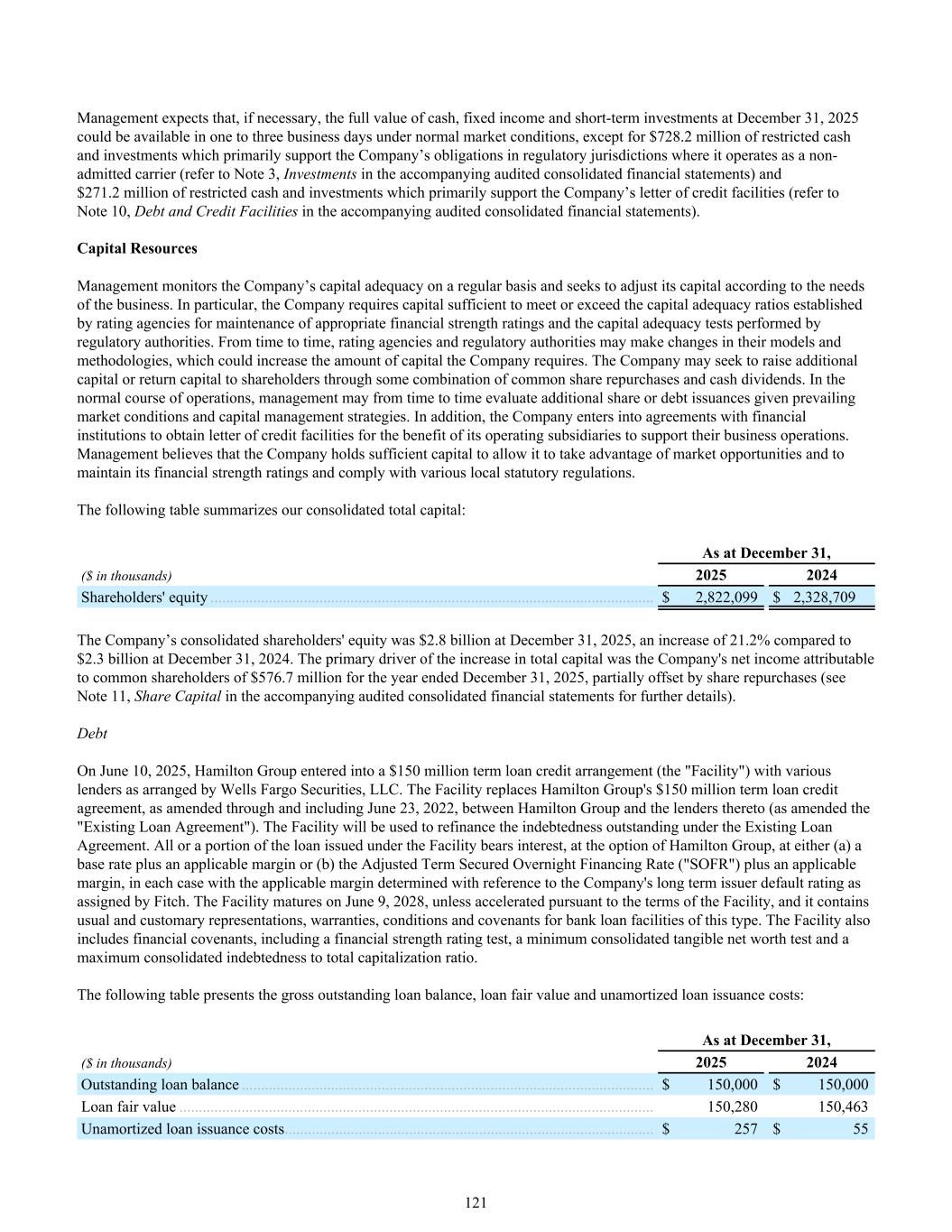 Management expects that, if necessary, the full value of cash, fixed income and short-term investments at December 31, 2025 could be available in one to three business days under normal market conditions, except for $728.2 million of restricted cash and investments which primarily support the Company’s obligations in regulatory jurisdictions where it operates as a non- admitted carrier (refer to Note 3, Investments in the accompanying audited consolidated financial statements) and $271.2 million of restricted cash and investments which primarily support the Company’s letter of credit facilities (refer to Note 10, Debt and Credit Facilities in the accompanying audited consolidated financial statements). Capital Resources Management monitors the Company’s capital adequacy on a regular basis and seeks to adjust its capital according to the needs of the business. In particular, the Company requires capital sufficient to meet or exceed the capital adequacy ratios established by rating agencies for maintenance of appropriate financial strength ratings and the capital adequacy tests performed by regulatory authorities. From time to time, rating agencies and regulatory authorities may make changes in their models and methodologies, which could increase the amount of capital the Company requires. The Company may seek to raise additional capital or return capital to shareholders through some combination of common share repurchases and cash dividends. In the normal course of operations, management may from time to time evaluate additional share or debt issuances given prevailing market conditions and capital management strategies. In addition, the Company enters into agreements with financial institutions to obtain letter of credit facilities for the benefit of its operating subsidiaries to support their business operations. Management believes that the Company holds sufficient capital to allow it to take advantage of market opportunities and to maintain its financial strength ratings and comply with various local statutory regulations. The following table summarizes our consolidated total capital: As at December 31, ($ in thousands) 2025 2024 Shareholders' equity .................................................................................................................. $ 2,822,099 $ 2,328,709 The Company’s consolidated shareholders' equity was $2.8 billion at December 31, 2025, an increase of 21.2% compared to $2.3 billion at December 31, 2024. The primary driver of the increase in total capital was the Company's net income attributable to common shareholders of $576.7 million for the year ended December 31, 2025, partially offset by share repurchases (see Note 11, Share Capital in the accompanying audited consolidated financial statements for further details). Debt On June 10, 2025, Hamilton Group entered into a $150 million term loan credit arrangement (the "Facility") with various lenders as arranged by Wells Fargo Securities, LLC. The Facility replaces Hamilton Group's $150 million term loan credit agreement, as amended through and including June 23, 2022, between Hamilton Group and the lenders thereto (as amended the "Existing Loan Agreement"). The Facility will be used to refinance the indebtedness outstanding under the Existing Loan Agreement. All or a portion of the loan issued under the Facility bears interest, at the option of Hamilton Group, at either (a) a base rate plus an applicable margin or (b) the Adjusted Term Secured Overnight Financing Rate ("SOFR") plus an applicable margin, in each case with the applicable margin determined with reference to the Company's long term issuer default rating as assigned by Fitch. The Facility matures on June 9, 2028, unless accelerated pursuant to the terms of the Facility, and it contains usual and customary representations, warranties, conditions and covenants for bank loan facilities of this type. The Facility also includes financial covenants, including a financial strength rating test, a minimum consolidated tangible net worth test and a maximum consolidated indebtedness to total capitalization ratio. The following table presents the gross outstanding loan balance, loan fair value and unamortized loan issuance costs: As at December 31, ($ in thousands) 2025 2024 Outstanding loan balance .......................................................................................................... $ 150,000 $ 150,000 Loan fair value .......................................................................................................................... 150,280 150,463 Unamortized loan issuance costs ............................................................................................... $ 257 $ 55 121