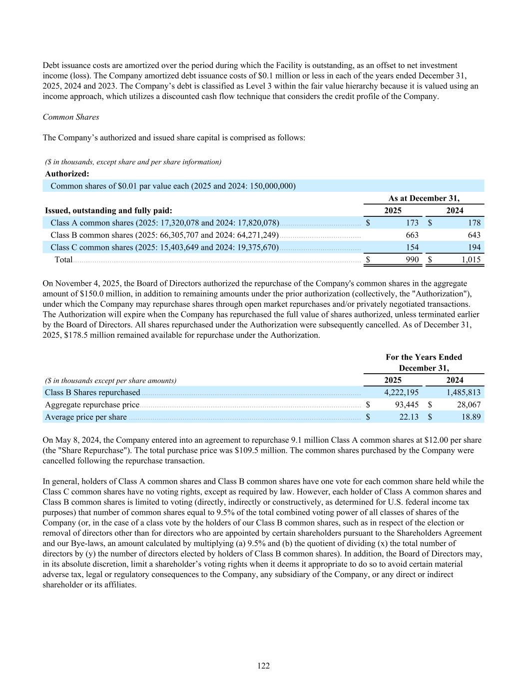 Debt issuance costs are amortized over the period during which the Facility is outstanding, as an offset to net investment income (loss). The Company amortized debt issuance costs of $0.1 million or less in each of the years ended December 31, 2025, 2024 and 2023. The Company’s debt is classified as Level 3 within the fair value hierarchy because it is valued using an income approach, which utilizes a discounted cash flow technique that considers the credit profile of the Company. Common Shares The Company’s authorized and issued share capital is comprised as follows: ($ in thousands, except share and per share information) Authorized: Common shares of $0.01 par value each (2025 and 2024: 150,000,000) As at December 31, Issued, outstanding and fully paid: 2025 2024 Class A common shares (2025: 17,320,078 and 2024: 17,820,078) ...................................... $ 173 $ 178 Class B common shares (2025: 66,305,707 and 2024: 64,271,249) ...................................... 663 643 Class C common shares (2025: 15,403,649 and 2024: 19,375,670) ...................................... 154 194 Total ...................................................................................................................................... $ 990 $ 1,015 On November 4, 2025, the Board of Directors authorized the repurchase of the Company's common shares in the aggregate amount of $150.0 million, in addition to remaining amounts under the prior authorization (collectively, the "Authorization"), under which the Company may repurchase shares through open market repurchases and/or privately negotiated transactions. The Authorization will expire when the Company has repurchased the full value of shares authorized, unless terminated earlier by the Board of Directors. All shares repurchased under the Authorization were subsequently cancelled. As of December 31, 2025, $178.5 million remained available for repurchase under the Authorization. For the Years Ended December 31, ($ in thousands except per share amounts) 2025 2024 Class B Shares repurchased ...................................................................................................... 4,222,195 1,485,813 Aggregate repurchase price ....................................................................................................... $ 93,445 $ 28,067 Average price per share ............................................................................................................ $ 22.13 $ 18.89 On May 8, 2024, the Company entered into an agreement to repurchase 9.1 million Class A common shares at $12.00 per share (the "Share Repurchase"). The total purchase price was $109.5 million. The common shares purchased by the Company were cancelled following the repurchase transaction. In general, holders of Class A common shares and Class B common shares have one vote for each common share held while the Class C common shares have no voting rights, except as required by law. However, each holder of Class A common shares and Class B common shares is limited to voting (directly, indirectly or constructively, as determined for U.S. federal income tax purposes) that number of common shares equal to 9.5% of the total combined voting power of all classes of shares of the Company (or, in the case of a class vote by the holders of our Class B common shares, such as in respect of the election or removal of directors other than for directors who are appointed by certain shareholders pursuant to the Shareholders Agreement and our Bye-laws, an amount calculated by multiplying (a) 9.5% and (b) the quotient of dividing (x) the total number of directors by (y) the number of directors elected by holders of Class B common shares). In addition, the Board of Directors may, in its absolute discretion, limit a shareholder’s voting rights when it deems it appropriate to do so to avoid certain material adverse tax, legal or regulatory consequences to the Company, any subsidiary of the Company, or any direct or indirect shareholder or its affiliates. 122