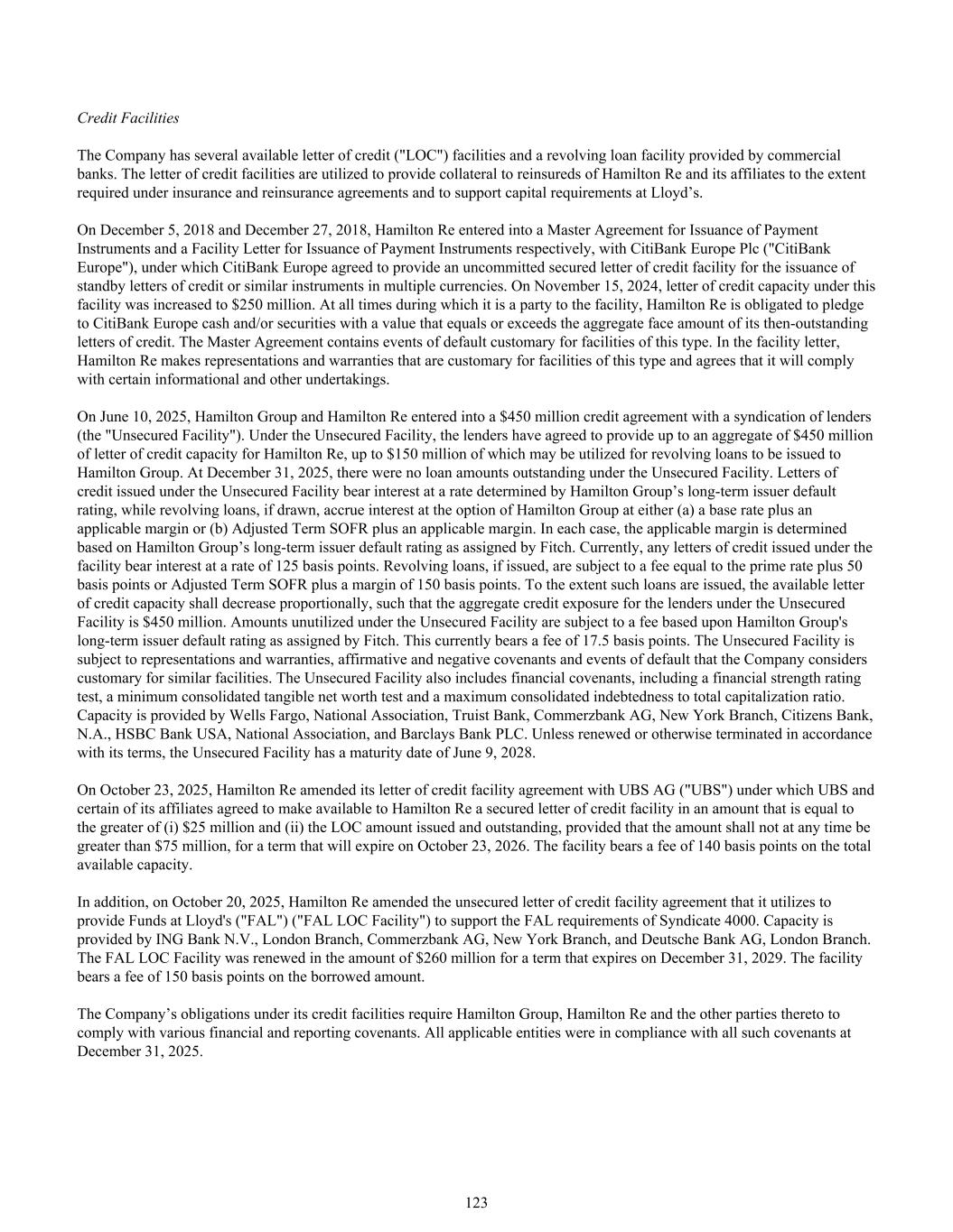 Credit Facilities The Company has several available letter of credit ("LOC") facilities and a revolving loan facility provided by commercial banks. The letter of credit facilities are utilized to provide collateral to reinsureds of Hamilton Re and its affiliates to the extent required under insurance and reinsurance agreements and to support capital requirements at Lloyd’s. On December 5, 2018 and December 27, 2018, Hamilton Re entered into a Master Agreement for Issuance of Payment Instruments and a Facility Letter for Issuance of Payment Instruments respectively, with CitiBank Europe Plc ("CitiBank Europe"), under which CitiBank Europe agreed to provide an uncommitted secured letter of credit facility for the issuance of standby letters of credit or similar instruments in multiple currencies. On November 15, 2024, letter of credit capacity under this facility was increased to $250 million. At all times during which it is a party to the facility, Hamilton Re is obligated to pledge to CitiBank Europe cash and/or securities with a value that equals or exceeds the aggregate face amount of its then-outstanding letters of credit. The Master Agreement contains events of default customary for facilities of this type. In the facility letter, Hamilton Re makes representations and warranties that are customary for facilities of this type and agrees that it will comply with certain informational and other undertakings. On June 10, 2025, Hamilton Group and Hamilton Re entered into a $450 million credit agreement with a syndication of lenders (the "Unsecured Facility"). Under the Unsecured Facility, the lenders have agreed to provide up to an aggregate of $450 million of letter of credit capacity for Hamilton Re, up to $150 million of which may be utilized for revolving loans to be issued to Hamilton Group. At December 31, 2025, there were no loan amounts outstanding under the Unsecured Facility. Letters of credit issued under the Unsecured Facility bear interest at a rate determined by Hamilton Group’s long-term issuer default rating, while revolving loans, if drawn, accrue interest at the option of Hamilton Group at either (a) a base rate plus an applicable margin or (b) Adjusted Term SOFR plus an applicable margin. In each case, the applicable margin is determined based on Hamilton Group’s long-term issuer default rating as assigned by Fitch. Currently, any letters of credit issued under the facility bear interest at a rate of 125 basis points. Revolving loans, if issued, are subject to a fee equal to the prime rate plus 50 basis points or Adjusted Term SOFR plus a margin of 150 basis points. To the extent such loans are issued, the available letter of credit capacity shall decrease proportionally, such that the aggregate credit exposure for the lenders under the Unsecured Facility is $450 million. Amounts unutilized under the Unsecured Facility are subject to a fee based upon Hamilton Group's long-term issuer default rating as assigned by Fitch. This currently bears a fee of 17.5 basis points. The Unsecured Facility is subject to representations and warranties, affirmative and negative covenants and events of default that the Company considers customary for similar facilities. The Unsecured Facility also includes financial covenants, including a financial strength rating test, a minimum consolidated tangible net worth test and a maximum consolidated indebtedness to total capitalization ratio. Capacity is provided by Wells Fargo, National Association, Truist Bank, Commerzbank AG, New York Branch, Citizens Bank, N.A., HSBC Bank USA, National Association, and Barclays Bank PLC. Unless renewed or otherwise terminated in accordance with its terms, the Unsecured Facility has a maturity date of June 9, 2028. On October 23, 2025, Hamilton Re amended its letter of credit facility agreement with UBS AG ("UBS") under which UBS and certain of its affiliates agreed to make available to Hamilton Re a secured letter of credit facility in an amount that is equal to the greater of (i) $25 million and (ii) the LOC amount issued and outstanding, provided that the amount shall not at any time be greater than $75 million, for a term that will expire on October 23, 2026. The facility bears a fee of 140 basis points on the total available capacity. In addition, on October 20, 2025, Hamilton Re amended the unsecured letter of credit facility agreement that it utilizes to provide Funds at Lloyd's ("FAL") ("FAL LOC Facility") to support the FAL requirements of Syndicate 4000. Capacity is provided by ING Bank N.V., London Branch, Commerzbank AG, New York Branch, and Deutsche Bank AG, London Branch. The FAL LOC Facility was renewed in the amount of $260 million for a term that expires on December 31, 2029. The facility bears a fee of 150 basis points on the borrowed amount. The Company’s obligations under its credit facilities require Hamilton Group, Hamilton Re and the other parties thereto to comply with various financial and reporting covenants. All applicable entities were in compliance with all such covenants at December 31, 2025. 123