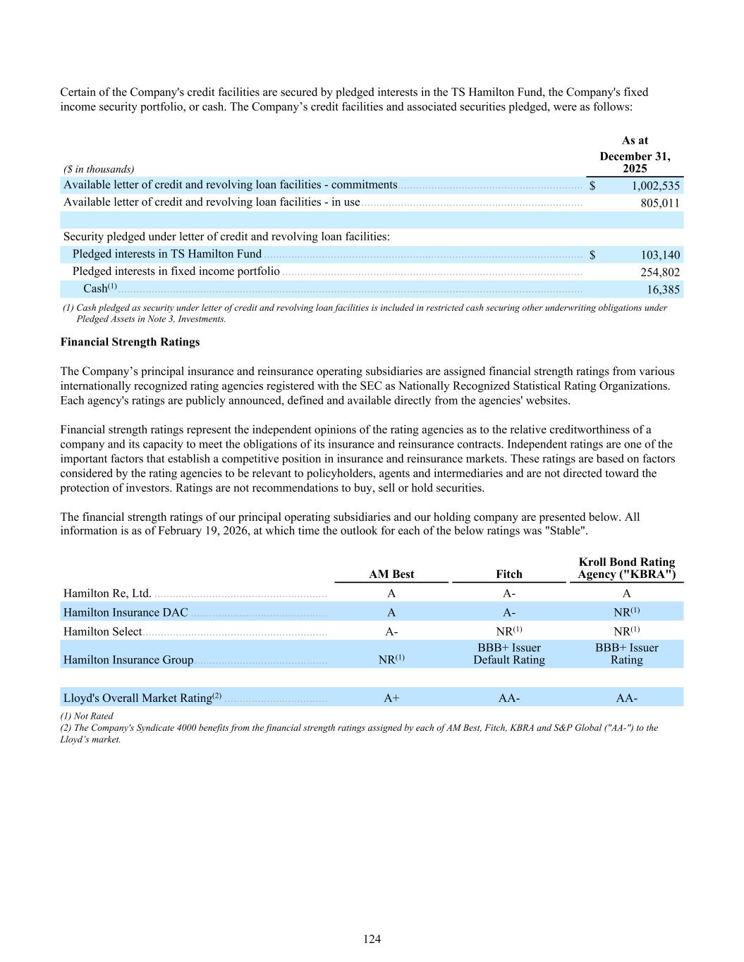 Certain of the Company's credit facilities are secured by pledged interests in the TS Hamilton Fund, the Company's fixed income security portfolio, or cash. The Company’s credit facilities and associated securities pledged, were as follows: As at ($ in thousands) December 31, 2025 Available letter of credit and revolving loan facilities - commitments ............................................................. $ 1,002,535 Available letter of credit and revolving loan facilities - in use ......................................................................... 805,011 Security pledged under letter of credit and revolving loan facilities: Pledged interests in TS Hamilton Fund ......................................................................................................... $ 103,140 Pledged interests in fixed income portfolio ................................................................................................... 254,802 Cash(1) ......................................................................................................................................................... 16,385 (1) Cash pledged as security under letter of credit and revolving loan facilities is included in restricted cash securing other underwriting obligations under Pledged Assets in Note 3, Investments. Financial Strength Ratings The Company’s principal insurance and reinsurance operating subsidiaries are assigned financial strength ratings from various internationally recognized rating agencies registered with the SEC as Nationally Recognized Statistical Rating Organizations. Each agency's ratings are publicly announced, defined and available directly from the agencies' websites. Financial strength ratings represent the independent opinions of the rating agencies as to the relative creditworthiness of a company and its capacity to meet the obligations of its insurance and reinsurance contracts. Independent ratings are one of the important factors that establish a competitive position in insurance and reinsurance markets. These ratings are based on factors considered by the rating agencies to be relevant to policyholders, agents and intermediaries and are not directed toward the protection of investors. Ratings are not recommendations to buy, sell or hold securities. The financial strength ratings of our principal operating subsidiaries and our holding company are presented below. All information is as of February 19, 2026, at which time the outlook for each of the below ratings was "Stable". AM Best Fitch Kroll Bond Rating Agency ("KBRA") Hamilton Re, Ltd. ......................................................... A A- A Hamilton Insurance DAC ............................................. A A- NR(1) Hamilton Select ............................................................. A- NR(1) NR(1) Hamilton Insurance Group ............................................ NR(1) BBB+ Issuer Default Rating BBB+ Issuer Rating Lloyd's Overall Market Rating(2) .................................. A+ AA- AA- (1) Not Rated (2) The Company's Syndicate 4000 benefits from the financial strength ratings assigned by each of AM Best, Fitch, KBRA and S&P Global ("AA-") to the Lloyd’s market. 124