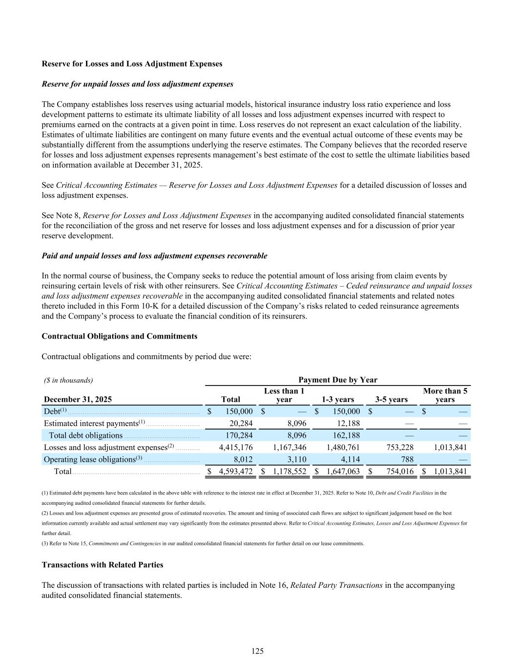 Reserve for Losses and Loss Adjustment Expenses Reserve for unpaid losses and loss adjustment expenses The Company establishes loss reserves using actuarial models, historical insurance industry loss ratio experience and loss development patterns to estimate its ultimate liability of all losses and loss adjustment expenses incurred with respect to premiums earned on the contracts at a given point in time. Loss reserves do not represent an exact calculation of the liability. Estimates of ultimate liabilities are contingent on many future events and the eventual actual outcome of these events may be substantially different from the assumptions underlying the reserve estimates. The Company believes that the recorded reserve for losses and loss adjustment expenses represents management’s best estimate of the cost to settle the ultimate liabilities based on information available at December 31, 2025. See Critical Accounting Estimates — Reserve for Losses and Loss Adjustment Expenses for a detailed discussion of losses and loss adjustment expenses. See Note 8, Reserve for Losses and Loss Adjustment Expenses in the accompanying audited consolidated financial statements for the reconciliation of the gross and net reserve for losses and loss adjustment expenses and for a discussion of prior year reserve development. Paid and unpaid losses and loss adjustment expenses recoverable In the normal course of business, the Company seeks to reduce the potential amount of loss arising from claim events by reinsuring certain levels of risk with other reinsurers. See Critical Accounting Estimates – Ceded reinsurance and unpaid losses and loss adjustment expenses recoverable in the accompanying audited consolidated financial statements and related notes thereto included in this Form 10-K for a detailed discussion of the Company’s risks related to ceded reinsurance agreements and the Company’s process to evaluate the financial condition of its reinsurers. Contractual Obligations and Commitments Contractual obligations and commitments by period due were: ($ in thousands) Payment Due by Year December 31, 2025 Total Less than 1 year 1-3 years 3-5 years More than 5 years Debt(1) ............................................................... $ 150,000 $ — $ 150,000 $ — $ — Estimated interest payments(1) .......................... 20,284 8,096 12,188 — — Total debt obligations .................................... 170,284 8,096 162,188 — — Losses and loss adjustment expenses(2) ............ 4,415,176 1,167,346 1,480,761 753,228 1,013,841 Operating lease obligations(3) ........................... 8,012 3,110 4,114 788 — Total ............................................................. $ 4,593,472 $ 1,178,552 $ 1,647,063 $ 754,016 $ 1,013,841 (1) Estimated debt payments have been calculated in the above table with reference to the interest rate in effect at December 31, 2025. Refer to Note 10, Debt and Credit Facilities in the accompanying audited consolidated financial statements for further details. (2) Losses and loss adjustment expenses are presented gross of estimated recoveries. The amount and timing of associated cash flows are subject to significant judgement based on the best information currently available and actual settlement may vary significantly from the estimates presented above. Refer to Critical Accounting Estimates, Losses and Loss Adjustment Expenses for further detail. (3) Refer to Note 15, Commitments and Contingencies in our audited consolidated financial statements for further detail on our lease commitments. Transactions with Related Parties The discussion of transactions with related parties is included in Note 16, Related Party Transactions in the accompanying audited consolidated financial statements. 125