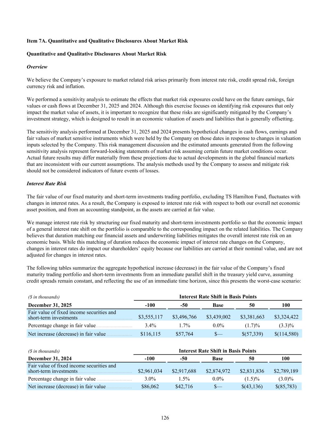Item 7A. Quantitative and Qualitative Disclosures About Market Risk Quantitative and Qualitative Disclosures About Market Risk Overview We believe the Company’s exposure to market related risk arises primarily from interest rate risk, credit spread risk, foreign currency risk and inflation. We performed a sensitivity analysis to estimate the effects that market risk exposures could have on the future earnings, fair values or cash flows at December 31, 2025 and 2024. Although this exercise focuses on identifying risk exposures that only impact the market value of assets, it is important to recognize that these risks are significantly mitigated by the Company’s investment strategy, which is designed to result in an economic valuation of assets and liabilities that is generally offsetting. The sensitivity analysis performed at December 31, 2025 and 2024 presents hypothetical changes in cash flows, earnings and fair values of market sensitive instruments which were held by the Company on those dates in response to changes in valuation inputs selected by the Company. This risk management discussion and the estimated amounts generated from the following sensitivity analysis represent forward-looking statements of market risk assuming certain future market conditions occur. Actual future results may differ materially from these projections due to actual developments in the global financial markets that are inconsistent with our current assumptions. The analysis methods used by the Company to assess and mitigate risk should not be considered indicators of future events of losses. Interest Rate Risk The fair value of our fixed maturity and short-term investments trading portfolio, excluding TS Hamilton Fund, fluctuates with changes in interest rates. As a result, the Company is exposed to interest rate risk with respect to both our overall net economic asset position, and from an accounting standpoint, as the assets are carried at fair value. We manage interest rate risk by structuring our fixed maturity and short-term investments portfolio so that the economic impact of a general interest rate shift on the portfolio is comparable to the corresponding impact on the related liabilities. The Company believes that duration matching our financial assets and underwriting liabilities mitigates the overall interest rate risk on an economic basis. While this matching of duration reduces the economic impact of interest rate changes on the Company, changes in interest rates do impact our shareholders’ equity because our liabilities are carried at their nominal value, and are not adjusted for changes in interest rates. The following tables summarize the aggregate hypothetical increase (decrease) in the fair value of the Company’s fixed maturity trading portfolio and short-term investments from an immediate parallel shift in the treasury yield curve, assuming credit spreads remain constant, and reflecting the use of an immediate time horizon, since this presents the worst-case scenario: ($ in thousands) Interest Rate Shift in Basis Points December 31, 2025 -100 -50 Base 50 100 Fair value of fixed income securities and short-term investments ........................................ $3,555,117 $3,496,766 $3,439,002 $3,381,663 $3,324,422 Percentage change in fair value ........................... 3.4% 1.7% 0.0% (1.7)% (3.3)% Net increase (decrease) in fair value ................... $116,115 $57,764 $— $(57,339) $(114,580) ($ in thousands) Interest Rate Shift in Basis Points December 31, 2024 -100 -50 Base 50 100 Fair value of fixed income securities and short-term investments ........................................ $2,961,034 $2,917,688 $2,874,972 $2,831,836 $2,789,189 Percentage change in fair value .......................... 3.0% 1.5% 0.0% (1.5)% (3.0)% Net increase (decrease) in fair value ................... $86,062 $42,716 $— $(43,136) $(85,783) 126