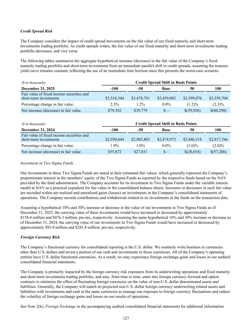 Credit Spread Risk The Company considers the impact of credit spread movements on the fair value of our fixed maturity and short-term investments trading portfolio. As credit spreads widen, the fair value of our fixed maturity and short-term investments trading portfolio decreases, and vice versa. The following tables summarize the aggregate hypothetical increase (decrease) in the fair value of the Company’s fixed maturity trading portfolio and short-term investments from an immediate parallel shift in credit spreads, assuming the treasury yield curve remains constant, reflecting the use of an immediate time horizon since this presents the worst-case scenario: ($ in thousands) Credit Spread Shift in Basis Points December 31, 2025 -100 -50 Base 50 100 Fair value of fixed income securities and short-term investments ........................................ $3,518,544 $3,478,781 $3,439,002 $3,399,076 $3,358,704 Percentage change in fair value .......................... 2.3% 1.2% 0.0% (1.2)% (2.3)% Net increase (decrease) in fair value ................... $79,542 $39,779 $— $(39,926) $(80,298) ($ in thousands) Credit Spread Shift in Basis Points December 31, 2024 -100 -50 Base 50 100 Fair value of fixed income securities and short-term investments ........................................ $2,930,844 $2,902,803 $2,874,972 $2,846,318 $2,817,766 Percentage change in fair value .......................... 1.9% 1.0% 0.0% (1.0)% (2.0)% Net increase (decrease) in fair value ................... $55,872 $27,831 $— $(28,654) $(57,206) Investment in Two Sigma Funds Our investments in these Two Sigma Funds are stated at their estimated fair values, which generally represent the Company’s proportionate interest in the members’ equity of the Two Sigma Funds as reported by the respective funds based on the NAV provided by the fund administrator. The Company accounts for its investment in Two Sigma Funds under the variable interest model at NAV as a practical expedient for fair value in the consolidated balance sheets. Increases or decreases in such fair value are recorded within net realized and unrealized gains (losses) on investments in the Company’s consolidated statements of operations. The Company records contributions and withdrawals related to its investments in the funds on the transaction date. Assuming a hypothetical 10% and 30% increase or decrease in the value of our investments in Two Sigma Funds as of December 31, 2025, the carrying value of these investments would have increased or decreased by approximately $158.8 million and $476.3 million, pre-tax, respectively. Assuming the same hypothetical 10% and 30% increase or decrease as of December 31, 2024, the carrying value of our investments in Two Sigma Funds would have increased or decreased by approximately $93.9 million and $281.8 million, pre-tax, respectively. Foreign Currency Risk The Company’s functional currency for consolidated reporting is the U.S. dollar. We routinely write business in currencies other than U.S. dollars and invest a portion of our cash and investments in those currencies. All of the Company’s operating entities have U.S. dollar functional currencies. As a result, we may experience foreign exchange gains and losses in our audited consolidated financial statements. The Company is primarily impacted by the foreign currency risk exposures from its underwriting operations and fixed maturity and short-term investments trading portfolio, and may, from time to time, enter into foreign currency forward and option contracts to minimize the effect of fluctuating foreign currencies on the value of non-U.S. dollar denominated assets and liabilities. Generally, the Company will match its projected non-U.S. dollar foreign currency underwriting related assets and liabilities with investments and cash in the same currencies to manage our exposure to foreign currency fluctuations and reduce the volatility of foreign exchange gains and losses on our results of operations. See Note 2(k), Foreign Exchange in the accompanying audited consolidated financial statements for additional information. 127