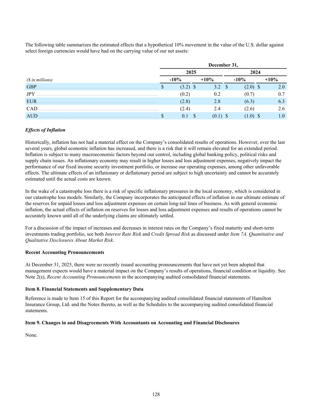 The following table summarizes the estimated effects that a hypothetical 10% movement in the value of the U.S. dollar against select foreign currencies would have had on the carrying value of our net assets: December 31, 2025 2024 ($ in millions) -10% +10% -10% +10% GBP ............................................................................................... $ (3.2) $ 3.2 $ (2.0) $ 2.0 JPY ................................................................................................ (0.2) 0.2 (0.7) 0.7 EUR ............................................................................................... (2.8) 2.8 (6.3) 6.3 CAD ............................................................................................... (2.4) 2.4 (2.6) 2.6 AUD .............................................................................................. $ 0.1 $ (0.1) $ (1.0) $ 1.0 Effects of Inflation Historically, inflation has not had a material effect on the Company’s consolidated results of operations. However, over the last several years, global economic inflation has increased, and there is a risk that it will remain elevated for an extended period. Inflation is subject to many macroeconomic factors beyond our control, including global banking policy, political risks and supply chain issues. An inflationary economy may result in higher losses and loss adjustment expenses, negatively impact the performance of our fixed income security investment portfolio, or increase our operating expenses, among other unfavorable effects. The ultimate effects of an inflationary or deflationary period are subject to high uncertainty and cannot be accurately estimated until the actual costs are known. In the wake of a catastrophe loss there is a risk of specific inflationary pressures in the local economy, which is considered in our catastrophe loss models. Similarly, the Company incorporates the anticipated effects of inflation in our ultimate estimate of the reserves for unpaid losses and loss adjustment expenses on certain long-tail lines of business. As with general economic inflation, the actual effects of inflation on reserves for losses and loss adjustment expenses and results of operations cannot be accurately known until all of the underlying claims are ultimately settled. For a discussion of the impact of increases and decreases in interest rates on the Company’s fixed maturity and short-term investments trading portfolio, see both Interest Rate Risk and Credit Spread Risk as discussed under Item 7A. Quantitative and Qualitative Disclosures About Market Risk. Recent Accounting Pronouncements At December 31, 2025, there were no recently issued accounting pronouncements that have not yet been adopted that management expects would have a material impact on the Company’s results of operations, financial condition or liquidity. See Note 2(s), Recent Accounting Pronouncements in the accompanying audited consolidated financial statements. Item 8. Financial Statements and Supplementary Data Reference is made to Item 15 of this Report for the accompanying audited consolidated financial statements of Hamilton Insurance Group, Ltd. and the Notes thereto, as well as the Schedules to the accompanying audited consolidated financial statements. Item 9. Changes in and Disagreements With Accountants on Accounting and Financial Disclosures None. 128