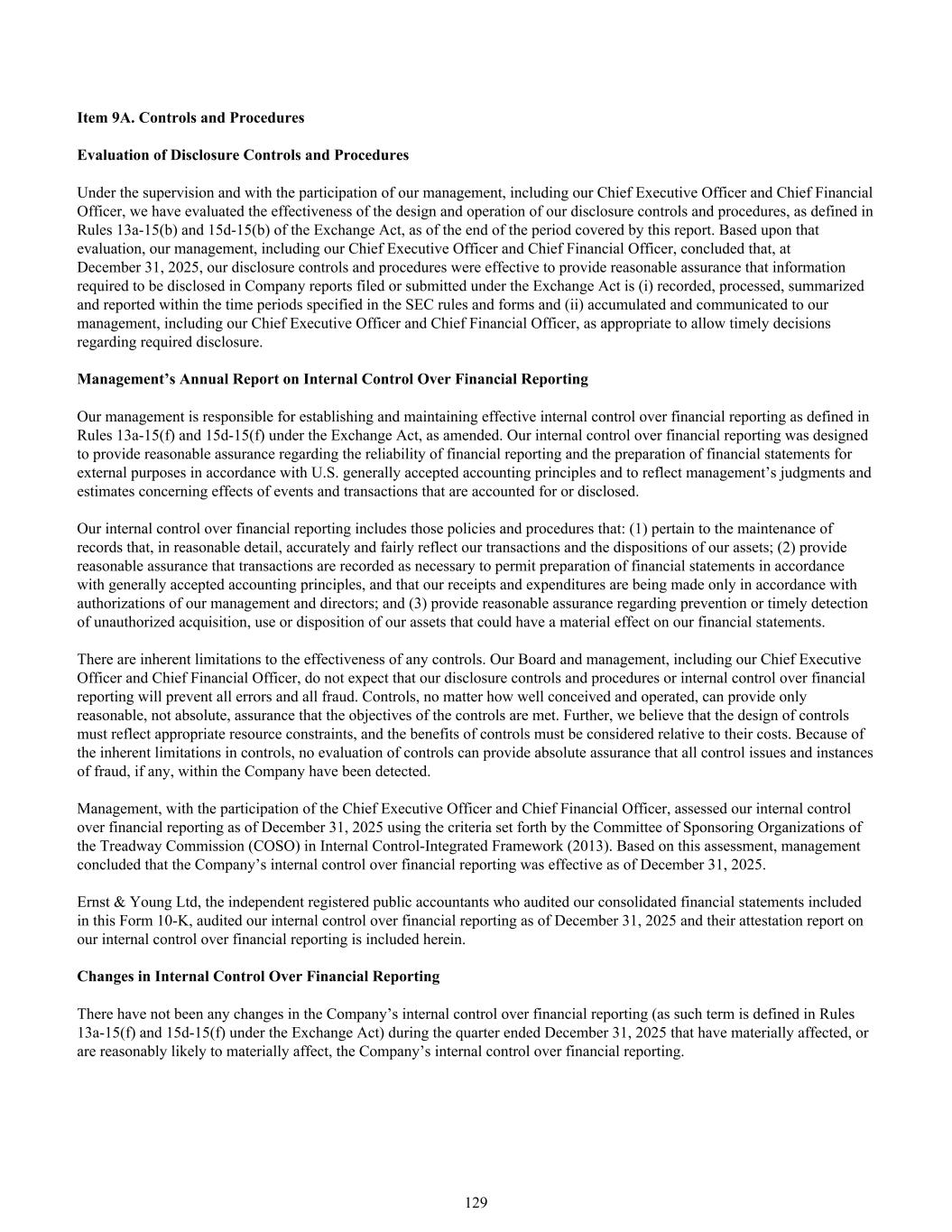 Item 9A. Controls and Procedures Evaluation of Disclosure Controls and Procedures Under the supervision and with the participation of our management, including our Chief Executive Officer and Chief Financial Officer, we have evaluated the effectiveness of the design and operation of our disclosure controls and procedures, as defined in Rules 13a-15(b) and 15d-15(b) of the Exchange Act, as of the end of the period covered by this report. Based upon that evaluation, our management, including our Chief Executive Officer and Chief Financial Officer, concluded that, at December 31, 2025, our disclosure controls and procedures were effective to provide reasonable assurance that information required to be disclosed in Company reports filed or submitted under the Exchange Act is (i) recorded, processed, summarized and reported within the time periods specified in the SEC rules and forms and (ii) accumulated and communicated to our management, including our Chief Executive Officer and Chief Financial Officer, as appropriate to allow timely decisions regarding required disclosure. Management’s Annual Report on Internal Control Over Financial Reporting Our management is responsible for establishing and maintaining effective internal control over financial reporting as defined in Rules 13a-15(f) and 15d-15(f) under the Exchange Act, as amended. Our internal control over financial reporting was designed to provide reasonable assurance regarding the reliability of financial reporting and the preparation of financial statements for external purposes in accordance with U.S. generally accepted accounting principles and to reflect management’s judgments and estimates concerning effects of events and transactions that are accounted for or disclosed. Our internal control over financial reporting includes those policies and procedures that: (1) pertain to the maintenance of records that, in reasonable detail, accurately and fairly reflect our transactions and the dispositions of our assets; (2) provide reasonable assurance that transactions are recorded as necessary to permit preparation of financial statements in accordance with generally accepted accounting principles, and that our receipts and expenditures are being made only in accordance with authorizations of our management and directors; and (3) provide reasonable assurance regarding prevention or timely detection of unauthorized acquisition, use or disposition of our assets that could have a material effect on our financial statements. There are inherent limitations to the effectiveness of any controls. Our Board and management, including our Chief Executive Officer and Chief Financial Officer, do not expect that our disclosure controls and procedures or internal control over financial reporting will prevent all errors and all fraud. Controls, no matter how well conceived and operated, can provide only reasonable, not absolute, assurance that the objectives of the controls are met. Further, we believe that the design of controls must reflect appropriate resource constraints, and the benefits of controls must be considered relative to their costs. Because of the inherent limitations in controls, no evaluation of controls can provide absolute assurance that all control issues and instances of fraud, if any, within the Company have been detected. Management, with the participation of the Chief Executive Officer and Chief Financial Officer, assessed our internal control over financial reporting as of December 31, 2025 using the criteria set forth by the Committee of Sponsoring Organizations of the Treadway Commission (COSO) in Internal Control-Integrated Framework (2013). Based on this assessment, management concluded that the Company’s internal control over financial reporting was effective as of December 31, 2025. Ernst & Young Ltd, the independent registered public accountants who audited our consolidated financial statements included in this Form 10-K, audited our internal control over financial reporting as of December 31, 2025 and their attestation report on our internal control over financial reporting is included herein. Changes in Internal Control Over Financial Reporting There have not been any changes in the Company’s internal control over financial reporting (as such term is defined in Rules 13a-15(f) and 15d-15(f) under the Exchange Act) during the quarter ended December 31, 2025 that have materially affected, or are reasonably likely to materially affect, the Company’s internal control over financial reporting. 129