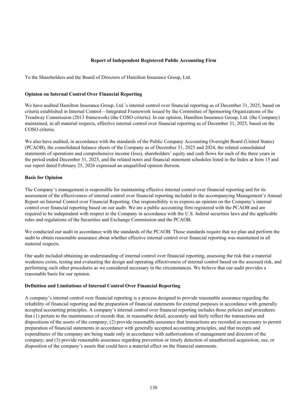 Report of Independent Registered Public Accounting Firm To the Shareholders and the Board of Directors of Hamilton Insurance Group, Ltd. Opinion on Internal Control Over Financial Reporting We have audited Hamilton Insurance Group, Ltd.’s internal control over financial reporting as of December 31, 2025, based on criteria established in Internal Control—Integrated Framework issued by the Committee of Sponsoring Organizations of the Treadway Commission (2013 framework) (the COSO criteria). In our opinion, Hamilton Insurance Group, Ltd. (the Company) maintained, in all material respects, effective internal control over financial reporting as of December 31, 2025, based on the COSO criteria. We also have audited, in accordance with the standards of the Public Company Accounting Oversight Board (United States) (PCAOB), the consolidated balance sheets of the Company as of December 31, 2025 and 2024, the related consolidated statements of operations and comprehensive income (loss), shareholders’ equity and cash flows for each of the three years in the period ended December 31, 2025, and the related notes and financial statement schedules listed in the Index at Item 15 and our report dated February 25, 2026 expressed an unqualified opinion thereon. Basis for Opinion The Company’s management is responsible for maintaining effective internal control over financial reporting and for its assessment of the effectiveness of internal control over financial reporting included in the accompanying Management’s Annual Report on Internal Control over Financial Reporting. Our responsibility is to express an opinion on the Company’s internal control over financial reporting based on our audit. We are a public accounting firm registered with the PCAOB and are required to be independent with respect to the Company in accordance with the U.S. federal securities laws and the applicable rules and regulations of the Securities and Exchange Commission and the PCAOB. We conducted our audit in accordance with the standards of the PCAOB. Those standards require that we plan and perform the audit to obtain reasonable assurance about whether effective internal control over financial reporting was maintained in all material respects. Our audit included obtaining an understanding of internal control over financial reporting, assessing the risk that a material weakness exists, testing and evaluating the design and operating effectiveness of internal control based on the assessed risk, and performing such other procedures as we considered necessary in the circumstances. We believe that our audit provides a reasonable basis for our opinion. Definition and Limitations of Internal Control Over Financial Reporting A company’s internal control over financial reporting is a process designed to provide reasonable assurance regarding the reliability of financial reporting and the preparation of financial statements for external purposes in accordance with generally accepted accounting principles. A company’s internal control over financial reporting includes those policies and procedures that (1) pertain to the maintenance of records that, in reasonable detail, accurately and fairly reflect the transactions and dispositions of the assets of the company; (2) provide reasonable assurance that transactions are recorded as necessary to permit preparation of financial statements in accordance with generally accepted accounting principles, and that receipts and expenditures of the company are being made only in accordance with authorizations of management and directors of the company; and (3) provide reasonable assurance regarding prevention or timely detection of unauthorized acquisition, use, or disposition of the company’s assets that could have a material effect on the financial statements. 130