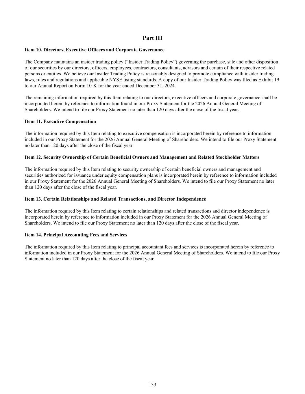 Part III Item 10. Directors, Executive Officers and Corporate Governance The Company maintains an insider trading policy (“Insider Trading Policy”) governing the purchase, sale and other disposition of our securities by our directors, officers, employees, contractors, consultants, advisors and certain of their respective related persons or entities. We believe our Insider Trading Policy is reasonably designed to promote compliance with insider trading laws, rules and regulations and applicable NYSE listing standards. A copy of our Insider Trading Policy was filed as Exhibit 19 to our Annual Report on Form 10-K for the year ended December 31, 2024. The remaining information required by this Item relating to our directors, executive officers and corporate governance shall be incorporated herein by reference to information found in our Proxy Statement for the 2026 Annual General Meeting of Shareholders. We intend to file our Proxy Statement no later than 120 days after the close of the fiscal year. Item 11. Executive Compensation The information required by this Item relating to executive compensation is incorporated herein by reference to information included in our Proxy Statement for the 2026 Annual General Meeting of Shareholders. We intend to file our Proxy Statement no later than 120 days after the close of the fiscal year. Item 12. Security Ownership of Certain Beneficial Owners and Management and Related Stockholder Matters The information required by this Item relating to security ownership of certain beneficial owners and management and securities authorized for issuance under equity compensation plans is incorporated herein by reference to information included in our Proxy Statement for the 2026 Annual General Meeting of Shareholders. We intend to file our Proxy Statement no later than 120 days after the close of the fiscal year. Item 13. Certain Relationships and Related Transactions, and Director Independence The information required by this Item relating to certain relationships and related transactions and director independence is incorporated herein by reference to information included in our Proxy Statement for the 2026 Annual General Meeting of Shareholders. We intend to file our Proxy Statement no later than 120 days after the close of the fiscal year. Item 14. Principal Accounting Fees and Services The information required by this Item relating to principal accountant fees and services is incorporated herein by reference to information included in our Proxy Statement for the 2026 Annual General Meeting of Shareholders. We intend to file our Proxy Statement no later than 120 days after the close of the fiscal year. 133