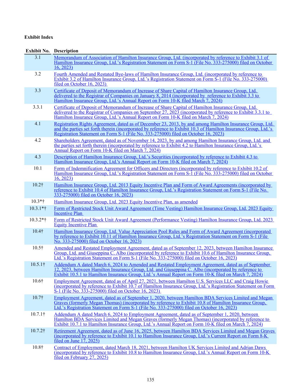 Exhibit Index Exhibit No. Description 3.1 Memorandum of Association of Hamilton Insurance Group, Ltd. (incorporated by reference to Exhibit 3.1 of Hamilton Insurance Group, Ltd.’s Registration Statement on Form S-1 (File No. 333-275000) filed on October 16, 2023) 3.2 Fourth Amended and Restated Bye-laws of Hamilton Insurance Group, Ltd. (incorporated by reference to Exhibit 3.2 of Hamilton Insurance Group, Ltd.’s Registration Statement on Form S-1 (File No. 333-275000) filed on October 16, 2023) 3.3 Certificate of Deposit of Memorandum of Increase of Share Capital of Hamilton Insurance Group, Ltd. delivered to the Registrar of Companies on January 8, 2014 (incorporated by reference to Exhibit 3.3 to Hamilton Insurance Group, Ltd.’s Annual Report on Form 10-K filed March 7, 2024) 3.3.1 Certificate of Deposit of Memorandum of Increase of Share Capital of Hamilton Insurance Group, Ltd. delivered to the Registrar of Companies on September 27, 2023 (incorporated by reference to Exhibit 3.3.1 to Hamilton Insurance Group, Ltd.’s Annual Report on Form 10-K filed on March 7, 2024) 4.1 Registration Rights Agreement, dated as of December 23, 2013, by and among Hamilton Insurance Group, Ltd. and the parties set forth therein (incorporated by reference to Exhibit 10.3 of Hamilton Insurance Group, Ltd.’s Registration Statement on Form S-1 (File No. 333-275000) filed on October 16, 2023) 4.2 Shareholders Agreement, dated as of November 14, 2023, by and among Hamilton Insurance Group, Ltd. and the parties set forth therein (incorporated by reference to Exhibit 4.2 to Hamilton Insurance Group, Ltd.’s Annual Report on Form 10-K filed on March 7, 2024) 4.3 Description of Hamilton Insurance Group, Ltd.’s Securities (incorporated by reference to Exhibit 4.3 to Hamilton Insurance Group, Ltd.'s Annual Report on Form 10-K filed on March 7, 2024) 10.1 Form of Indemnification Agreement for Officers and Directors (incorporated by reference to Exhibit 10.2 of Hamilton Insurance Group, Ltd.’s Registration Statement on Form S-1 (File No. 333-275000) filed on October 16, 2023) 10.2† Hamilton Insurance Group, Ltd. 2013 Equity Incentive Plan and Form of Award Agreements (incorporated by reference to Exhibit 10.4 of Hamilton Insurance Group, Ltd.’s Registration Statement on Form S-1 (File No. 333-275000) filed on October 16, 2023) 10.3*† Hamilton Insurance Group, Ltd. 2023 Equity Incentive Plan, as amended 10.3.1*† Form of Restricted Stock Unit Award Agreement (Time Vesting) Hamilton Insurance Group, Ltd. 2023 Equity Incentive Plan 10.3.2*† Form of Restricted Stock Unit Award Agreement (Performance Vesting) Hamilton Insurance Group, Ltd. 2023 Equity Incentive Plan 10.4† Hamilton Insurance Group, Ltd. Value Appreciation Pool Rules and Form of Award Agreement (incorporated by reference to Exhibit 10.11 of Hamilton Insurance Group, Ltd.’s Registration Statement on Form S-1 (File No. 333-275000) filed on October 16, 2023) 10.5† Amended and Restated Employment Agreement, dated as of September 12, 2023, between Hamilton Insurance Group, Ltd. and Giuseppina C. Albo (incorporated by reference to Exhibit 10.6 of Hamilton Insurance Group, Ltd.’s Registration Statement on Form S-1 (File No. 333-275000) filed on October 16, 2023) 10.5.1† Addendum A dated March 6, 2024 to Amended and Restated Employment Agreement, dated as of September 12, 2023, between Hamilton Insurance Group, Ltd. and Giuseppina C. Albo (incorporated by reference to Exhibit 10.5.1 to Hamilton Insurance Group, Ltd.’s Annual Report on Form 10-K filed on March 7, 2024) 10.6† Employment Agreement, dated as of April 27, 2021, between Hamilton U.S. Services LLC and Craig Howie (incorporated by reference to Exhibit 10.7 of Hamilton Insurance Group, Ltd.’s Registration Statement on Form S-1 (File No. 333-275000) filed on October 16, 2023) 10.7† Employment Agreement, dated as of September 1, 2020, between Hamilton BDA Services Limited and Megan Graves (formerly Megan Thomas) (incorporated by reference to Exhibit 10.8 of Hamilton Insurance Group, Ltd.’s Registration Statement on Form S-1 (File No. 333-275000) filed on October 16, 2023) 10.7.1† Addendum A dated March 6, 2024 to Employment Agreement, dated as of September 1, 2020, between Hamilton BDA Services Limited and Megan Graves (formerly Megan Thomas) (incorporated by reference to Exhibit 10.7.1 to Hamilton Insurance Group, Ltd.’s Annual Report on Form 10-K filed on March 7, 2024) 10.7.2† Retirement Agreement, dated as of June 16, 2025, between Hamilton BDA Services Limited and Megan Graves (incorporated by reference to Exhibit 10.1 to Hamilton Insurance Group, Ltd.’s Current Report on Form 8-K filed on June 17, 2025) 10.8† Contract of Employment, dated March 18, 2021, between Hamilton UK Services Limited and Adrian Daws (incorporated by reference to Exhibit 10.8 to Hamilton Insurance Group, Ltd.’s Annual Report on Form 10-K filed on February 27, 2025) 135