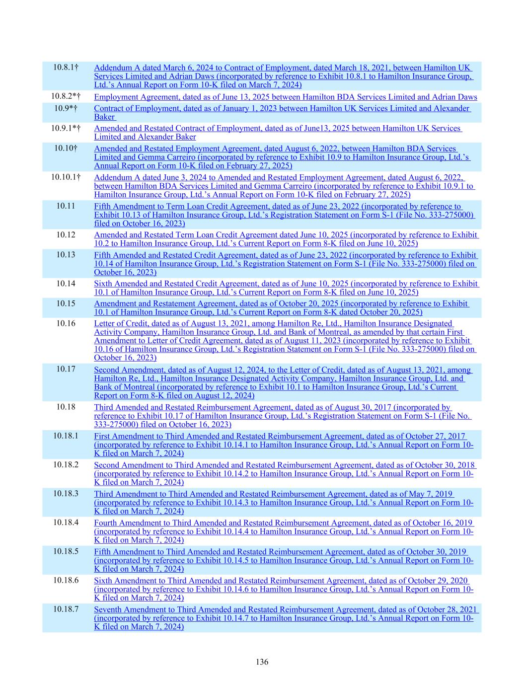 10.8.1† Addendum A dated March 6, 2024 to Contract of Employment, dated March 18, 2021, between Hamilton UK Services Limited and Adrian Daws (incorporated by reference to Exhibit 10.8.1 to Hamilton Insurance Group, Ltd.’s Annual Report on Form 10-K filed on March 7, 2024) 10.8.2*† Employment Agreement, dated as of June 13, 2025 between Hamilton BDA Services Limited and Adrian Daws 10.9*† Contract of Employment, dated as of January 1, 2023 between Hamilton UK Services Limited and Alexander Baker 10.9.1*† Amended and Restated Contract of Employment, dated as of June13, 2025 between Hamilton UK Services Limited and Alexander Baker 10.10† Amended and Restated Employment Agreement, dated August 6, 2022, between Hamilton BDA Services Limited and Gemma Carreiro (incorporated by reference to Exhibit 10.9 to Hamilton Insurance Group, Ltd.’s Annual Report on Form 10-K filed on February 27, 2025) 10.10.1† Addendum A dated June 3, 2024 to Amended and Restated Employment Agreement, dated August 6, 2022, between Hamilton BDA Services Limited and Gemma Carreiro (incorporated by reference to Exhibit 10.9.1 to Hamilton Insurance Group, Ltd.’s Annual Report on Form 10-K filed on February 27, 2025) 10.11 Fifth Amendment to Term Loan Credit Agreement, dated as of June 23, 2022 (incorporated by reference to Exhibit 10.13 of Hamilton Insurance Group, Ltd.’s Registration Statement on Form S-1 (File No. 333-275000) filed on October 16, 2023) 10.12 Amended and Restated Term Loan Credit Agreement dated June 10, 2025 (incorporated by reference to Exhibit 10.2 to Hamilton Insurance Group, Ltd.’s Current Report on Form 8-K filed on June 10, 2025) 10.13 Fifth Amended and Restated Credit Agreement, dated as of June 23, 2022 (incorporated by reference to Exhibit 10.14 of Hamilton Insurance Group, Ltd.’s Registration Statement on Form S-1 (File No. 333-275000) filed on October 16, 2023) 10.14 Sixth Amended and Restated Credit Agreement, dated as of June 10, 2025 (incorporated by reference to Exhibit 10.1 of Hamilton Insurance Group, Ltd.’s Current Report on Form 8-K filed on June 10, 2025) 10.15 Amendment and Restatement Agreement, dated as of October 20, 2025 (incorporated by reference to Exhibit 10.1 of Hamilton Insurance Group, Ltd.’s Current Report on Form 8-K dated October 20, 2025) 10.16 Letter of Credit, dated as of August 13, 2021, among Hamilton Re, Ltd., Hamilton Insurance Designated Activity Company, Hamilton Insurance Group, Ltd. and Bank of Montreal, as amended by that certain First Amendment to Letter of Credit Agreement, dated as of August 11, 2023 (incorporated by reference to Exhibit 10.16 of Hamilton Insurance Group, Ltd.’s Registration Statement on Form S-1 (File No. 333-275000) filed on October 16, 2023) 10.17 Second Amendment, dated as of August 12, 2024, to the Letter of Credit, dated as of August 13, 2021, among Hamilton Re, Ltd., Hamilton Insurance Designated Activity Company, Hamilton Insurance Group, Ltd. and Bank of Montreal (incorporated by reference to Exhibit 10.1 to Hamilton Insurance Group, Ltd.’s Current Report on Form 8-K filed on August 12, 2024) 10.18 Third Amended and Restated Reimbursement Agreement, dated as of August 30, 2017 (incorporated by reference to Exhibit 10.17 of Hamilton Insurance Group, Ltd.’s Registration Statement on Form S-1 (File No. 333-275000) filed on October 16, 2023) 10.18.1 First Amendment to Third Amended and Restated Reimbursement Agreement, dated as of October 27, 2017 (incorporated by reference to Exhibit 10.14.1 to Hamilton Insurance Group, Ltd.’s Annual Report on Form 10- K filed on March 7, 2024) 10.18.2 Second Amendment to Third Amended and Restated Reimbursement Agreement, dated as of October 30, 2018 (incorporated by reference to Exhibit 10.14.2 to Hamilton Insurance Group, Ltd.’s Annual Report on Form 10- K filed on March 7, 2024) 10.18.3 Third Amendment to Third Amended and Restated Reimbursement Agreement, dated as of May 7, 2019 (incorporated by reference to Exhibit 10.14.3 to Hamilton Insurance Group, Ltd.’s Annual Report on Form 10- K filed on March 7, 2024) 10.18.4 Fourth Amendment to Third Amended and Restated Reimbursement Agreement, dated as of October 16, 2019 (incorporated by reference to Exhibit 10.14.4 to Hamilton Insurance Group, Ltd.’s Annual Report on Form 10- K filed on March 7, 2024) 10.18.5 Fifth Amendment to Third Amended and Restated Reimbursement Agreement, dated as of October 30, 2019 (incorporated by reference to Exhibit 10.14.5 to Hamilton Insurance Group, Ltd.’s Annual Report on Form 10- K filed on March 7, 2024) 10.18.6 Sixth Amendment to Third Amended and Restated Reimbursement Agreement, dated as of October 29, 2020 (incorporated by reference to Exhibit 10.14.6 to Hamilton Insurance Group, Ltd.’s Annual Report on Form 10- K filed on March 7, 2024) 10.18.7 Seventh Amendment to Third Amended and Restated Reimbursement Agreement, dated as of October 28, 2021 (incorporated by reference to Exhibit 10.14.7 to Hamilton Insurance Group, Ltd.’s Annual Report on Form 10- K filed on March 7, 2024) 136