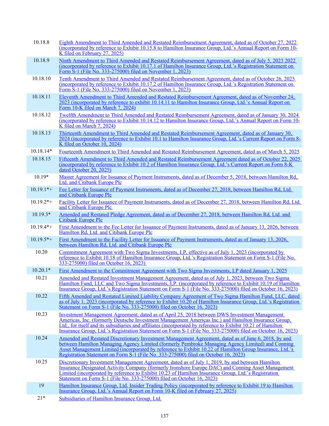 10.18.8 Eighth Amendment to Third Amended and Restated Reimbursement Agreement, dated as of October 27, 2022 (incorporated by reference to Exhibit 10.15.8 to Hamilton Insurance Group, Ltd.’s Annual Report on Form 10- K filed on February 27, 2025) 10.18.9 Ninth Amendment to Third Amended and Restated Reimbursement Agreement, dated as of July 5, 2023 2022 (incorporated by reference to Exhibit 10.17.1 of Hamilton Insurance Group, Ltd.’s Registration Statement on Form S-1 (File No. 333-275000) filed on November 1, 2023) 10.18.10 Tenth Amendment to Third Amended and Restated Reimbursement Agreement, dated as of October 26, 2023 (incorporated by reference to Exhibit 10.17.2 of Hamilton Insurance Group, Ltd.’s Registration Statement on Form S-1 (File No. 333-275000) filed on November 1, 2023) 10.18.11 Eleventh Amendment to Third Amended and Restated Reimbursement Agreement, dated as of November 24, 2023 (incorporated by reference to exhibit 10.14.11 to Hamilton Insurance Group, Ltd.’s Annual Report on Form 10-K filed on March 7, 2024) 10.18.12 Twelfth Amendment to Third Amended and Restated Reimbursement Agreement, dated as of January 30, 2024 (incorporated by reference to Exhibit 10.14.12 to Hamilton Insurance Group, Ltd.’s Annual Report on Form 10- K filed on March 7, 2024) 10.18.13 Thirteenth Amendment to Third Amended and Restated Reimbursement Agreement, dated as of January 30, 2024 (incorporated by reference to Exhibit 10.1 to Hamilton Insurance Group, Ltd.’s Current Report on Form 8- K filed on October 10, 2024) 10.18.14* Fourteenth Amendment to Third Amended and Restated Reimbursement Agreement, dated as of March 5, 2025 10.18.15 Fifteenth Amendment to Third Amended and Restated Reimbursement Agreement dated as of October 22, 2025 (incorporated by reference to Exhibit 10.2 of Hamilton Insurance Group, Ltd.’s Current Report on Form 8-K dated October 20, 2025) 10.19* Master Agreement for Issuance of Payment Instruments, dated as of December 5, 2018, between Hamilton Rd, Ltd. and Citibank Europe Plc 10.19.1*+ Fee Letter for Issuance of Payment Instruments, dated as of December 27, 2018, between Hamilton Rd, Ltd. and Citibank Europe Plc 10.19.2*+ Facility Letter for Issuance of Payment Instruments, dated as of December 27, 2018, between Hamilton Rd, Ltd. and Citibank Europe Plc 10.19.3* Amended and Restated Pledge Agreement, dated as of December 27, 2018, between Hamilton Rd, Ltd. and Citibank Europe Plc 10.19.4*+ First Amendment to the Fee Letter for Issuance of Payment Instruments, dated as of January 13, 2026, between Hamilton Rd, Ltd. and Citibank Europe Plc 10.19.5*+ First Amendment to the Facility Letter for Issuance of Payment Instruments, dated as of January 13, 2026, between Hamilton Rd, Ltd. and Citibank Europe Plc 10.20 Commitment Agreement with Two Sigma Investments, LP, effective as of July 1, 2023 (incorporated by reference to Exhibit 10.18 of Hamilton Insurance Group, Ltd.’s Registration Statement on Form S-1 (File No. 333-275000) filed on October 16, 2023) 10.20.1* First Amendment to the Commitment Agreement with Two Sigma Investments, LP dated January 1, 2025 10.21 Amended and Restated Investment Management Agreement, dated as of July 1, 2023, between Two Sigma Hamilton Fund, LLC and Two Sigma Investments, LP. (incorporated by reference to Exhibit 10.19 of Hamilton Insurance Group, Ltd.’s Registration Statement on Form S-1 (File No. 333-275000) filed on October 16, 2023) 10.22 Fifth Amended and Restated Limited Liability Company Agreement of Two Sigma Hamilton Fund, LLC, dated as of July 1, 2023 (incorporated by reference to Exhibit 10.20 of Hamilton Insurance Group, Ltd.’s Registration Statement on Form S-1 (File No. 333-275000) filed on October 16, 2023) 10.23 Investment Management Agreement, dated as of April 25, 2018 between DWS Investment Management Americas, Inc. (formerly Deutsche Investment Management Americas Inc.) and Hamilton Insurance Group, Ltd., for itself and its subsidiaries and affiliates (incorporated by reference to Exhibit 10.21 of Hamilton Insurance Group, Ltd.’s Registration Statement on Form S-1 (File No. 333-275000) filed on October 16, 2023) 10.24 Amended and Restated Discretionary Investment Management Agreement, dated as of June 6, 2018, by and between Hamilton Managing Agency Limited (formerly Pembroke Managing Agency Limited) and Conning Asset Management Limited (incorporated by reference to Exhibit 10.22 of Hamilton Group Insurance, Ltd.’s Registration Statement on Form S-1 (File No. 333-275000) filed on October 16, 2023) 10.25 Discretionary Investment Management Agreement, dated as of July 1, 2019, by and between Hamilton Insurance Designated Activity Company (formerly Ironshore Europe DAC) and Conning Asset Management Limited (incorporated by reference to Exhibit 10.23 of Hamilton Insurance Group, Ltd.’s Registration Statement on Form S-1 (File No. 333-275000) filed on October 16, 2023) 19 Hamilton Insurance Group, Ltd. Insider Trading Policy (incorporated by reference to Exhibit 19 to Hamilton Insurance Group, Ltd.’s Annual Report on Form 10-K filed on February 27, 2025) 21* Subsidiaries of Hamilton Insurance Group, Ltd. 137