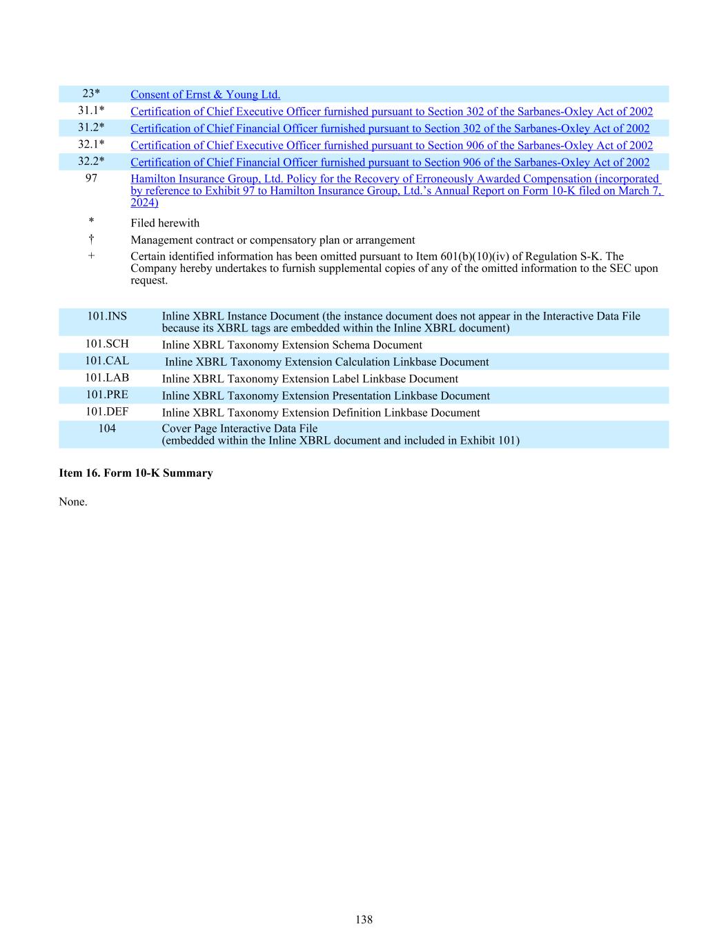 23* Consent of Ernst & Young Ltd. 31.1* Certification of Chief Executive Officer furnished pursuant to Section 302 of the Sarbanes-Oxley Act of 2002 31.2* Certification of Chief Financial Officer furnished pursuant to Section 302 of the Sarbanes-Oxley Act of 2002 32.1* Certification of Chief Executive Officer furnished pursuant to Section 906 of the Sarbanes-Oxley Act of 2002 32.2* Certification of Chief Financial Officer furnished pursuant to Section 906 of the Sarbanes-Oxley Act of 2002 97 Hamilton Insurance Group, Ltd. Policy for the Recovery of Erroneously Awarded Compensation (incorporated by reference to Exhibit 97 to Hamilton Insurance Group, Ltd.’s Annual Report on Form 10-K filed on March 7, 2024) * Filed herewith † Management contract or compensatory plan or arrangement + Certain identified information has been omitted pursuant to Item 601(b)(10)(iv) of Regulation S-K. The Company hereby undertakes to furnish supplemental copies of any of the omitted information to the SEC upon request. 101.INS Inline XBRL Instance Document (the instance document does not appear in the Interactive Data File because its XBRL tags are embedded within the Inline XBRL document) 101.SCH Inline XBRL Taxonomy Extension Schema Document 101.CAL Inline XBRL Taxonomy Extension Calculation Linkbase Document 101.LAB Inline XBRL Taxonomy Extension Label Linkbase Document 101.PRE Inline XBRL Taxonomy Extension Presentation Linkbase Document 101.DEF Inline XBRL Taxonomy Extension Definition Linkbase Document 104 Cover Page Interactive Data File (embedded within the Inline XBRL document and included in Exhibit 101) Item 16. Form 10-K Summary None. 138