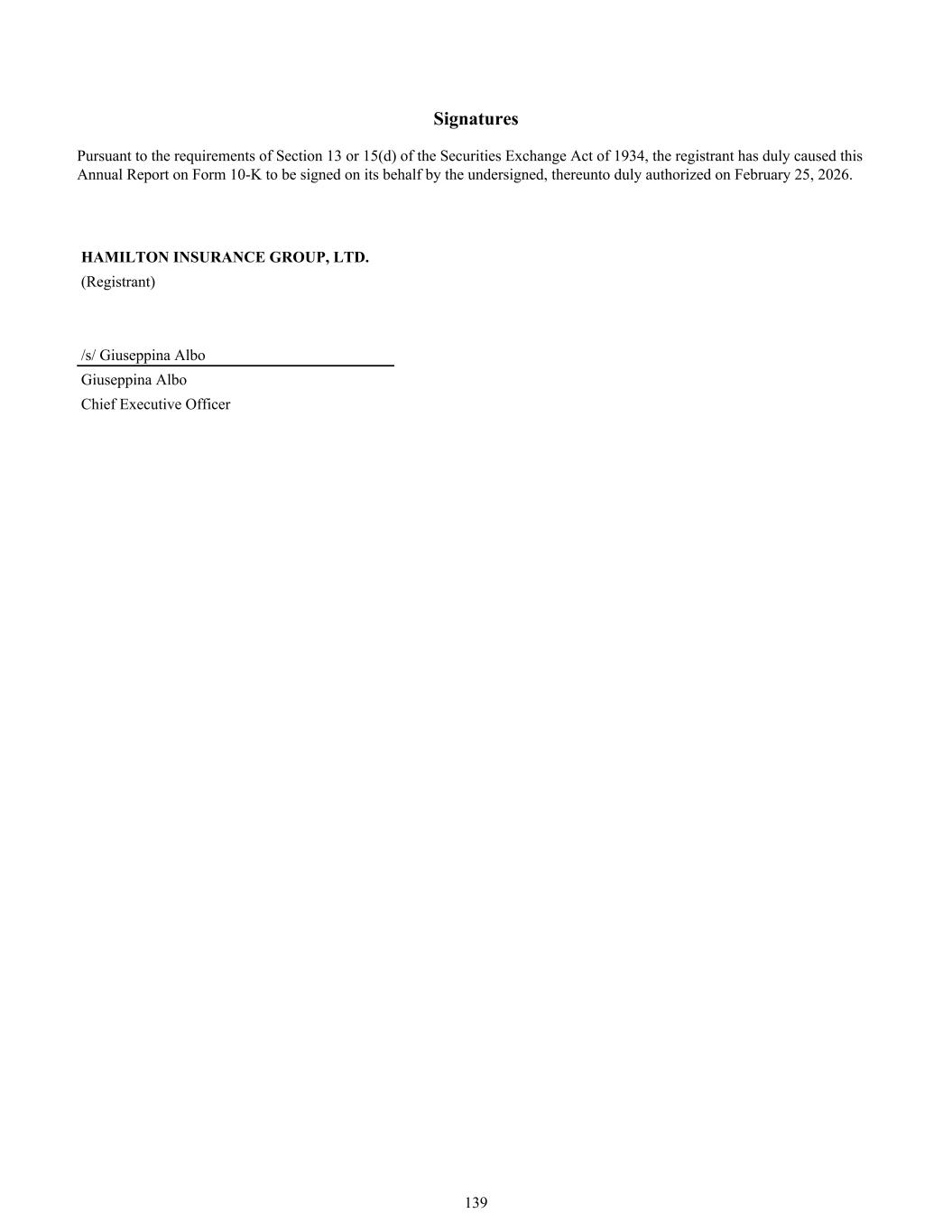 Signatures Pursuant to the requirements of Section 13 or 15(d) of the Securities Exchange Act of 1934, the registrant has duly caused this Annual Report on Form 10-K to be signed on its behalf by the undersigned, thereunto duly authorized on February 25, 2026. HAMILTON INSURANCE GROUP, LTD. (Registrant) /s/ Giuseppina Albo Giuseppina Albo Chief Executive Officer 139