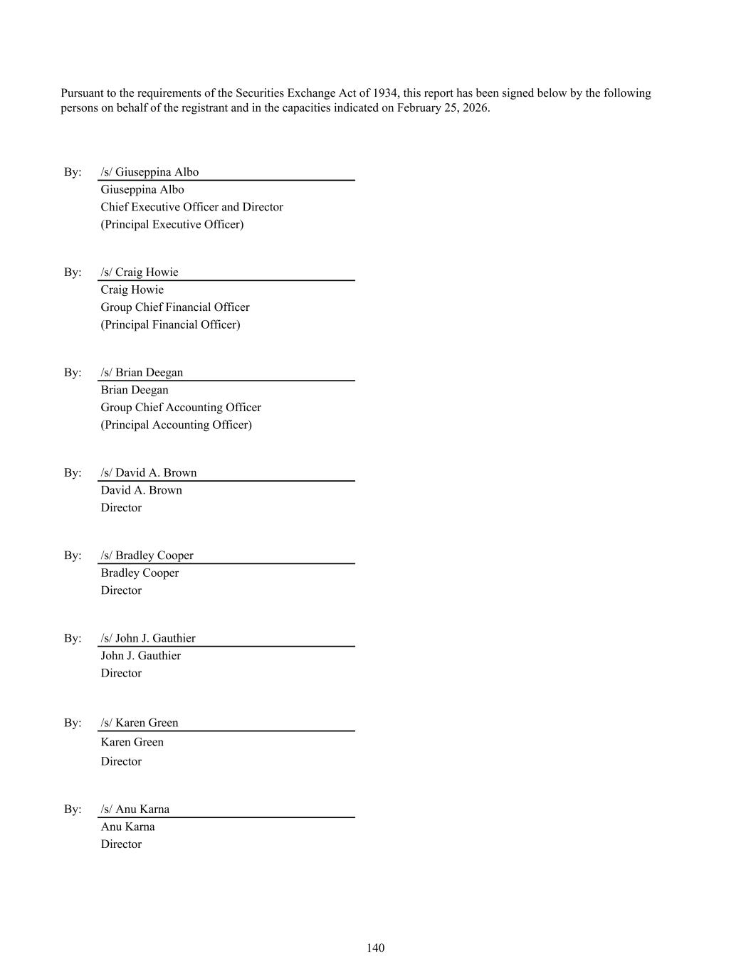 Pursuant to the requirements of the Securities Exchange Act of 1934, this report has been signed below by the following persons on behalf of the registrant and in the capacities indicated on February 25, 2026. By: /s/ Giuseppina Albo Giuseppina Albo Chief Executive Officer and Director (Principal Executive Officer) By: /s/ Craig Howie Craig Howie Group Chief Financial Officer (Principal Financial Officer) By: /s/ Brian Deegan Brian Deegan Group Chief Accounting Officer (Principal Accounting Officer) By: /s/ David A. Brown David A. Brown Director By: /s/ Bradley Cooper Bradley Cooper Director By: /s/ John J. Gauthier John J. Gauthier Director By: /s/ Karen Green Karen Green Director By: /s/ Anu Karna Anu Karna Director 140
