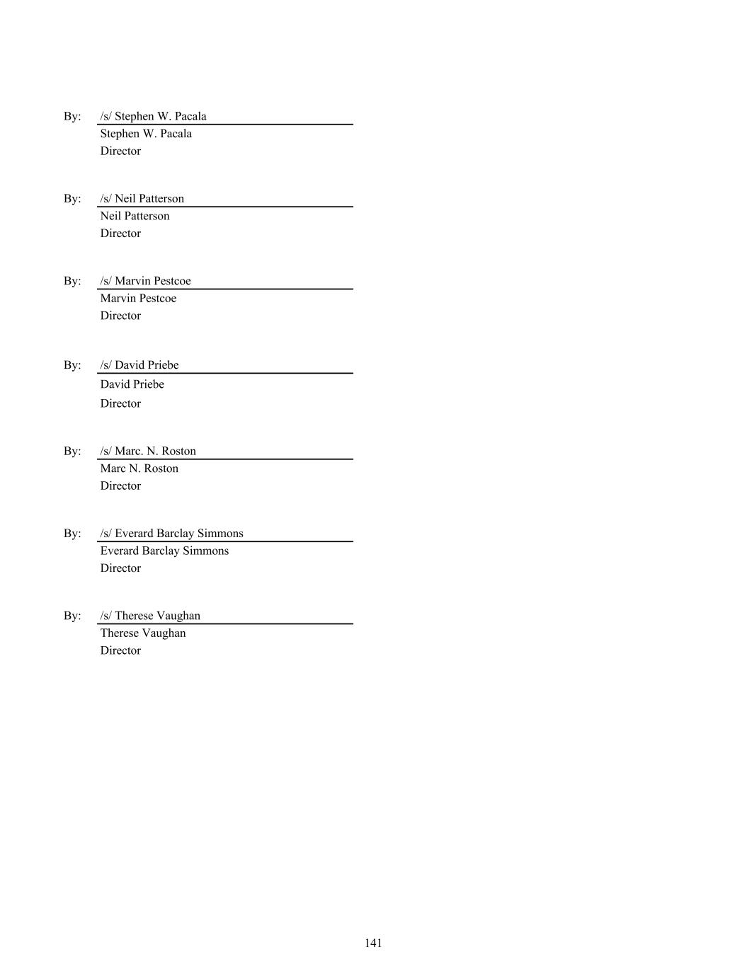 By: /s/ Stephen W. Pacala Stephen W. Pacala Director By: /s/ Neil Patterson Neil Patterson Director By: /s/ Marvin Pestcoe Marvin Pestcoe Director By: /s/ David Priebe David Priebe Director By: /s/ Marc. N. Roston Marc N. Roston Director By: /s/ Everard Barclay Simmons Everard Barclay Simmons Director By: /s/ Therese Vaughan Therese Vaughan Director 141