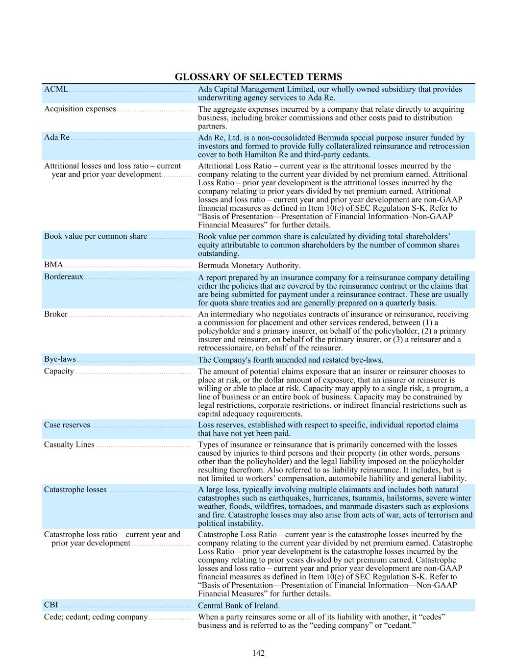 GLOSSARY OF SELECTED TERMS ACML .......................................................... Ada Capital Management Limited, our wholly owned subsidiary that provides underwriting agency services to Ada Re. Acquisition expenses ................................... The aggregate expenses incurred by a company that relate directly to acquiring business, including broker commissions and other costs paid to distribution partners. Ada Re ......................................................... Ada Re, Ltd. is a non-consolidated Bermuda special purpose insurer funded by investors and formed to provide fully collateralized reinsurance and retrocession cover to both Hamilton Re and third-party cedants. Attritional losses and loss ratio – current year and prior year development .............. Attritional Loss Ratio – current year is the attritional losses incurred by the company relating to the current year divided by net premium earned. Attritional Loss Ratio – prior year development is the attritional losses incurred by the company relating to prior years divided by net premium earned. Attritional losses and loss ratio – current year and prior year development are non-GAAP financial measures as defined in Item 10(e) of SEC Regulation S-K. Refer to “Basis of Presentation—Presentation of Financial Information–Non-GAAP Financial Measures” for further details. Book value per common share .................... Book value per common share is calculated by dividing total shareholders’ equity attributable to common shareholders by the number of common shares outstanding. BMA ............................................................ Bermuda Monetary Authority. Bordereaux .................................................. A report prepared by an insurance company for a reinsurance company detailing either the policies that are covered by the reinsurance contract or the claims that are being submitted for payment under a reinsurance contract. These are usually for quota share treaties and are generally prepared on a quarterly basis. Broker .......................................................... An intermediary who negotiates contracts of insurance or reinsurance, receiving a commission for placement and other services rendered, between (1) a policyholder and a primary insurer, on behalf of the policyholder, (2) a primary insurer and reinsurer, on behalf of the primary insurer, or (3) a reinsurer and a retrocessionaire, on behalf of the reinsurer. Bye-laws ...................................................... The Company's fourth amended and restated bye-laws. Capacity ....................................................... The amount of potential claims exposure that an insurer or reinsurer chooses to place at risk, or the dollar amount of exposure, that an insurer or reinsurer is willing or able to place at risk. Capacity may apply to a single risk, a program, a line of business or an entire book of business. Capacity may be constrained by legal restrictions, corporate restrictions, or indirect financial restrictions such as capital adequacy requirements. Case reserves ............................................... Loss reserves, established with respect to specific, individual reported claims that have not yet been paid. Casualty Lines ............................................. Types of insurance or reinsurance that is primarily concerned with the losses caused by injuries to third persons and their property (in other words, persons other than the policyholder) and the legal liability imposed on the policyholder resulting therefrom. Also referred to as liability reinsurance. It includes, but is not limited to workers’ compensation, automobile liability and general liability. Catastrophe losses ....................................... A large loss, typically involving multiple claimants and includes both natural catastrophes such as earthquakes, hurricanes, tsunamis, hailstorms, severe winter weather, floods, wildfires, tornadoes, and manmade disasters such as explosions and fire. Catastrophe losses may also arise from acts of war, acts of terrorism and political instability. Catastrophe loss ratio – current year and prior year development ............................ Catastrophe Loss Ratio – current year is the catastrophe losses incurred by the company relating to the current year divided by net premium earned. Catastrophe Loss Ratio – prior year development is the catastrophe losses incurred by the company relating to prior years divided by net premium earned. Catastrophe losses and loss ratio – current year and prior year development are non-GAAP financial measures as defined in Item 10(e) of SEC Regulation S-K. Refer to “Basis of Presentation—Presentation of Financial Information—Non-GAAP Financial Measures” for further details. CBI .............................................................. Central Bank of Ireland. Cede; cedant; ceding company .................... When a party reinsures some or all of its liability with another, it “cedes” business and is referred to as the “ceding company” or “cedant.” 142