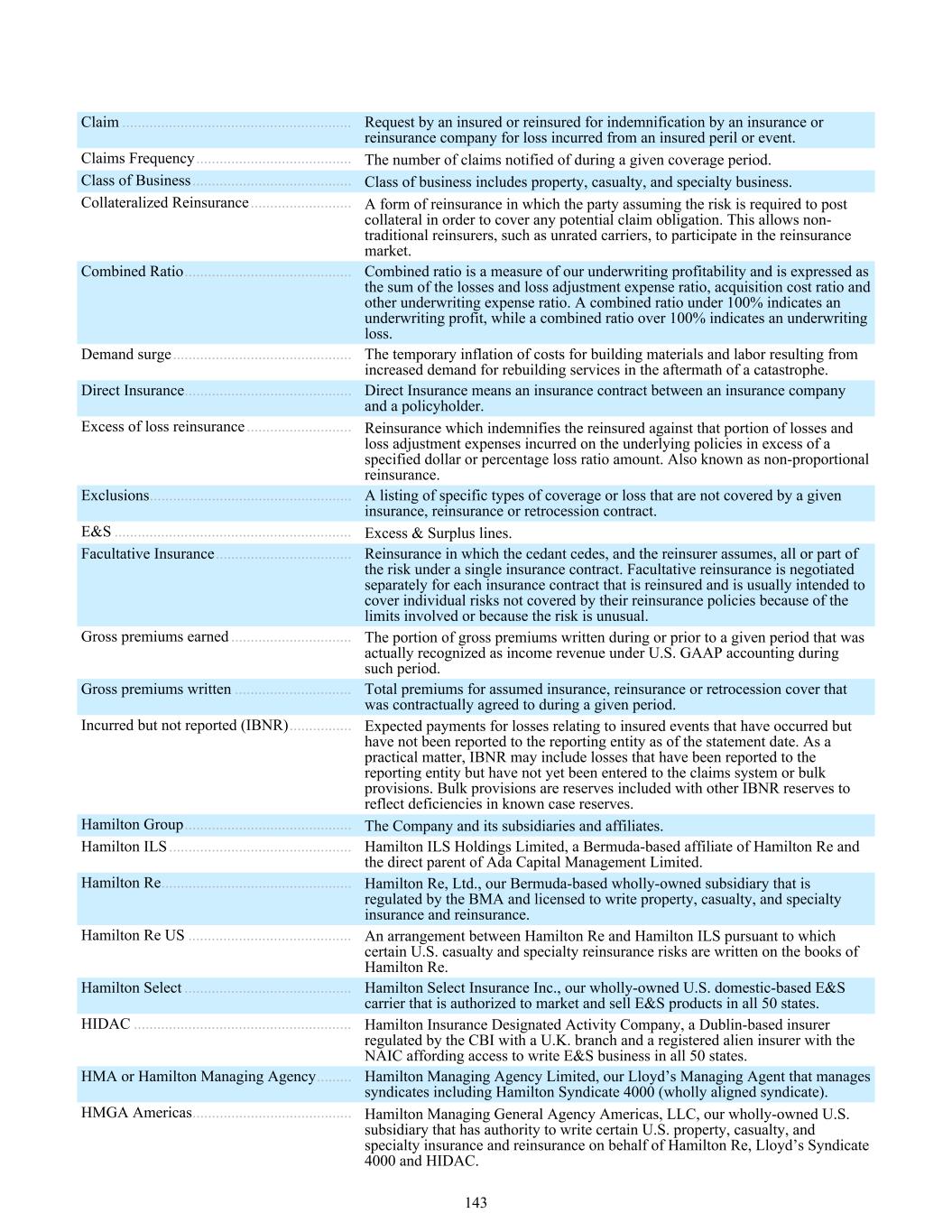Claim ........................................................... Request by an insured or reinsured for indemnification by an insurance or reinsurance company for loss incurred from an insured peril or event. Claims Frequency ........................................ The number of claims notified of during a given coverage period. Class of Business ......................................... Class of business includes property, casualty, and specialty business. Collateralized Reinsurance .......................... A form of reinsurance in which the party assuming the risk is required to post collateral in order to cover any potential claim obligation. This allows non- traditional reinsurers, such as unrated carriers, to participate in the reinsurance market. Combined Ratio ........................................... Combined ratio is a measure of our underwriting profitability and is expressed as the sum of the losses and loss adjustment expense ratio, acquisition cost ratio and other underwriting expense ratio. A combined ratio under 100% indicates an underwriting profit, while a combined ratio over 100% indicates an underwriting loss. Demand surge .............................................. The temporary inflation of costs for building materials and labor resulting from increased demand for rebuilding services in the aftermath of a catastrophe. Direct Insurance ........................................... Direct Insurance means an insurance contract between an insurance company and a policyholder. Excess of loss reinsurance ........................... Reinsurance which indemnifies the reinsured against that portion of losses and loss adjustment expenses incurred on the underlying policies in excess of a specified dollar or percentage loss ratio amount. Also known as non-proportional reinsurance. Exclusions .................................................... A listing of specific types of coverage or loss that are not covered by a given insurance, reinsurance or retrocession contract. E&S ............................................................. Excess & Surplus lines. Facultative Insurance ................................... Reinsurance in which the cedant cedes, and the reinsurer assumes, all or part of the risk under a single insurance contract. Facultative reinsurance is negotiated separately for each insurance contract that is reinsured and is usually intended to cover individual risks not covered by their reinsurance policies because of the limits involved or because the risk is unusual. Gross premiums earned ............................... The portion of gross premiums written during or prior to a given period that was actually recognized as income revenue under U.S. GAAP accounting during such period. Gross premiums written .............................. Total premiums for assumed insurance, reinsurance or retrocession cover that was contractually agreed to during a given period. Incurred but not reported (IBNR) ................ Expected payments for losses relating to insured events that have occurred but have not been reported to the reporting entity as of the statement date. As a practical matter, IBNR may include losses that have been reported to the reporting entity but have not yet been entered to the claims system or bulk provisions. Bulk provisions are reserves included with other IBNR reserves to reflect deficiencies in known case reserves. Hamilton Group ........................................... The Company and its subsidiaries and affiliates. Hamilton ILS ............................................... Hamilton ILS Holdings Limited, a Bermuda-based affiliate of Hamilton Re and the direct parent of Ada Capital Management Limited. Hamilton Re ................................................. Hamilton Re, Ltd., our Bermuda-based wholly-owned subsidiary that is regulated by the BMA and licensed to write property, casualty, and specialty insurance and reinsurance. Hamilton Re US .......................................... An arrangement between Hamilton Re and Hamilton ILS pursuant to which certain U.S. casualty and specialty reinsurance risks are written on the books of Hamilton Re. Hamilton Select ........................................... Hamilton Select Insurance Inc., our wholly-owned U.S. domestic-based E&S carrier that is authorized to market and sell E&S products in all 50 states. HIDAC ........................................................ Hamilton Insurance Designated Activity Company, a Dublin-based insurer regulated by the CBI with a U.K. branch and a registered alien insurer with the NAIC affording access to write E&S business in all 50 states. HMA or Hamilton Managing Agency ......... Hamilton Managing Agency Limited, our Lloyd’s Managing Agent that manages syndicates including Hamilton Syndicate 4000 (wholly aligned syndicate). HMGA Americas ......................................... Hamilton Managing General Agency Americas, LLC, our wholly-owned U.S. subsidiary that has authority to write certain U.S. property, casualty, and specialty insurance and reinsurance on behalf of Hamilton Re, Lloyd’s Syndicate 4000 and HIDAC. 143