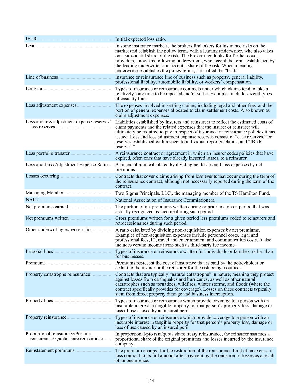 IELR ............................................................ Initial expected loss ratio. Lead ............................................................. In some insurance markets, the brokers find takers for insurance risks on the market and establish the policy terms with a leading underwriter, who also takes on a substantial share of the risk. The broker then looks for further cover providers, known as following underwriters, who accept the terms established by the leading underwriter and accept a share of the risk. When a leading underwriter establishes the policy terms, it is called the “lead.” Line of business ........................................... Insurance or reinsurance line of business such as property, general liability, professional liability, automobile liability, or workers’ compensation. Long tail ....................................................... Types of insurance or reinsurance contracts under which claims tend to take a relatively long time to be reported and/or settle. Examples include several types of casualty lines. Loss adjustment expenses ............................ The expenses involved in settling claims, including legal and other fees, and the portion of general expenses allocated to claim settlement costs. Also known as claim adjustment expenses. Loss and loss adjustment expense reserves/ loss reserves ............................................. Liabilities established by insurers and reinsurers to reflect the estimated costs of claim payments and the related expenses that the insurer or reinsurer will ultimately be required to pay in respect of insurance or reinsurance policies it has issued. Loss and loss adjustment expense reserves consist of “case reserves,” or reserves established with respect to individual reported claims, and “IBNR reserves.” Loss portfolio transfer ................................. A reinsurance contract or agreement in which an insurer cedes policies that have expired, often ones that have already incurred losses, to a reinsurer. Loss and Loss Adjustment Expense Ratio .. A financial ratio calculated by dividing net losses and loss expenses by net premiums. Losses occurring .......................................... Contracts that cover claims arising from loss events that occur during the term of the reinsurance contract, although not necessarily reported during the term of the contract. Managing Member ...................................... Two Sigma Principals, LLC., the managing member of the TS Hamilton Fund. NAIC ........................................................... National Association of Insurance Commissioners. Net premiums earned ................................... The portion of net premiums written during or prior to a given period that was actually recognized as income during such period. Net premiums written .................................. Gross premiums written for a given period less premiums ceded to reinsurers and retrocessionaires during such period. Other underwriting expense ratio ................ A ratio calculated by dividing non-acquisition expenses by net premiums. Examples of non-acquisition expenses include personnel costs, legal and professional fees, IT, travel and entertainment and communication costs. It also includes certain income items such as third-party fee income. Personal lines ............................................... Types of insurance or reinsurance written for individuals or families, rather than for businesses. Premiums ..................................................... Premiums represent the cost of insurance that is paid by the policyholder or cedant to the insurer or the reinsurer for the risk being assumed. Property catastrophe reinsurance ................. Contracts that are typically “natural catastrophe” in nature, meaning they protect against losses from earthquakes and hurricanes, as well as other natural catastrophes such as tornadoes, wildfires, winter storms, and floods (where the contract specifically provides for coverage). Losses on these contracts typically stem from direct property damage and business interruption. Property lines ............................................... Types of insurance or reinsurance which provide coverage to a person with an insurable interest in tangible property for that person’s property loss, damage or loss of use caused by an insured peril. Property reinsurance .................................... Types of insurance or reinsurance which provide coverage to a person with an insurable interest in tangible property for that person’s property loss, damage or loss of use caused by an insured peril. Proportional reinsurance/Pro rata reinsurance/ Quota share reinsurance ...... In proportional/pro rata/quota share treaty reinsurance, the reinsurer assumes a proportional share of the original premiums and losses incurred by the insurance company. Reinstatement premiums ............................. The premium charged for the restoration of the reinsurance limit of an excess of loss contract to its full amount after payment by the reinsurer of losses as a result of an occurrence. 144