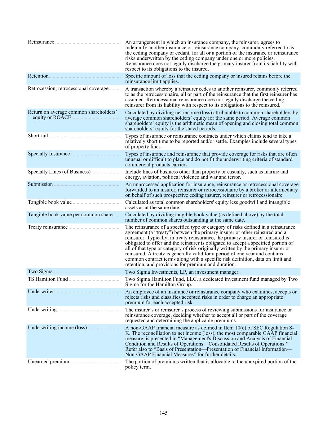 Reinsurance ................................................. An arrangement in which an insurance company, the reinsurer, agrees to indemnify another insurance or reinsurance company, commonly referred to as the ceding company or cedant, for all or a portion of the insurance or reinsurance risks underwritten by the ceding company under one or more policies. Reinsurance does not legally discharge the primary insurer from its liability with respect to its obligations to the insured. Retention ...................................................... Specific amount of loss that the ceding company or insured retains before the reinsurance limit applies. Retrocession; retrocessional coverage ......... A transaction whereby a reinsurer cedes to another reinsurer, commonly referred to as the retrocessionaire, all or part of the reinsurance that the first reinsurer has assumed. Retrocessional reinsurance does not legally discharge the ceding reinsurer from its liability with respect to its obligations to the reinsured. Return on average common shareholders’ equity or ROACE ..................................... Calculated by dividing net income (loss) attributable to common shareholders by average common shareholders’ equity for the same period. Average common shareholders’ equity is the arithmetic mean of opening and closing total common shareholders’ equity for the stated periods. Short-tail ...................................................... Types of insurance or reinsurance contracts under which claims tend to take a relatively short time to be reported and/or settle. Examples include several types of property lines. Specialty Insurance ...................................... Types of insurance and reinsurance that provide coverage for risks that are often unusual or difficult to place and do not fit the underwriting criteria of standard commercial products carriers. Specialty Lines (of Business) ...................... Include lines of business other than property or casualty, such as marine and energy, aviation, political violence and war and terror. Submission .................................................. An unprocessed application for insurance, reinsurance or retrocessional coverage forwarded to an insurer, reinsurer or retrocessionaire by a broker or intermediary on behalf of such prospective ceding insurer, reinsurer or retrocessionaire. Tangible book value .................................... Calculated as total common shareholders' equity less goodwill and intangible assets as at the same date. Tangible book value per common share ...... Calculated by dividing tangible book value (as defined above) by the total number of common shares outstanding at the same date. Treaty reinsurance ....................................... The reinsurance of a specified type or category of risks defined in a reinsurance agreement (a “treaty”) between the primary insurer or other reinsured and a reinsurer. Typically, in treaty reinsurance, the primary insurer or reinsured is obligated to offer and the reinsurer is obligated to accept a specified portion of all of that type or category of risk originally written by the primary insurer or reinsured. A treaty is generally valid for a period of one year and contains common contract terms along with a specific risk definition, data on limit and retention, and provisions for premium and duration. Two Sigma ................................................... Two Sigma Investments, LP, an investment manager. TS Hamilton Fund ....................................... Two Sigma Hamilton Fund, LLC, a dedicated investment fund managed by Two Sigma for the Hamilton Group. Underwriter .................................................. An employee of an insurance or reinsurance company who examines, accepts or rejects risks and classifies accepted risks in order to charge an appropriate premium for each accepted risk. Underwriting ................................................ The insurer’s or reinsurer’s process of reviewing submissions for insurance or reinsurance coverage, deciding whether to accept all or part of the coverage requested and determining the applicable premiums. Underwriting income (loss) ......................... A non-GAAP financial measure as defined in Item 10(e) of SEC Regulation S- K. The reconciliation to net income (loss), the most comparable GAAP financial measure, is presented in “Management's Discussion and Analysis of Financial Condition and Results of Operations—Consolidated Results of Operations.” Refer also to “Basis of Presentation—Presentation of Financial Information— Non-GAAP Financial Measures” for further details. Unearned premium ...................................... The portion of premiums written that is allocable to the unexpired portion of the policy term. 145