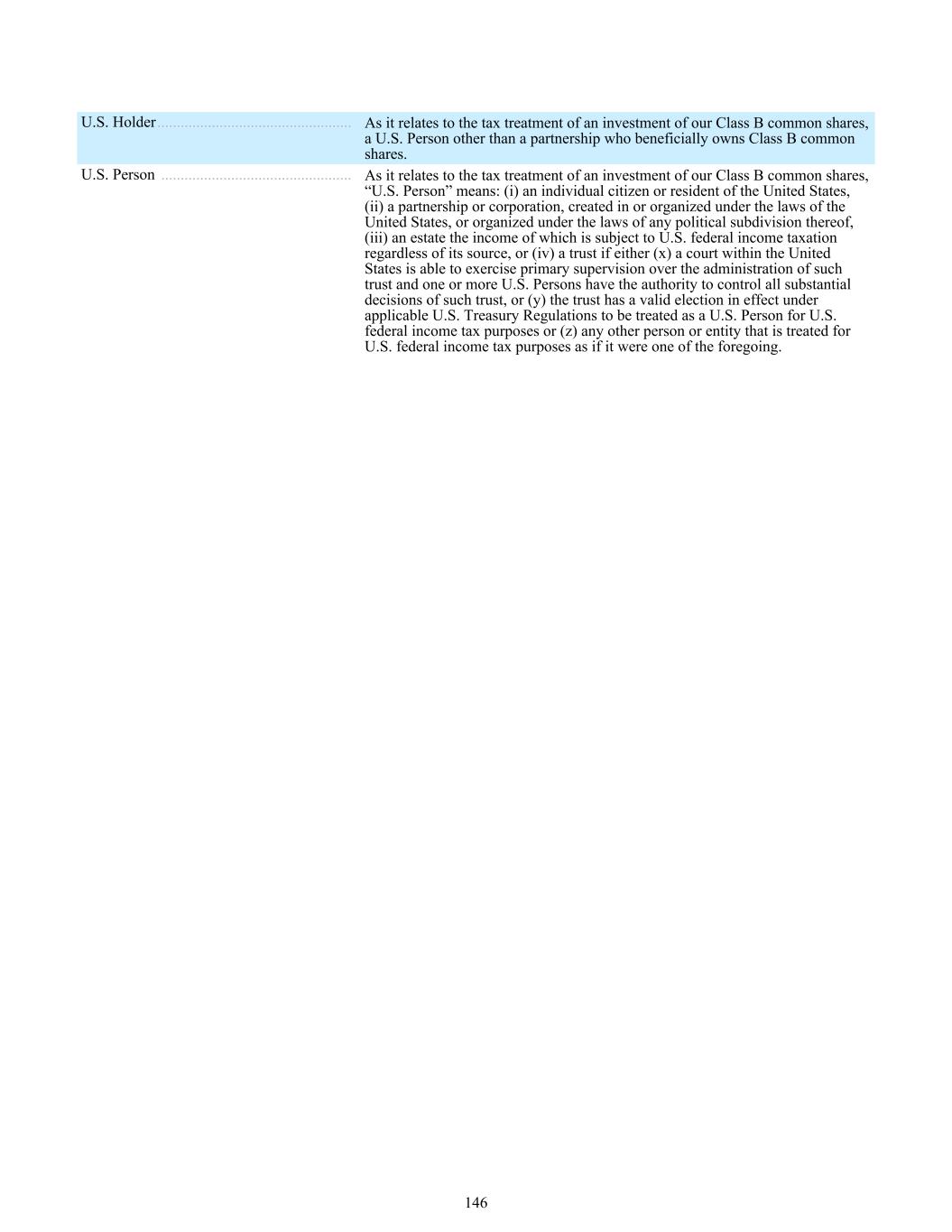 U.S. Holder .................................................. As it relates to the tax treatment of an investment of our Class B common shares, a U.S. Person other than a partnership who beneficially owns Class B common shares. U.S. Person ................................................. As it relates to the tax treatment of an investment of our Class B common shares, “U.S. Person” means: (i) an individual citizen or resident of the United States, (ii) a partnership or corporation, created in or organized under the laws of the United States, or organized under the laws of any political subdivision thereof, (iii) an estate the income of which is subject to U.S. federal income taxation regardless of its source, or (iv) a trust if either (x) a court within the United States is able to exercise primary supervision over the administration of such trust and one or more U.S. Persons have the authority to control all substantial decisions of such trust, or (y) the trust has a valid election in effect under applicable U.S. Treasury Regulations to be treated as a U.S. Person for U.S. federal income tax purposes or (z) any other person or entity that is treated for U.S. federal income tax purposes as if it were one of the foregoing. 146