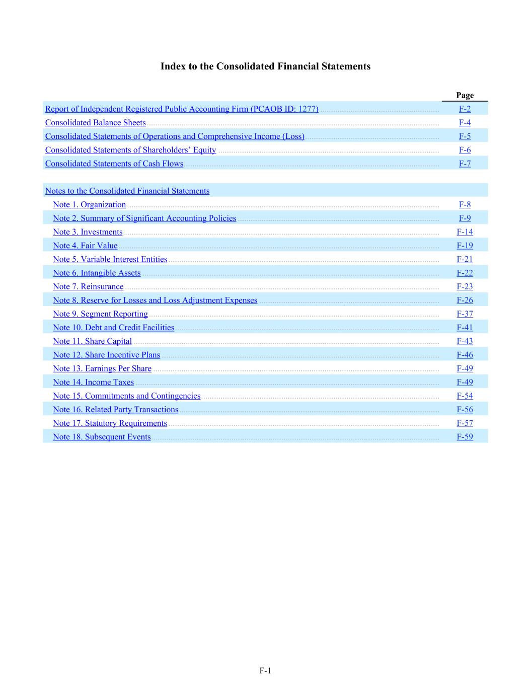 Index to the Consolidated Financial Statements Page Report of Independent Registered Public Accounting Firm (PCAOB ID: 1277) ....................................................... F-2 Consolidated Balance Sheets ....................................................................................................................................... F-4 Consolidated Statements of Operations and Comprehensive Income (Loss) .............................................................. F-5 Consolidated Statements of Shareholders’ Equity ...................................................................................................... F-6 Consolidated Statements of Cash Flows ...................................................................................................................... F-7 Notes to the Consolidated Financial Statements Note 1. Organization ................................................................................................................................................ F-8 Note 2. Summary of Significant Accounting Policies ............................................................................................. F-9 Note 3. Investments .................................................................................................................................................. F-14 Note 4. Fair Value .................................................................................................................................................... F-19 Note 5. Variable Interest Entities ............................................................................................................................. F-21 Note 6. Intangible Assets ......................................................................................................................................... F-22 Note 7. Reinsurance ................................................................................................................................................. F-23 Note 8. Reserve for Losses and Loss Adjustment Expenses ................................................................................... F-26 Note 9. Segment Reporting ...................................................................................................................................... F-37 Note 10. Debt and Credit Facilities .......................................................................................................................... F-41 Note 11. Share Capital ............................................................................................................................................. F-43 Note 12. Share Incentive Plans ................................................................................................................................ F-46 Note 13. Earnings Per Share .................................................................................................................................... F-49 Note 14. Income Taxes ............................................................................................................................................ F-49 Note 15. Commitments and Contingencies .............................................................................................................. F-54 Note 16. Related Party Transactions ........................................................................................................................ F-56 Note 17. Statutory Requirements ............................................................................................................................. F-57 Note 18. Subsequent Events ..................................................................................................................................... F-59 F-1