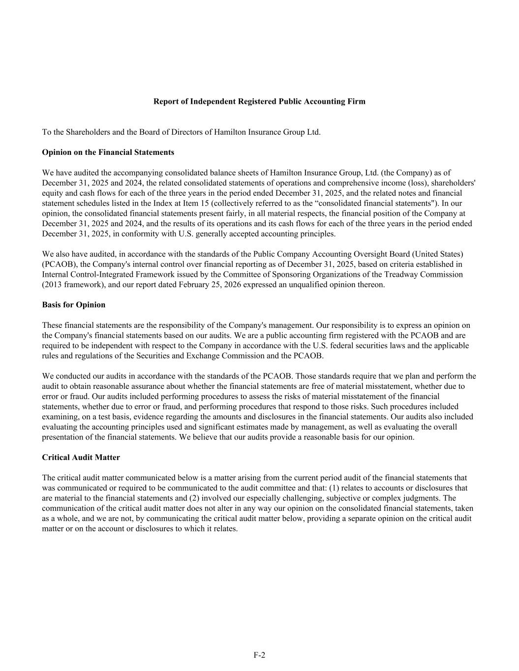 Report of Independent Registered Public Accounting Firm To the Shareholders and the Board of Directors of Hamilton Insurance Group Ltd. Opinion on the Financial Statements We have audited the accompanying consolidated balance sheets of Hamilton Insurance Group, Ltd. (the Company) as of December 31, 2025 and 2024, the related consolidated statements of operations and comprehensive income (loss), shareholders' equity and cash flows for each of the three years in the period ended December 31, 2025, and the related notes and financial statement schedules listed in the Index at Item 15 (collectively referred to as the “consolidated financial statements"). In our opinion, the consolidated financial statements present fairly, in all material respects, the financial position of the Company at December 31, 2025 and 2024, and the results of its operations and its cash flows for each of the three years in the period ended December 31, 2025, in conformity with U.S. generally accepted accounting principles. We also have audited, in accordance with the standards of the Public Company Accounting Oversight Board (United States) (PCAOB), the Company's internal control over financial reporting as of December 31, 2025, based on criteria established in Internal Control-Integrated Framework issued by the Committee of Sponsoring Organizations of the Treadway Commission (2013 framework), and our report dated February 25, 2026 expressed an unqualified opinion thereon. Basis for Opinion These financial statements are the responsibility of the Company's management. Our responsibility is to express an opinion on the Company's financial statements based on our audits. We are a public accounting firm registered with the PCAOB and are required to be independent with respect to the Company in accordance with the U.S. federal securities laws and the applicable rules and regulations of the Securities and Exchange Commission and the PCAOB. We conducted our audits in accordance with the standards of the PCAOB. Those standards require that we plan and perform the audit to obtain reasonable assurance about whether the financial statements are free of material misstatement, whether due to error or fraud. Our audits included performing procedures to assess the risks of material misstatement of the financial statements, whether due to error or fraud, and performing procedures that respond to those risks. Such procedures included examining, on a test basis, evidence regarding the amounts and disclosures in the financial statements. Our audits also included evaluating the accounting principles used and significant estimates made by management, as well as evaluating the overall presentation of the financial statements. We believe that our audits provide a reasonable basis for our opinion. Critical Audit Matter The critical audit matter communicated below is a matter arising from the current period audit of the financial statements that was communicated or required to be communicated to the audit committee and that: (1) relates to accounts or disclosures that are material to the financial statements and (2) involved our especially challenging, subjective or complex judgments. The communication of the critical audit matter does not alter in any way our opinion on the consolidated financial statements, taken as a whole, and we are not, by communicating the critical audit matter below, providing a separate opinion on the critical audit matter or on the account or disclosures to which it relates. F-2