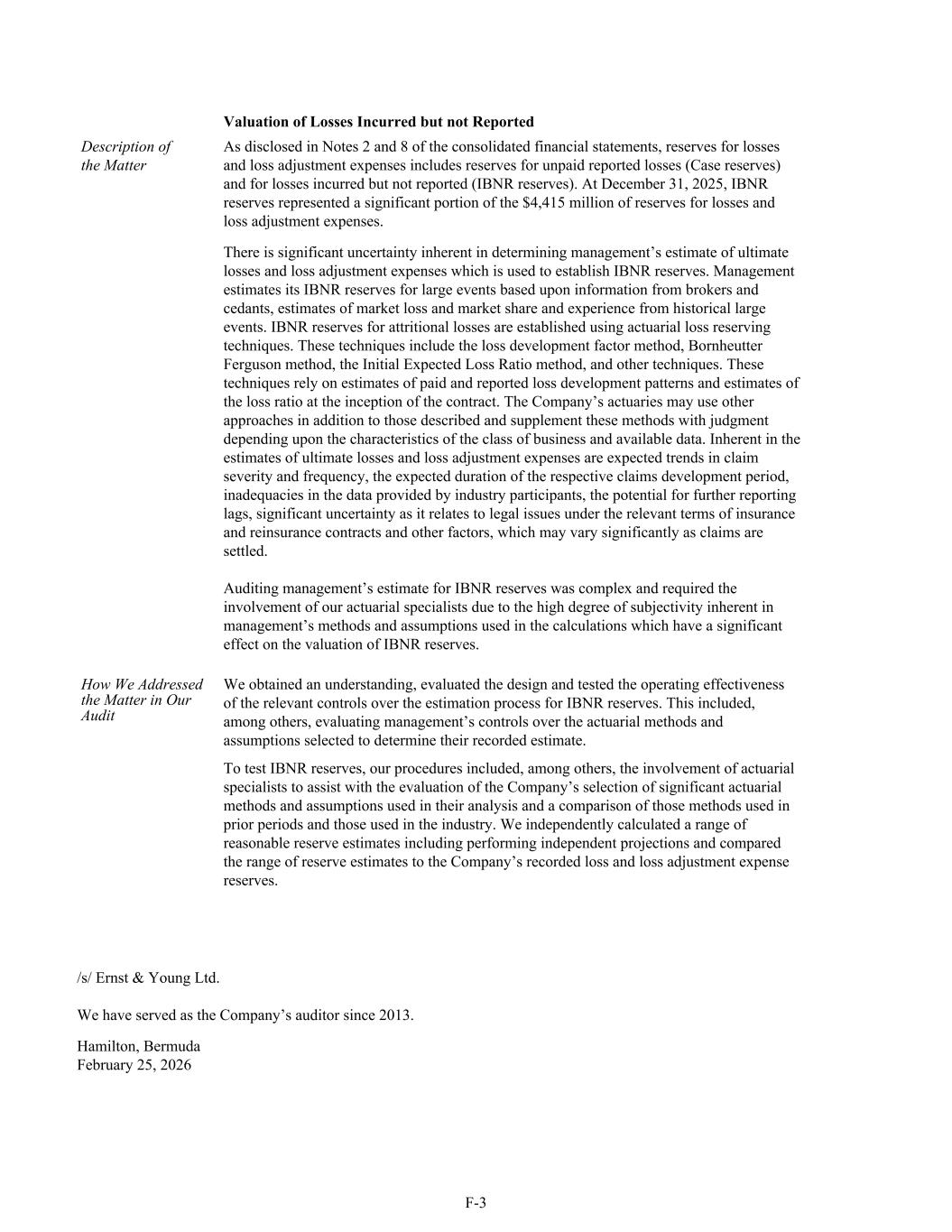 Valuation of Losses Incurred but not Reported Description of the Matter As disclosed in Notes 2 and 8 of the consolidated financial statements, reserves for losses and loss adjustment expenses includes reserves for unpaid reported losses (Case reserves) and for losses incurred but not reported (IBNR reserves). At December 31, 2025, IBNR reserves represented a significant portion of the $4,415 million of reserves for losses and loss adjustment expenses. There is significant uncertainty inherent in determining management’s estimate of ultimate losses and loss adjustment expenses which is used to establish IBNR reserves. Management estimates its IBNR reserves for large events based upon information from brokers and cedants, estimates of market loss and market share and experience from historical large events. IBNR reserves for attritional losses are established using actuarial loss reserving techniques. These techniques include the loss development factor method, Bornheutter Ferguson method, the Initial Expected Loss Ratio method, and other techniques. These techniques rely on estimates of paid and reported loss development patterns and estimates of the loss ratio at the inception of the contract. The Company’s actuaries may use other approaches in addition to those described and supplement these methods with judgment depending upon the characteristics of the class of business and available data. Inherent in the estimates of ultimate losses and loss adjustment expenses are expected trends in claim severity and frequency, the expected duration of the respective claims development period, inadequacies in the data provided by industry participants, the potential for further reporting lags, significant uncertainty as it relates to legal issues under the relevant terms of insurance and reinsurance contracts and other factors, which may vary significantly as claims are settled. Auditing management’s estimate for IBNR reserves was complex and required the involvement of our actuarial specialists due to the high degree of subjectivity inherent in management’s methods and assumptions used in the calculations which have a significant effect on the valuation of IBNR reserves. How We Addressed the Matter in Our Audit We obtained an understanding, evaluated the design and tested the operating effectiveness of the relevant controls over the estimation process for IBNR reserves. This included, among others, evaluating management’s controls over the actuarial methods and assumptions selected to determine their recorded estimate. To test IBNR reserves, our procedures included, among others, the involvement of actuarial specialists to assist with the evaluation of the Company’s selection of significant actuarial methods and assumptions used in their analysis and a comparison of those methods used in prior periods and those used in the industry. We independently calculated a range of reasonable reserve estimates including performing independent projections and compared the range of reserve estimates to the Company’s recorded loss and loss adjustment expense reserves. /s/ Ernst & Young Ltd. We have served as the Company’s auditor since 2013. Hamilton, Bermuda February 25, 2026 F-3