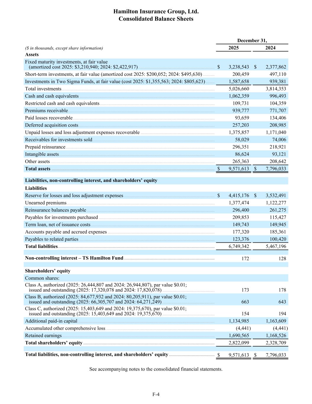 December 31, ($ in thousands, except share information) 2025 2024 Assets Fixed maturity investments, at fair value (amortized cost 2025: $3,210,940; 2024: $2,422,917) ............................................................ $ 3,238,543 $ 2,377,862 Short-term investments, at fair value (amortized cost 2025: $200,052; 2024: $495,630) ......... 200,459 497,110 Investments in Two Sigma Funds, at fair value (cost 2025: $1,355,563; 2024: $805,623) ....... 1,587,658 939,381 Total investments ........................................................................................................................ 5,026,660 3,814,353 Cash and cash equivalents .......................................................................................................... 1,062,359 996,493 Restricted cash and cash equivalents .......................................................................................... 109,731 104,359 Premiums receivable ................................................................................................................... 939,777 771,707 Paid losses recoverable ............................................................................................................... 93,659 134,406 Deferred acquisition costs ........................................................................................................... 257,203 208,985 Unpaid losses and loss adjustment expenses recoverable .......................................................... 1,375,857 1,171,040 Receivables for investments sold ................................................................................................ 58,029 74,006 Prepaid reinsurance ..................................................................................................................... 296,351 218,921 Intangible assets .......................................................................................................................... 86,624 93,121 Other assets ................................................................................................................................. 265,363 208,642 Total assets ................................................................................................................................ $ 9,571,613 $ 7,796,033 Liabilities, non-controlling interest, and shareholders’ equity Liabilities Reserve for losses and loss adjustment expenses ....................................................................... $ 4,415,176 $ 3,532,491 Unearned premiums .................................................................................................................... 1,377,474 1,122,277 Reinsurance balances payable .................................................................................................... 296,400 261,275 Payables for investments purchased ........................................................................................... 209,853 115,427 Term loan, net of issuance costs ................................................................................................. 149,743 149,945 Accounts payable and accrued expenses .................................................................................... 177,320 185,361 Payables to related parties .......................................................................................................... 123,376 100,420 Total liabilities ........................................................................................................................... 6,749,342 5,467,196 Non-controlling interest – TS Hamilton Fund ....................................................................... 172 128 Shareholders’ equity Common shares: Class A, authorized (2025: 26,444,807 and 2024: 26,944,807), par value $0.01; issued and outstanding (2025: 17,320,078 and 2024: 17,820,078) ......................................... 173 178 Class B, authorized (2025: 84,677,932 and 2024: 80,205,911), par value $0.01; issued and outstanding (2025: 66,305,707 and 2024: 64,271,249) ......................................... 663 643 Class C, authorized (2025: 15,403,649 and 2024: 19,375,670), par value $0.01; issued and outstanding (2025: 15,403,649 and 2024: 19,375,670) ......................................... 154 194 Additional paid-in capital ........................................................................................................... 1,134,985 1,163,609 Accumulated other comprehensive loss ..................................................................................... (4,441) (4,441) Retained earnings ........................................................................................................................ 1,690,565 1,168,526 Total shareholders’ equity ....................................................................................................... 2,822,099 2,328,709 Total liabilities, non-controlling interest, and shareholders’ equity .................................... $ 9,571,613 $ 7,796,033 See accompanying notes to the consolidated financial statements. Hamilton Insurance Group, Ltd. Consolidated Balance Sheets F-4