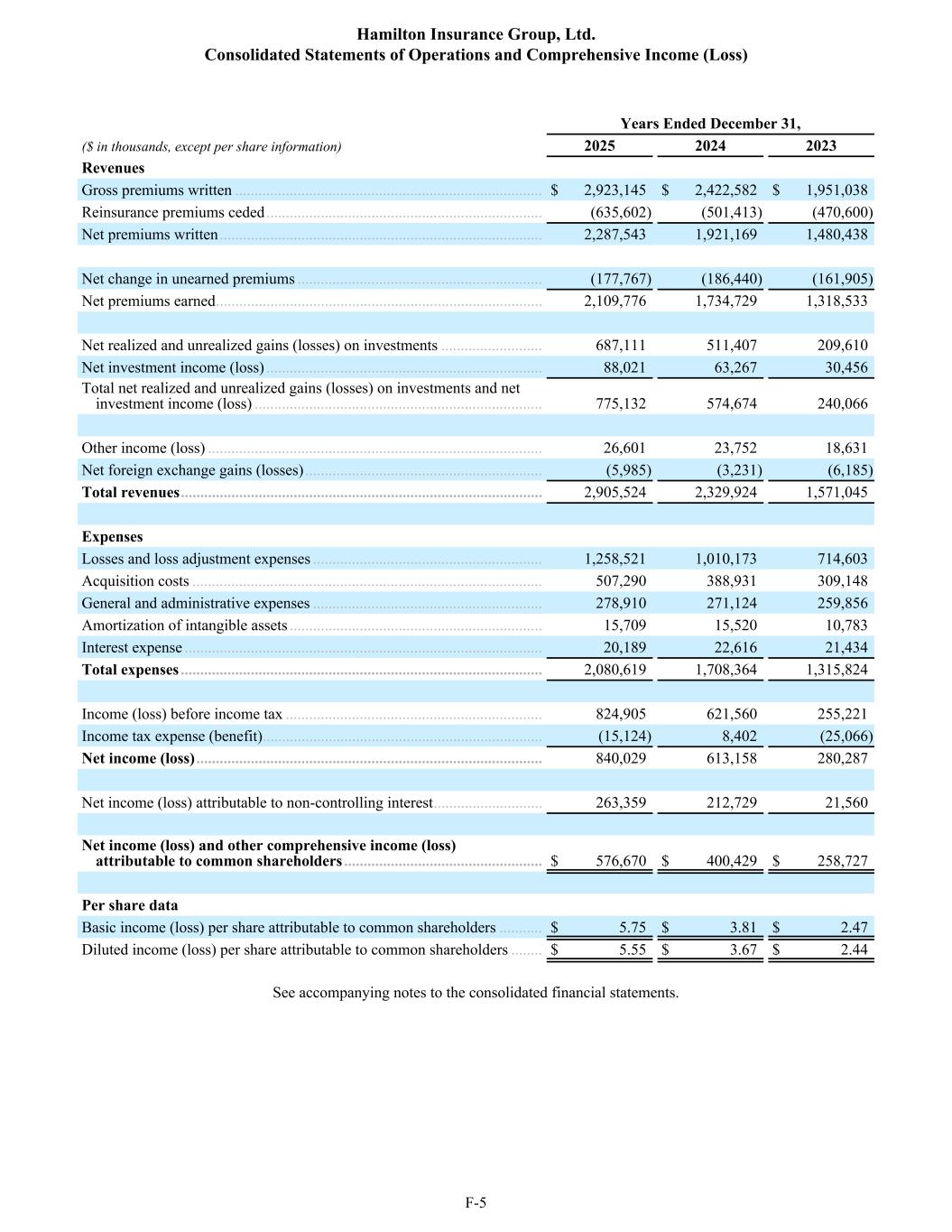 Years Ended December 31, ($ in thousands, except per share information) 2025 2024 2023 Revenues Gross premiums written ............................................................................... $ 2,923,145 $ 2,422,582 $ 1,951,038 Reinsurance premiums ceded ....................................................................... (635,602) (501,413) (470,600) Net premiums written ................................................................................... 2,287,543 1,921,169 1,480,438 Net change in unearned premiums ............................................................... (177,767) (186,440) (161,905) Net premiums earned .................................................................................... 2,109,776 1,734,729 1,318,533 Net realized and unrealized gains (losses) on investments .......................... 687,111 511,407 209,610 Net investment income (loss) ....................................................................... 88,021 63,267 30,456 Total net realized and unrealized gains (losses) on investments and net investment income (loss) .......................................................................... 775,132 574,674 240,066 Other income (loss) ...................................................................................... 26,601 23,752 18,631 Net foreign exchange gains (losses) ............................................................. (5,985) (3,231) (6,185) Total revenues ............................................................................................. 2,905,524 2,329,924 1,571,045 Expenses Losses and loss adjustment expenses ........................................................... 1,258,521 1,010,173 714,603 Acquisition costs .......................................................................................... 507,290 388,931 309,148 General and administrative expenses ........................................................... 278,910 271,124 259,856 Amortization of intangible assets ................................................................. 15,709 15,520 10,783 Interest expense ............................................................................................ 20,189 22,616 21,434 Total expenses ............................................................................................. 2,080,619 1,708,364 1,315,824 Income (loss) before income tax .................................................................. 824,905 621,560 255,221 Income tax expense (benefit) ........................................................................ (15,124) 8,402 (25,066) Net income (loss) ......................................................................................... 840,029 613,158 280,287 Net income (loss) attributable to non-controlling interest ............................ 263,359 212,729 21,560 Net income (loss) and other comprehensive income (loss) attributable to common shareholders ................................................... $ 576,670 $ 400,429 $ 258,727 Per share data Basic income (loss) per share attributable to common shareholders ........... $ 5.75 $ 3.81 $ 2.47 Diluted income (loss) per share attributable to common shareholders ........ $ 5.55 $ 3.67 $ 2.44 See accompanying notes to the consolidated financial statements. Hamilton Insurance Group, Ltd. Consolidated Statements of Operations and Comprehensive Income (Loss) F-5