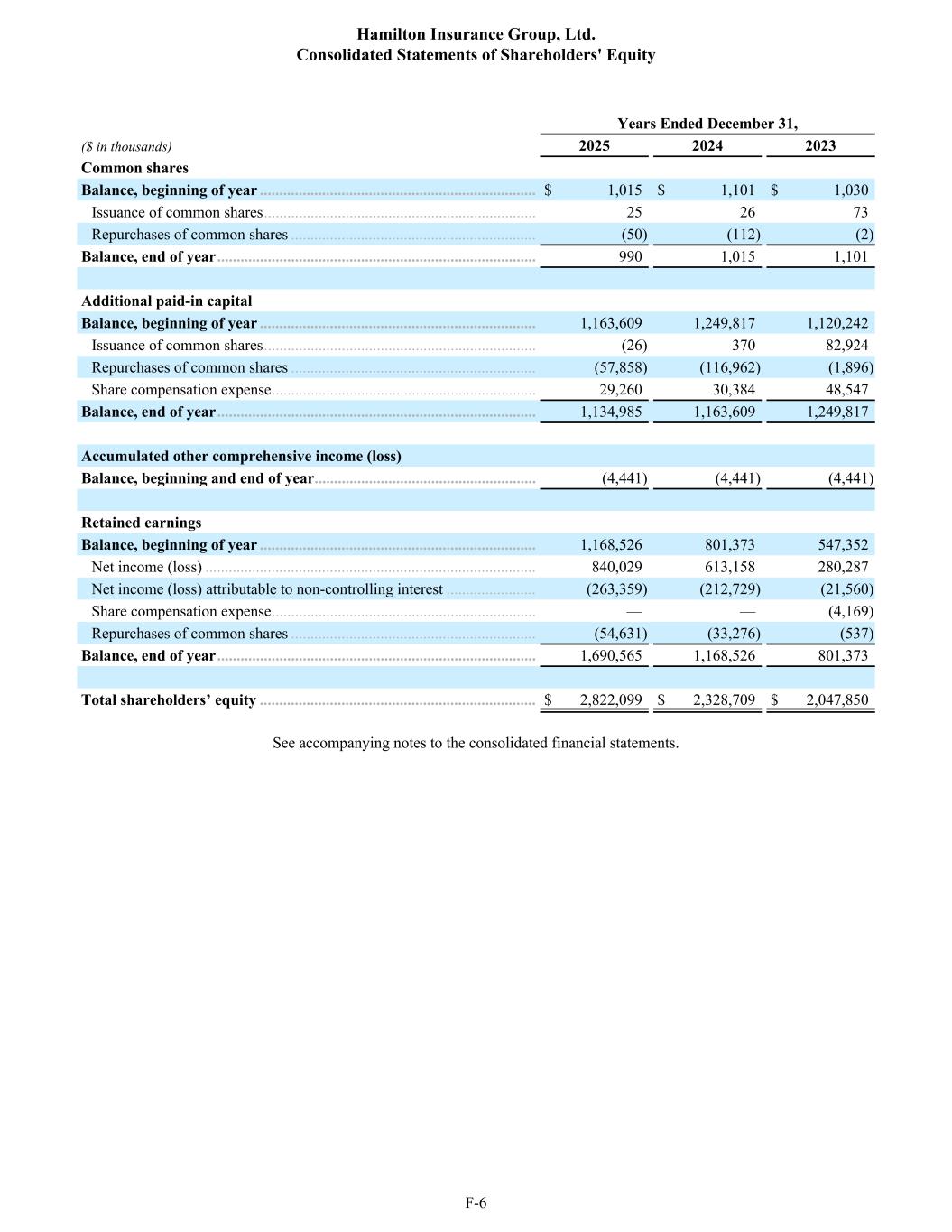 Years Ended December 31, ($ in thousands) 2025 2024 2023 Common shares Balance, beginning of year ....................................................................... $ 1,015 $ 1,101 $ 1,030 Issuance of common shares ...................................................................... 25 26 73 Repurchases of common shares ............................................................... (50) (112) (2) Balance, end of year .................................................................................. 990 1,015 1,101 Additional paid-in capital Balance, beginning of year ....................................................................... 1,163,609 1,249,817 1,120,242 Issuance of common shares ...................................................................... (26) 370 82,924 Repurchases of common shares ............................................................... (57,858) (116,962) (1,896) Share compensation expense .................................................................... 29,260 30,384 48,547 Balance, end of year .................................................................................. 1,134,985 1,163,609 1,249,817 Accumulated other comprehensive income (loss) Balance, beginning and end of year ......................................................... (4,441) (4,441) (4,441) Retained earnings Balance, beginning of year ....................................................................... 1,168,526 801,373 547,352 Net income (loss) ..................................................................................... 840,029 613,158 280,287 Net income (loss) attributable to non-controlling interest ....................... (263,359) (212,729) (21,560) Share compensation expense .................................................................... — — (4,169) Repurchases of common shares ............................................................... (54,631) (33,276) (537) Balance, end of year .................................................................................. 1,690,565 1,168,526 801,373 Total shareholders’ equity ....................................................................... $ 2,822,099 $ 2,328,709 $ 2,047,850 See accompanying notes to the consolidated financial statements. Hamilton Insurance Group, Ltd. Consolidated Statements of Shareholders' Equity F-6