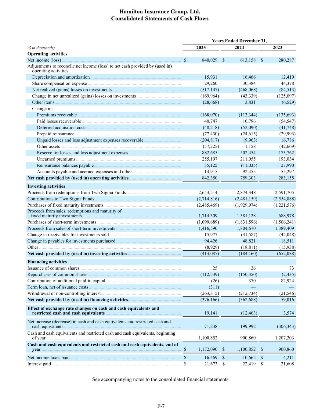 Years Ended December 31, ($ in thousands) 2025 2024 2023 Operating activities Net income (loss) ..................................................................................................... $ 840,029 $ 613,158 $ 280,287 Adjustments to reconcile net income (loss) to net cash provided by (used in) operating activities: Depreciation and amortization ............................................................................. 15,931 16,466 12,410 Share compensation expense ............................................................................... 29,260 30,384 44,378 Net realized (gains) losses on investments ......................................................... (517,147) (468,068) (84,513) Change in net unrealized (gains) losses on investments ...................................... (169,964) (43,339) (125,097) Other items ........................................................................................................... (28,668) 3,831 (6,529) Change in: Premiums receivable ........................................................................................ (168,070) (113,344) (135,693) Paid losses recoverable .................................................................................... 40,747 10,796 (54,547) Deferred acquisition costs ................................................................................ (48,218) (52,090) (41,748) Prepaid reinsurance .......................................................................................... (77,430) (24,615) (29,993) Unpaid losses and loss adjustment expenses recoverable ................................ (204,817) (9,963) 16,786 Other assets ...................................................................................................... (57,225) 1,158 (42,669) Reserve for losses and loss adjustment expenses ............................................ 882,685 502,454 173,762 Unearned premiums ......................................................................................... 255,197 211,055 193,034 Reinsurance balances payable .......................................................................... 35,125 (11,035) 27,990 Accounts payable and accrued expenses and other ......................................... 14,915 92,455 55,297 Net cash provided by (used in) operating activities ............................................ 842,350 759,303 283,155 Investing activities Proceeds from redemptions from Two Sigma Funds .............................................. 2,653,514 2,874,348 2,591,705 Contributions to Two Sigma Funds ......................................................................... (2,714,816) (2,481,159) (2,554,888) Purchases of fixed maturity investments ................................................................. (2,485,469) (1,929,974) (1,221,576) Proceeds from sales, redemptions and maturity of fixed maturity investments .................................................................................... 1,714,309 1,381,128 688,978 Purchases of short-term investments ....................................................................... (1,099,689) (1,831,596) (1,506,241) Proceeds from sales of short-term investments ....................................................... 1,416,590 1,804,670 1,389,409 Change in receivables for investments sold ............................................................. 15,977 (31,587) (42,048) Change in payables for investments purchased ....................................................... 94,426 48,821 18,511 Other ........................................................................................................................ (8,929) (18,811) (15,938) Net cash provided by (used in) investing activities ............................................. (414,087) (184,160) (652,088) Financing activities Issuance of common shares ..................................................................................... 25 26 73 Repurchases of common shares ............................................................................... (112,539) (150,350) (2,435) Contribution of additional paid-in capital ................................................................ (26) 370 82,924 Term loan, net of issuance costs .............................................................................. (311) — — Withdrawal of non-controlling interest .................................................................... (263,315) (212,734) (21,546) Net cash provided by (used in) financing activities ............................................. (376,166) (362,688) 59,016 Effect of exchange rate changes on cash and cash equivalents and restricted cash and cash equivalents ................................................................ 19,141 (12,463) 3,574 Net increase (decrease) in cash and cash equivalents and restricted cash and cash equivalents ................................................................................................... 71,238 199,992 (306,343) Cash and cash equivalents and restricted cash and cash equivalents, beginning of year .................................................................................................................. 1,100,852 900,860 1,207,203 Cash and cash equivalents and restricted cash and cash equivalents, end of year ...................................................................................................................... $ 1,172,090 $ 1,100,852 $ 900,860 Net income taxes paid .............................................................................................. $ 16,469 $ 10,662 $ 4,211 Interest paid .............................................................................................................. $ 21,673 $ 22,419 $ 21,608 See accompanying notes to the consolidated financial statements. Hamilton Insurance Group, Ltd. Consolidated Statements of Cash Flows F-7