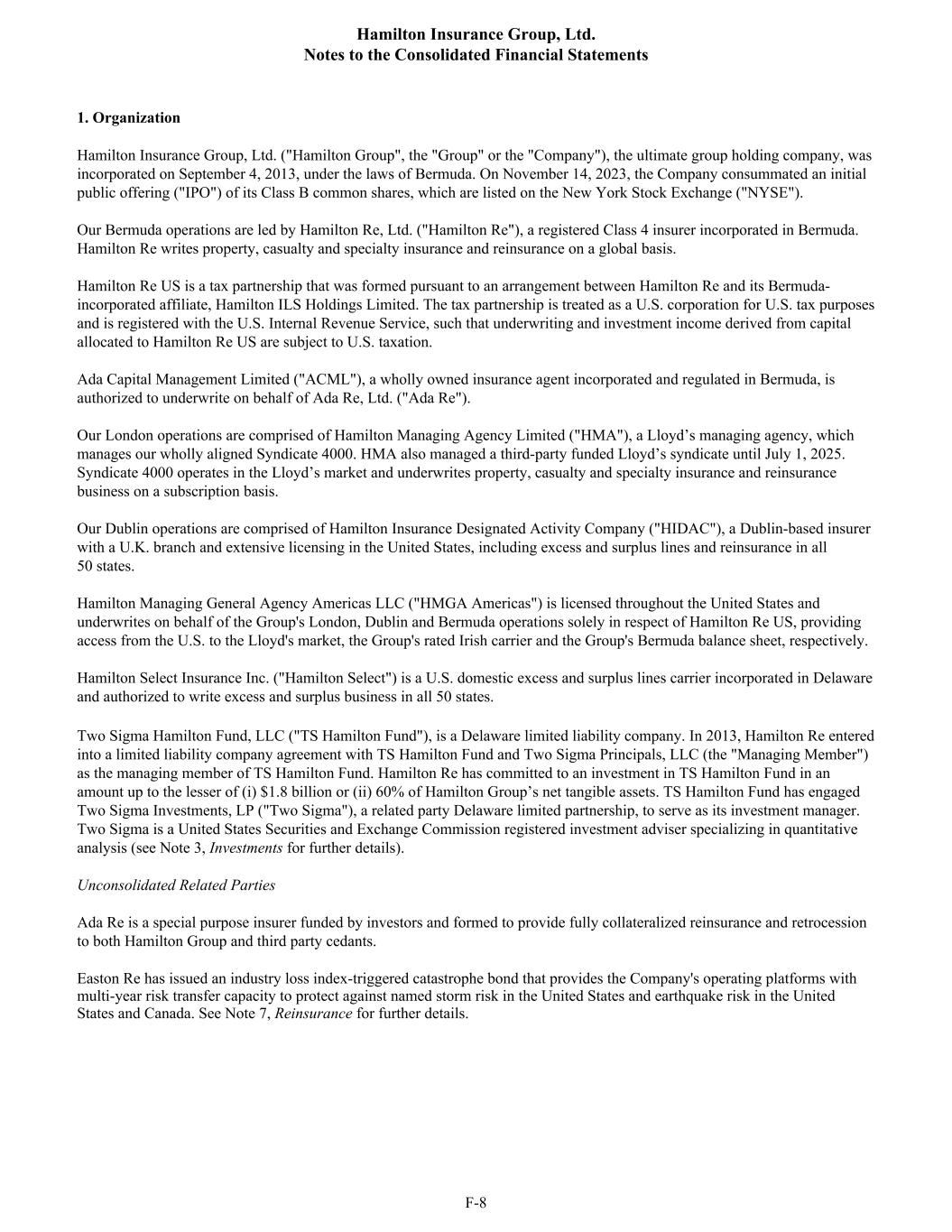 1. Organization Hamilton Insurance Group, Ltd. ("Hamilton Group", the "Group" or the "Company"), the ultimate group holding company, was incorporated on September 4, 2013, under the laws of Bermuda. On November 14, 2023, the Company consummated an initial public offering ("IPO") of its Class B common shares, which are listed on the New York Stock Exchange ("NYSE"). Our Bermuda operations are led by Hamilton Re, Ltd. ("Hamilton Re"), a registered Class 4 insurer incorporated in Bermuda. Hamilton Re writes property, casualty and specialty insurance and reinsurance on a global basis. Hamilton Re US is a tax partnership that was formed pursuant to an arrangement between Hamilton Re and its Bermuda- incorporated affiliate, Hamilton ILS Holdings Limited. The tax partnership is treated as a U.S. corporation for U.S. tax purposes and is registered with the U.S. Internal Revenue Service, such that underwriting and investment income derived from capital allocated to Hamilton Re US are subject to U.S. taxation. Ada Capital Management Limited ("ACML"), a wholly owned insurance agent incorporated and regulated in Bermuda, is authorized to underwrite on behalf of Ada Re, Ltd. ("Ada Re"). Our London operations are comprised of Hamilton Managing Agency Limited ("HMA"), a Lloyd’s managing agency, which manages our wholly aligned Syndicate 4000. HMA also managed a third-party funded Lloyd’s syndicate until July 1, 2025. Syndicate 4000 operates in the Lloyd’s market and underwrites property, casualty and specialty insurance and reinsurance business on a subscription basis. Our Dublin operations are comprised of Hamilton Insurance Designated Activity Company ("HIDAC"), a Dublin-based insurer with a U.K. branch and extensive licensing in the United States, including excess and surplus lines and reinsurance in all 50 states. Hamilton Managing General Agency Americas LLC ("HMGA Americas") is licensed throughout the United States and underwrites on behalf of the Group's London, Dublin and Bermuda operations solely in respect of Hamilton Re US, providing access from the U.S. to the Lloyd's market, the Group's rated Irish carrier and the Group's Bermuda balance sheet, respectively. Hamilton Select Insurance Inc. ("Hamilton Select") is a U.S. domestic excess and surplus lines carrier incorporated in Delaware and authorized to write excess and surplus business in all 50 states. Two Sigma Hamilton Fund, LLC ("TS Hamilton Fund"), is a Delaware limited liability company. In 2013, Hamilton Re entered into a limited liability company agreement with TS Hamilton Fund and Two Sigma Principals, LLC (the "Managing Member") as the managing member of TS Hamilton Fund. Hamilton Re has committed to an investment in TS Hamilton Fund in an amount up to the lesser of (i) $1.8 billion or (ii) 60% of Hamilton Group’s net tangible assets. TS Hamilton Fund has engaged Two Sigma Investments, LP ("Two Sigma"), a related party Delaware limited partnership, to serve as its investment manager. Two Sigma is a United States Securities and Exchange Commission registered investment adviser specializing in quantitative analysis (see Note 3, Investments for further details). Unconsolidated Related Parties Ada Re is a special purpose insurer funded by investors and formed to provide fully collateralized reinsurance and retrocession to both Hamilton Group and third party cedants. Easton Re has issued an industry loss index-triggered catastrophe bond that provides the Company's operating platforms with multi-year risk transfer capacity to protect against named storm risk in the United States and earthquake risk in the United States and Canada. See Note 7, Reinsurance for further details. Hamilton Insurance Group, Ltd. Notes to the Consolidated Financial Statements F-8