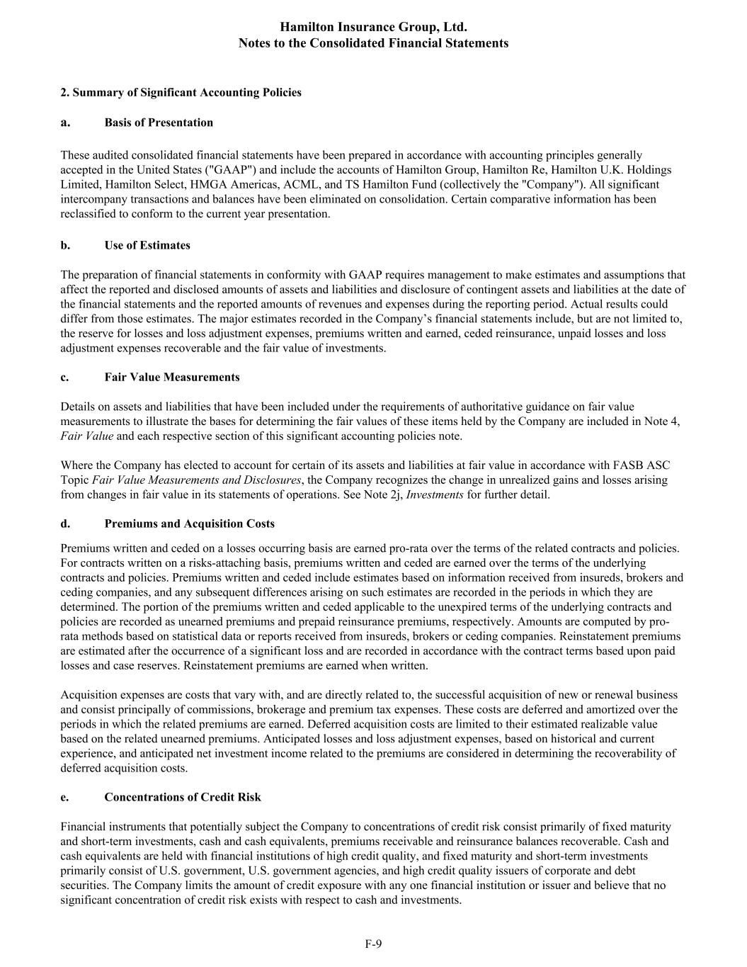 2. Summary of Significant Accounting Policies a. Basis of Presentation These audited consolidated financial statements have been prepared in accordance with accounting principles generally accepted in the United States ("GAAP") and include the accounts of Hamilton Group, Hamilton Re, Hamilton U.K. Holdings Limited, Hamilton Select, HMGA Americas, ACML, and TS Hamilton Fund (collectively the "Company"). All significant intercompany transactions and balances have been eliminated on consolidation. Certain comparative information has been reclassified to conform to the current year presentation. b. Use of Estimates The preparation of financial statements in conformity with GAAP requires management to make estimates and assumptions that affect the reported and disclosed amounts of assets and liabilities and disclosure of contingent assets and liabilities at the date of the financial statements and the reported amounts of revenues and expenses during the reporting period. Actual results could differ from those estimates. The major estimates recorded in the Company’s financial statements include, but are not limited to, the reserve for losses and loss adjustment expenses, premiums written and earned, ceded reinsurance, unpaid losses and loss adjustment expenses recoverable and the fair value of investments. c. Fair Value Measurements Details on assets and liabilities that have been included under the requirements of authoritative guidance on fair value measurements to illustrate the bases for determining the fair values of these items held by the Company are included in Note 4, Fair Value and each respective section of this significant accounting policies note. Where the Company has elected to account for certain of its assets and liabilities at fair value in accordance with FASB ASC Topic Fair Value Measurements and Disclosures, the Company recognizes the change in unrealized gains and losses arising from changes in fair value in its statements of operations. See Note 2j, Investments for further detail. d. Premiums and Acquisition Costs Premiums written and ceded on a losses occurring basis are earned pro-rata over the terms of the related contracts and policies. For contracts written on a risks-attaching basis, premiums written and ceded are earned over the terms of the underlying contracts and policies. Premiums written and ceded include estimates based on information received from insureds, brokers and ceding companies, and any subsequent differences arising on such estimates are recorded in the periods in which they are determined. The portion of the premiums written and ceded applicable to the unexpired terms of the underlying contracts and policies are recorded as unearned premiums and prepaid reinsurance premiums, respectively. Amounts are computed by pro- rata methods based on statistical data or reports received from insureds, brokers or ceding companies. Reinstatement premiums are estimated after the occurrence of a significant loss and are recorded in accordance with the contract terms based upon paid losses and case reserves. Reinstatement premiums are earned when written. Acquisition expenses are costs that vary with, and are directly related to, the successful acquisition of new or renewal business and consist principally of commissions, brokerage and premium tax expenses. These costs are deferred and amortized over the periods in which the related premiums are earned. Deferred acquisition costs are limited to their estimated realizable value based on the related unearned premiums. Anticipated losses and loss adjustment expenses, based on historical and current experience, and anticipated net investment income related to the premiums are considered in determining the recoverability of deferred acquisition costs. e. Concentrations of Credit Risk Financial instruments that potentially subject the Company to concentrations of credit risk consist primarily of fixed maturity and short-term investments, cash and cash equivalents, premiums receivable and reinsurance balances recoverable. Cash and cash equivalents are held with financial institutions of high credit quality, and fixed maturity and short-term investments primarily consist of U.S. government, U.S. government agencies, and high credit quality issuers of corporate and debt securities. The Company limits the amount of credit exposure with any one financial institution or issuer and believe that no significant concentration of credit risk exists with respect to cash and investments. Hamilton Insurance Group, Ltd. Notes to the Consolidated Financial Statements F-9