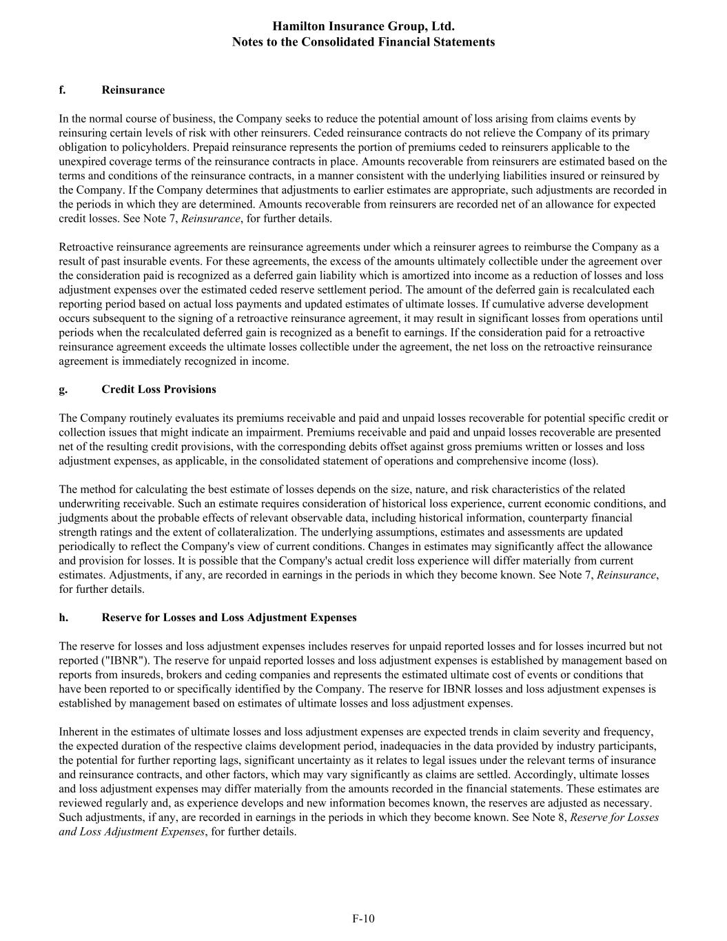 f. Reinsurance In the normal course of business, the Company seeks to reduce the potential amount of loss arising from claims events by reinsuring certain levels of risk with other reinsurers. Ceded reinsurance contracts do not relieve the Company of its primary obligation to policyholders. Prepaid reinsurance represents the portion of premiums ceded to reinsurers applicable to the unexpired coverage terms of the reinsurance contracts in place. Amounts recoverable from reinsurers are estimated based on the terms and conditions of the reinsurance contracts, in a manner consistent with the underlying liabilities insured or reinsured by the Company. If the Company determines that adjustments to earlier estimates are appropriate, such adjustments are recorded in the periods in which they are determined. Amounts recoverable from reinsurers are recorded net of an allowance for expected credit losses. See Note 7, Reinsurance, for further details. Retroactive reinsurance agreements are reinsurance agreements under which a reinsurer agrees to reimburse the Company as a result of past insurable events. For these agreements, the excess of the amounts ultimately collectible under the agreement over the consideration paid is recognized as a deferred gain liability which is amortized into income as a reduction of losses and loss adjustment expenses over the estimated ceded reserve settlement period. The amount of the deferred gain is recalculated each reporting period based on actual loss payments and updated estimates of ultimate losses. If cumulative adverse development occurs subsequent to the signing of a retroactive reinsurance agreement, it may result in significant losses from operations until periods when the recalculated deferred gain is recognized as a benefit to earnings. If the consideration paid for a retroactive reinsurance agreement exceeds the ultimate losses collectible under the agreement, the net loss on the retroactive reinsurance agreement is immediately recognized in income. g. Credit Loss Provisions The Company routinely evaluates its premiums receivable and paid and unpaid losses recoverable for potential specific credit or collection issues that might indicate an impairment. Premiums receivable and paid and unpaid losses recoverable are presented net of the resulting credit provisions, with the corresponding debits offset against gross premiums written or losses and loss adjustment expenses, as applicable, in the consolidated statement of operations and comprehensive income (loss). The method for calculating the best estimate of losses depends on the size, nature, and risk characteristics of the related underwriting receivable. Such an estimate requires consideration of historical loss experience, current economic conditions, and judgments about the probable effects of relevant observable data, including historical information, counterparty financial strength ratings and the extent of collateralization. The underlying assumptions, estimates and assessments are updated periodically to reflect the Company's view of current conditions. Changes in estimates may significantly affect the allowance and provision for losses. It is possible that the Company's actual credit loss experience will differ materially from current estimates. Adjustments, if any, are recorded in earnings in the periods in which they become known. See Note 7, Reinsurance, for further details. h. Reserve for Losses and Loss Adjustment Expenses The reserve for losses and loss adjustment expenses includes reserves for unpaid reported losses and for losses incurred but not reported ("IBNR"). The reserve for unpaid reported losses and loss adjustment expenses is established by management based on reports from insureds, brokers and ceding companies and represents the estimated ultimate cost of events or conditions that have been reported to or specifically identified by the Company. The reserve for IBNR losses and loss adjustment expenses is established by management based on estimates of ultimate losses and loss adjustment expenses. Inherent in the estimates of ultimate losses and loss adjustment expenses are expected trends in claim severity and frequency, the expected duration of the respective claims development period, inadequacies in the data provided by industry participants, the potential for further reporting lags, significant uncertainty as it relates to legal issues under the relevant terms of insurance and reinsurance contracts, and other factors, which may vary significantly as claims are settled. Accordingly, ultimate losses and loss adjustment expenses may differ materially from the amounts recorded in the financial statements. These estimates are reviewed regularly and, as experience develops and new information becomes known, the reserves are adjusted as necessary. Such adjustments, if any, are recorded in earnings in the periods in which they become known. See Note 8, Reserve for Losses and Loss Adjustment Expenses, for further details. Hamilton Insurance Group, Ltd. Notes to the Consolidated Financial Statements F-10