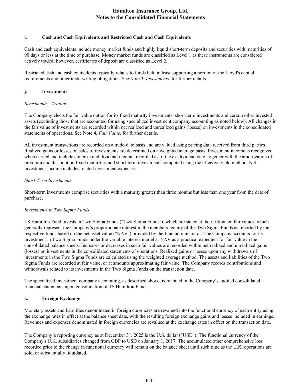 i. Cash and Cash Equivalents and Restricted Cash and Cash Equivalents Cash and cash equivalents include money market funds and highly liquid short-term deposits and securities with maturities of 90 days or less at the time of purchase. Money market funds are classified as Level 1 as these instruments are considered actively traded; however, certificates of deposit are classified as Level 2. Restricted cash and cash equivalents typically relates to funds held in trust supporting a portion of the Lloyd's capital requirements and other underwriting obligations. See Note 3, Investments, for further details. j. Investments Investments - Trading The Company elects the fair value option for its fixed maturity investments, short-term investments and certain other invested assets (excluding those that are accounted for using specialized investment company accounting as noted below). All changes in the fair value of investments are recorded within net realized and unrealized gains (losses) on investments in the consolidated statements of operations. See Note 4, Fair Value, for further details. All investment transactions are recorded on a trade-date basis and are valued using pricing data received from third parties. Realized gains or losses on sales of investments are determined on a weighted average basis. Investment income is recognized when earned and includes interest and dividend income, recorded as of the ex-dividend date, together with the amortization of premium and discount on fixed maturities and short-term investments computed using the effective yield method. Net investment income includes related investment expenses. Short-Term Investments Short-term investments comprise securities with a maturity greater than three months but less than one year from the date of purchase. Investments in Two Sigma Funds TS Hamilton Fund invests in Two Sigma Funds ("Two Sigma Funds"), which are stated at their estimated fair values, which generally represent the Company’s proportionate interest in the members’ equity of the Two Sigma Funds as reported by the respective funds based on the net asset value ("NAV") provided by the fund administrator. The Company accounts for its investment in Two Sigma Funds under the variable interest model at NAV as a practical expedient for fair value in the consolidated balance sheets. Increases or decreases in such fair values are recorded within net realized and unrealized gains (losses) on investments in the consolidated statements of operations. Realized gains or losses upon any withdrawals of investments in the Two Sigma Funds are calculated using the weighted average method. The assets and liabilities of the Two Sigma Funds are recorded at fair value, or at amounts approximating fair value. The Company records contributions and withdrawals related to its investments in the Two Sigma Funds on the transaction date. The specialized investment company accounting, as described above, is retained in the Company’s audited consolidated financial statements upon consolidation of TS Hamilton Fund. k. Foreign Exchange Monetary assets and liabilities denominated in foreign currencies are revalued into the functional currency of each entity using the exchange rates in effect at the balance sheet date, with the resulting foreign exchange gains and losses included in earnings. Revenues and expenses denominated in foreign currencies are revalued at the exchange rates in effect on the transaction date. The Company’s reporting currency as at December 31, 2025 is the U.S. dollar ("USD"). The functional currency of the Company's U.K. subsidiaries changed from GBP to USD on January 1, 2017. The accumulated other comprehensive loss recorded prior to the change in functional currency will remain on the balance sheet until such time as the U.K. operations are sold, or substantially liquidated. Hamilton Insurance Group, Ltd. Notes to the Consolidated Financial Statements F-11