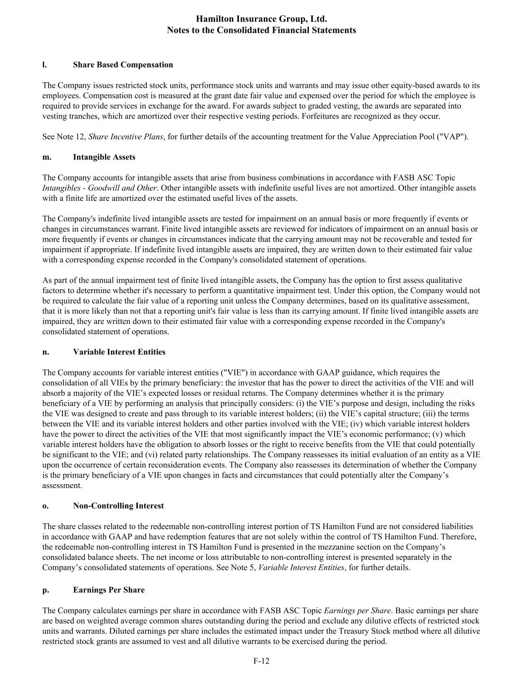 l. Share Based Compensation The Company issues restricted stock units, performance stock units and warrants and may issue other equity-based awards to its employees. Compensation cost is measured at the grant date fair value and expensed over the period for which the employee is required to provide services in exchange for the award. For awards subject to graded vesting, the awards are separated into vesting tranches, which are amortized over their respective vesting periods. Forfeitures are recognized as they occur. See Note 12, Share Incentive Plans, for further details of the accounting treatment for the Value Appreciation Pool ("VAP"). m. Intangible Assets The Company accounts for intangible assets that arise from business combinations in accordance with FASB ASC Topic Intangibles - Goodwill and Other. Other intangible assets with indefinite useful lives are not amortized. Other intangible assets with a finite life are amortized over the estimated useful lives of the assets. The Company's indefinite lived intangible assets are tested for impairment on an annual basis or more frequently if events or changes in circumstances warrant. Finite lived intangible assets are reviewed for indicators of impairment on an annual basis or more frequently if events or changes in circumstances indicate that the carrying amount may not be recoverable and tested for impairment if appropriate. If indefinite lived intangible assets are impaired, they are written down to their estimated fair value with a corresponding expense recorded in the Company's consolidated statement of operations. As part of the annual impairment test of finite lived intangible assets, the Company has the option to first assess qualitative factors to determine whether it's necessary to perform a quantitative impairment test. Under this option, the Company would not be required to calculate the fair value of a reporting unit unless the Company determines, based on its qualitative assessment, that it is more likely than not that a reporting unit's fair value is less than its carrying amount. If finite lived intangible assets are impaired, they are written down to their estimated fair value with a corresponding expense recorded in the Company's consolidated statement of operations. n. Variable Interest Entities The Company accounts for variable interest entities ("VIE") in accordance with GAAP guidance, which requires the consolidation of all VIEs by the primary beneficiary: the investor that has the power to direct the activities of the VIE and will absorb a majority of the VIE’s expected losses or residual returns. The Company determines whether it is the primary beneficiary of a VIE by performing an analysis that principally considers: (i) the VIE’s purpose and design, including the risks the VIE was designed to create and pass through to its variable interest holders; (ii) the VIE’s capital structure; (iii) the terms between the VIE and its variable interest holders and other parties involved with the VIE; (iv) which variable interest holders have the power to direct the activities of the VIE that most significantly impact the VIE’s economic performance; (v) which variable interest holders have the obligation to absorb losses or the right to receive benefits from the VIE that could potentially be significant to the VIE; and (vi) related party relationships. The Company reassesses its initial evaluation of an entity as a VIE upon the occurrence of certain reconsideration events. The Company also reassesses its determination of whether the Company is the primary beneficiary of a VIE upon changes in facts and circumstances that could potentially alter the Company’s assessment. o. Non-Controlling Interest The share classes related to the redeemable non-controlling interest portion of TS Hamilton Fund are not considered liabilities in accordance with GAAP and have redemption features that are not solely within the control of TS Hamilton Fund. Therefore, the redeemable non-controlling interest in TS Hamilton Fund is presented in the mezzanine section on the Company’s consolidated balance sheets. The net income or loss attributable to non-controlling interest is presented separately in the Company’s consolidated statements of operations. See Note 5, Variable Interest Entities, for further details. p. Earnings Per Share The Company calculates earnings per share in accordance with FASB ASC Topic Earnings per Share. Basic earnings per share are based on weighted average common shares outstanding during the period and exclude any dilutive effects of restricted stock units and warrants. Diluted earnings per share includes the estimated impact under the Treasury Stock method where all dilutive restricted stock grants are assumed to vest and all dilutive warrants to be exercised during the period. Hamilton Insurance Group, Ltd. Notes to the Consolidated Financial Statements F-12