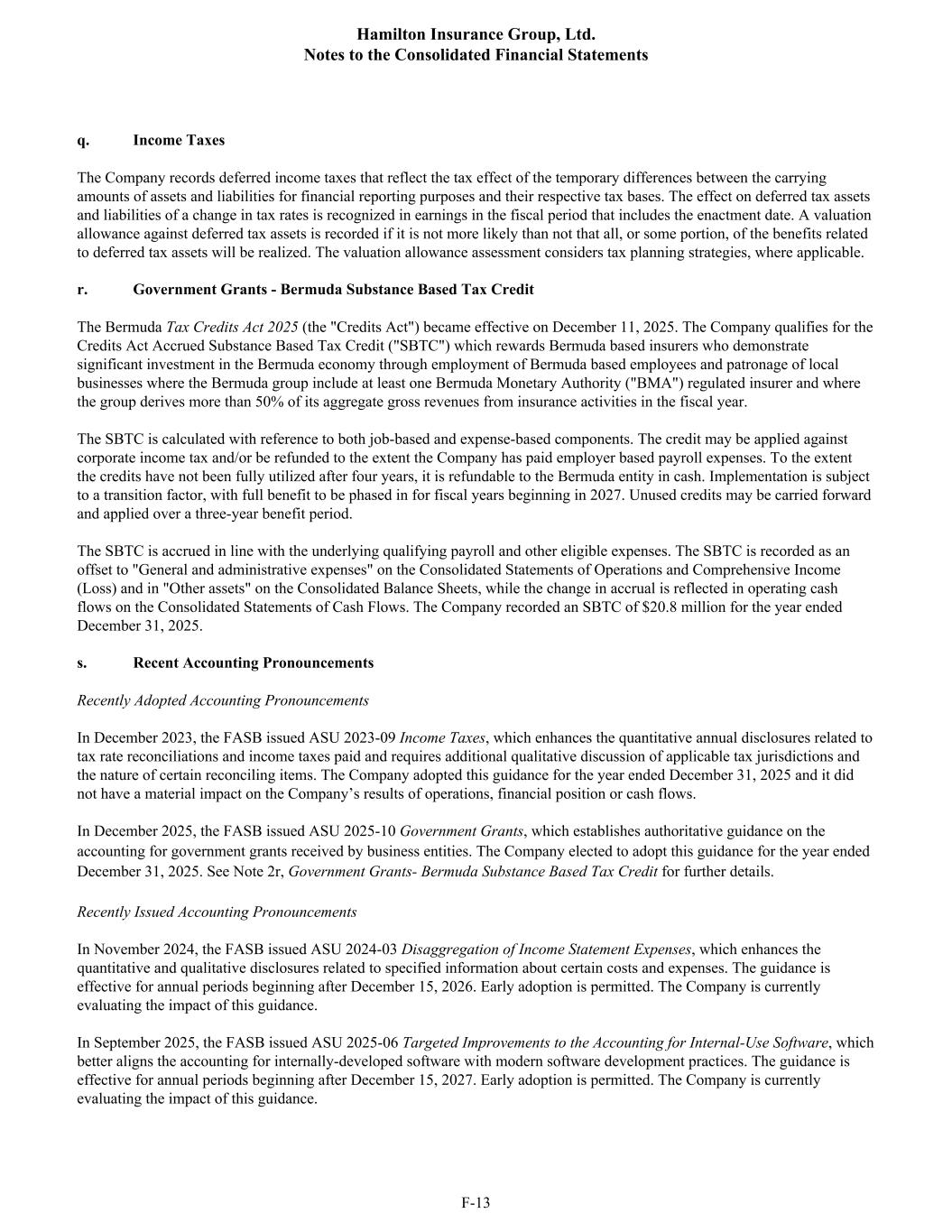 q. Income Taxes The Company records deferred income taxes that reflect the tax effect of the temporary differences between the carrying amounts of assets and liabilities for financial reporting purposes and their respective tax bases. The effect on deferred tax assets and liabilities of a change in tax rates is recognized in earnings in the fiscal period that includes the enactment date. A valuation allowance against deferred tax assets is recorded if it is not more likely than not that all, or some portion, of the benefits related to deferred tax assets will be realized. The valuation allowance assessment considers tax planning strategies, where applicable. r. Government Grants - Bermuda Substance Based Tax Credit The Bermuda Tax Credits Act 2025 (the "Credits Act") became effective on December 11, 2025. The Company qualifies for the Credits Act Accrued Substance Based Tax Credit ("SBTC") which rewards Bermuda based insurers who demonstrate significant investment in the Bermuda economy through employment of Bermuda based employees and patronage of local businesses where the Bermuda group include at least one Bermuda Monetary Authority ("BMA") regulated insurer and where the group derives more than 50% of its aggregate gross revenues from insurance activities in the fiscal year. The SBTC is calculated with reference to both job-based and expense-based components. The credit may be applied against corporate income tax and/or be refunded to the extent the Company has paid employer based payroll expenses. To the extent the credits have not been fully utilized after four years, it is refundable to the Bermuda entity in cash. Implementation is subject to a transition factor, with full benefit to be phased in for fiscal years beginning in 2027. Unused credits may be carried forward and applied over a three-year benefit period. The SBTC is accrued in line with the underlying qualifying payroll and other eligible expenses. The SBTC is recorded as an offset to "General and administrative expenses" on the Consolidated Statements of Operations and Comprehensive Income (Loss) and in "Other assets" on the Consolidated Balance Sheets, while the change in accrual is reflected in operating cash flows on the Consolidated Statements of Cash Flows. The Company recorded an SBTC of $20.8 million for the year ended December 31, 2025. s. Recent Accounting Pronouncements Recently Adopted Accounting Pronouncements In December 2023, the FASB issued ASU 2023-09 Income Taxes, which enhances the quantitative annual disclosures related to tax rate reconciliations and income taxes paid and requires additional qualitative discussion of applicable tax jurisdictions and the nature of certain reconciling items. The Company adopted this guidance for the year ended December 31, 2025 and it did not have a material impact on the Company’s results of operations, financial position or cash flows. In December 2025, the FASB issued ASU 2025-10 Government Grants, which establishes authoritative guidance on the accounting for government grants received by business entities. The Company elected to adopt this guidance for the year ended December 31, 2025. See Note 2r, Government Grants- Bermuda Substance Based Tax Credit for further details. Recently Issued Accounting Pronouncements In November 2024, the FASB issued ASU 2024-03 Disaggregation of Income Statement Expenses, which enhances the quantitative and qualitative disclosures related to specified information about certain costs and expenses. The guidance is effective for annual periods beginning after December 15, 2026. Early adoption is permitted. The Company is currently evaluating the impact of this guidance. In September 2025, the FASB issued ASU 2025-06 Targeted Improvements to the Accounting for Internal-Use Software, which better aligns the accounting for internally-developed software with modern software development practices. The guidance is effective for annual periods beginning after December 15, 2027. Early adoption is permitted. The Company is currently evaluating the impact of this guidance. Hamilton Insurance Group, Ltd. Notes to the Consolidated Financial Statements F-13