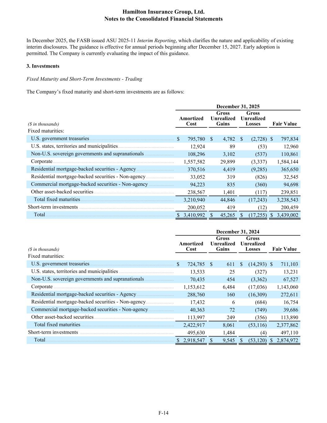 In December 2025, the FASB issued ASU 2025-11 Interim Reporting, which clarifies the nature and applicability of existing interim disclosures. The guidance is effective for annual periods beginning after December 15, 2027. Early adoption is permitted. The Company is currently evaluating the impact of this guidance. 3. Investments Fixed Maturity and Short-Term Investments - Trading The Company’s fixed maturity and short-term investments are as follows: December 31, 2025 ($ in thousands) Amortized Cost Gross Unrealized Gains Gross Unrealized Losses Fair Value Fixed maturities: U.S. government treasuries ............................................................... $ 795,780 $ 4,782 $ (2,728) $ 797,834 U.S. states, territories and municipalities .......................................... 12,924 89 (53) 12,960 Non-U.S. sovereign governments and supranationals ...................... 108,296 3,102 (537) 110,861 Corporate ........................................................................................... 1,557,582 29,899 (3,337) 1,584,144 Residential mortgage-backed securities - Agency ............................ 370,516 4,419 (9,285) 365,650 Residential mortgage-backed securities - Non-agency ..................... 33,052 319 (826) 32,545 Commercial mortgage-backed securities - Non-agency ................... 94,223 835 (360) 94,698 Other asset-backed securities ............................................................ 238,567 1,401 (117) 239,851 Total fixed maturities ...................................................................... 3,210,940 44,846 (17,243) 3,238,543 Short-term investments ....................................................................... 200,052 419 (12) 200,459 Total ................................................................................................ $ 3,410,992 $ 45,265 $ (17,255) $ 3,439,002 December 31, 2024 ($ in thousands) Amortized Cost Gross Unrealized Gains Gross Unrealized Losses Fair Value Fixed maturities: U.S. government treasuries ............................................................... $ 724,785 $ 611 $ (14,293) $ 711,103 U.S. states, territories and municipalities ......................................... 13,533 25 (327) 13,231 Non-U.S. sovereign governments and supranationals ...................... 70,435 454 (3,362) 67,527 Corporate .......................................................................................... 1,153,612 6,484 (17,036) 1,143,060 Residential mortgage-backed securities - Agency ............................ 288,760 160 (16,309) 272,611 Residential mortgage-backed securities - Non-agency ..................... 17,432 6 (684) 16,754 Commercial mortgage-backed securities - Non-agency ................... 40,363 72 (749) 39,686 Other asset-backed securities ............................................................ 113,997 249 (356) 113,890 Total fixed maturities ...................................................................... 2,422,917 8,061 (53,116) 2,377,862 Short-term investments ...................................................................... 495,630 1,484 (4) 497,110 Total ................................................................................................ $ 2,918,547 $ 9,545 $ (53,120) $ 2,874,972 Hamilton Insurance Group, Ltd. Notes to the Consolidated Financial Statements F-14