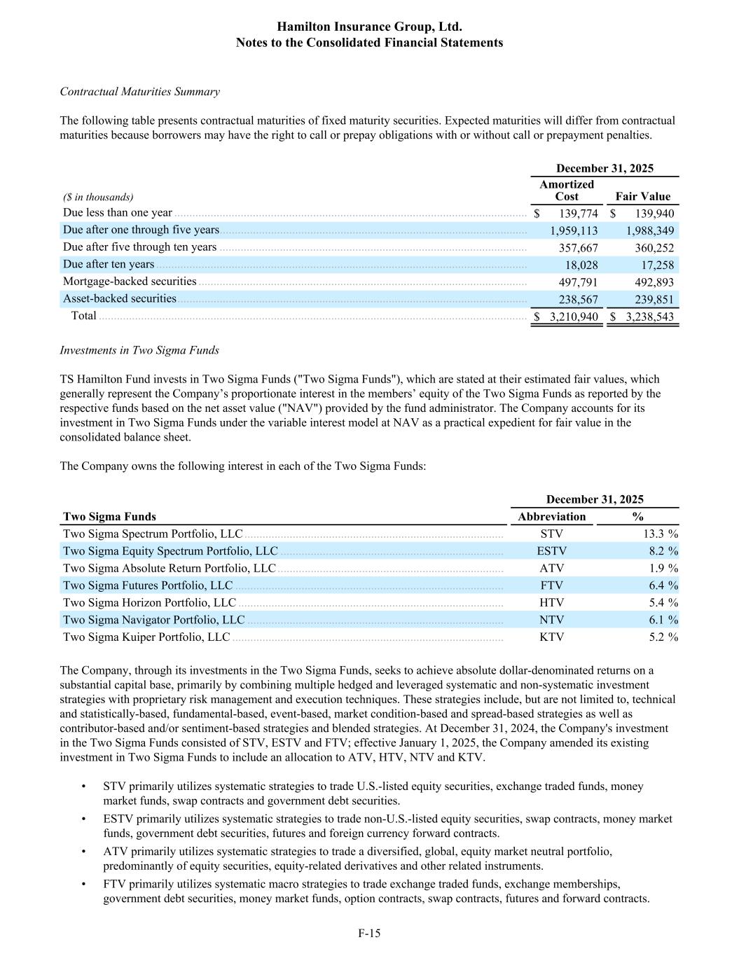 Contractual Maturities Summary The following table presents contractual maturities of fixed maturity securities. Expected maturities will differ from contractual maturities because borrowers may have the right to call or prepay obligations with or without call or prepayment penalties. December 31, 2025 ($ in thousands) Amortized Cost Fair Value Due less than one year ..................................................................................................................... $ 139,774 $ 139,940 Due after one through five years ...................................................................................................... 1,959,113 1,988,349 Due after five through ten years ...................................................................................................... 357,667 360,252 Due after ten years ........................................................................................................................... 18,028 17,258 Mortgage-backed securities ............................................................................................................. 497,791 492,893 Asset-backed securities .................................................................................................................... 238,567 239,851 Total .............................................................................................................................................. $ 3,210,940 $ 3,238,543 Investments in Two Sigma Funds TS Hamilton Fund invests in Two Sigma Funds ("Two Sigma Funds"), which are stated at their estimated fair values, which generally represent the Company’s proportionate interest in the members’ equity of the Two Sigma Funds as reported by the respective funds based on the net asset value ("NAV") provided by the fund administrator. The Company accounts for its investment in Two Sigma Funds under the variable interest model at NAV as a practical expedient for fair value in the consolidated balance sheet. The Company owns the following interest in each of the Two Sigma Funds: December 31, 2025 Two Sigma Funds Abbreviation % Two Sigma Spectrum Portfolio, LLC ...................................................................................... STV 13.3 % Two Sigma Equity Spectrum Portfolio, LLC .......................................................................... ESTV 8.2 % Two Sigma Absolute Return Portfolio, LLC ........................................................................... ATV 1.9 % Two Sigma Futures Portfolio, LLC ......................................................................................... FTV 6.4 % Two Sigma Horizon Portfolio, LLC ........................................................................................ HTV 5.4 % Two Sigma Navigator Portfolio, LLC ..................................................................................... NTV 6.1 % Two Sigma Kuiper Portfolio, LLC .......................................................................................... KTV 5.2 % The Company, through its investments in the Two Sigma Funds, seeks to achieve absolute dollar-denominated returns on a substantial capital base, primarily by combining multiple hedged and leveraged systematic and non-systematic investment strategies with proprietary risk management and execution techniques. These strategies include, but are not limited to, technical and statistically-based, fundamental-based, event-based, market condition-based and spread-based strategies as well as contributor-based and/or sentiment-based strategies and blended strategies. At December 31, 2024, the Company's investment in the Two Sigma Funds consisted of STV, ESTV and FTV; effective January 1, 2025, the Company amended its existing investment in Two Sigma Funds to include an allocation to ATV, HTV, NTV and KTV. • STV primarily utilizes systematic strategies to trade U.S.-listed equity securities, exchange traded funds, money market funds, swap contracts and government debt securities. • ESTV primarily utilizes systematic strategies to trade non-U.S.-listed equity securities, swap contracts, money market funds, government debt securities, futures and foreign currency forward contracts. • ATV primarily utilizes systematic strategies to trade a diversified, global, equity market neutral portfolio, predominantly of equity securities, equity-related derivatives and other related instruments. • FTV primarily utilizes systematic macro strategies to trade exchange traded funds, exchange memberships, government debt securities, money market funds, option contracts, swap contracts, futures and forward contracts. Hamilton Insurance Group, Ltd. Notes to the Consolidated Financial Statements F-15